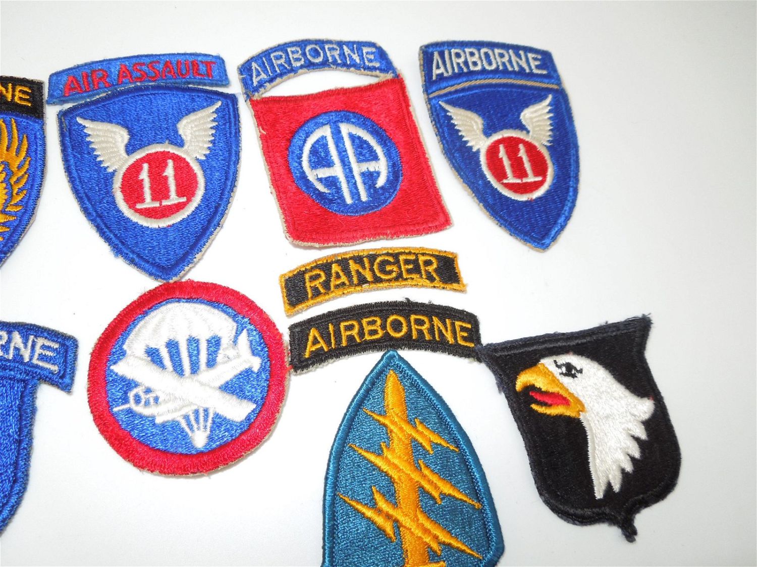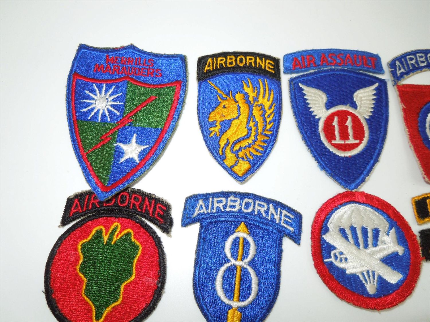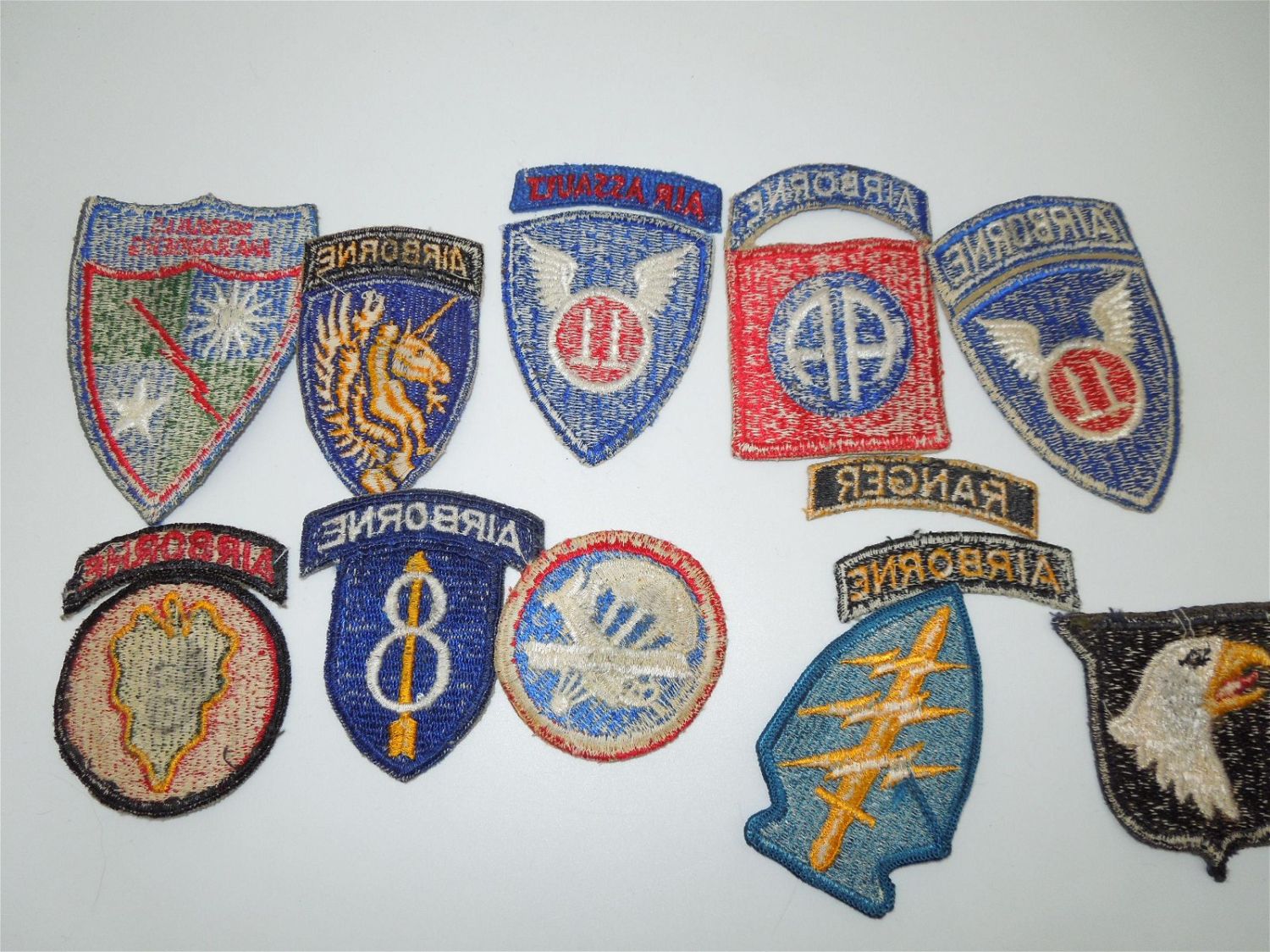 Lot of WWII – Korean War era US Army patches to include Airborne units. The 8th and 24th patches are one piece Airborne variations. These are period cut edge (one SF merrowed edge) patches in fair to good condition.
