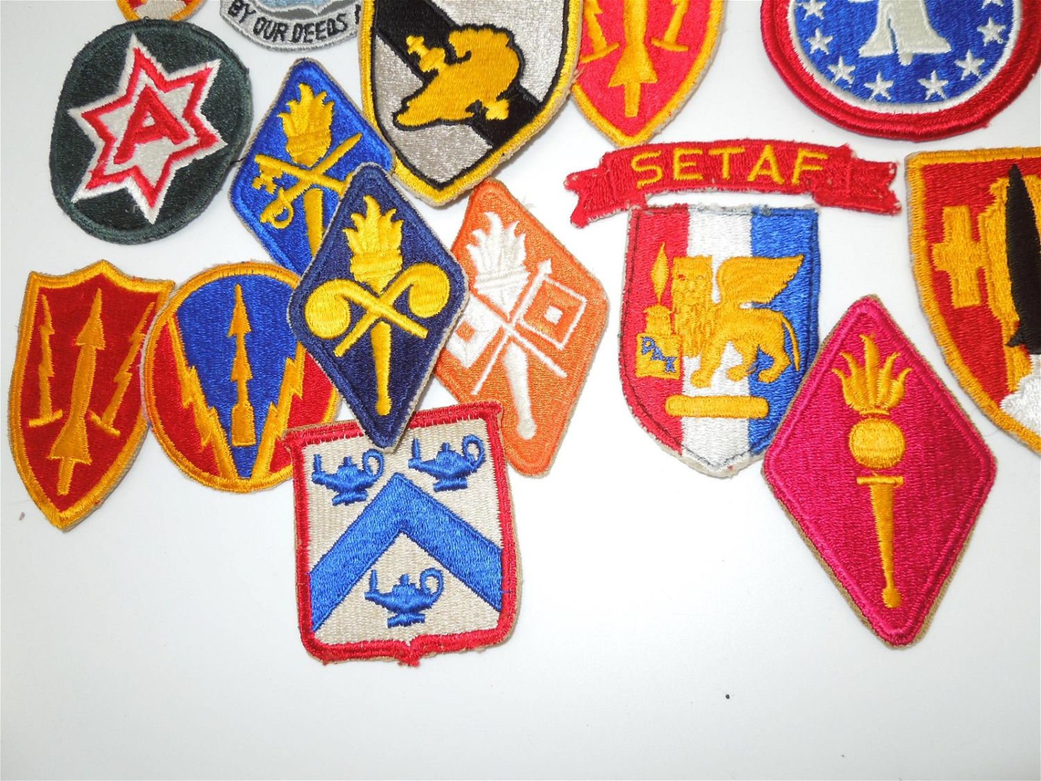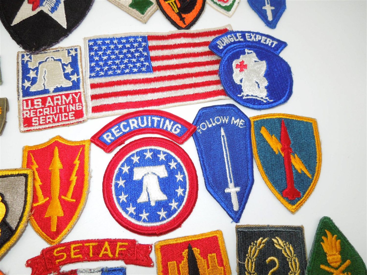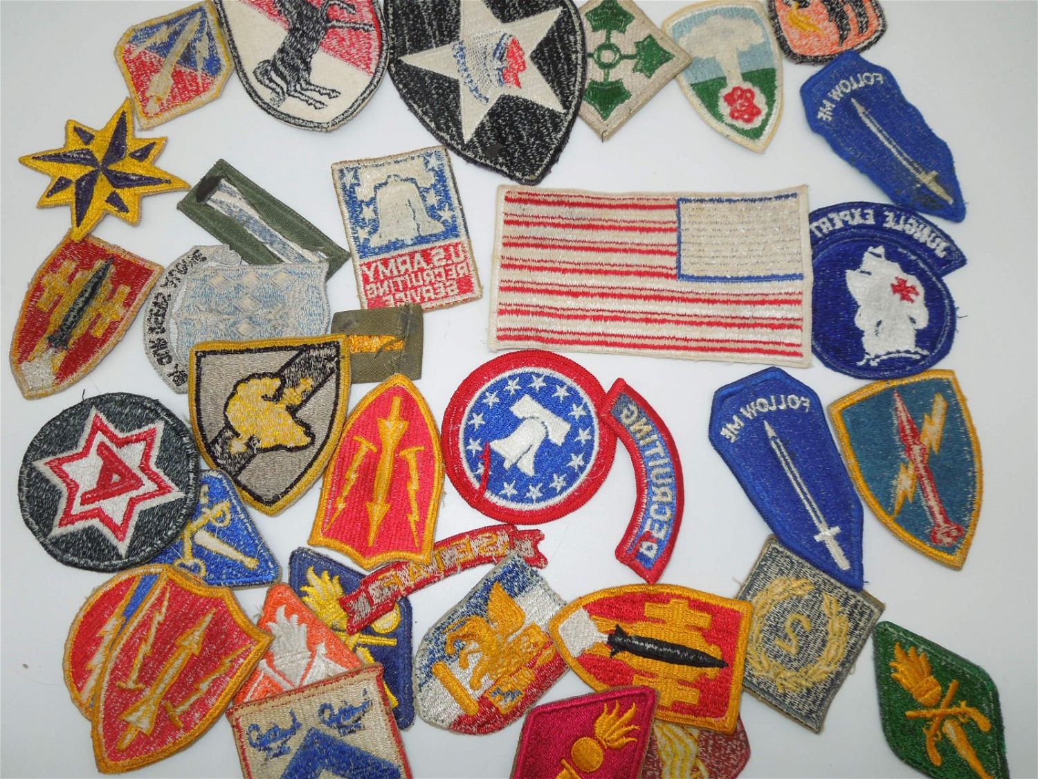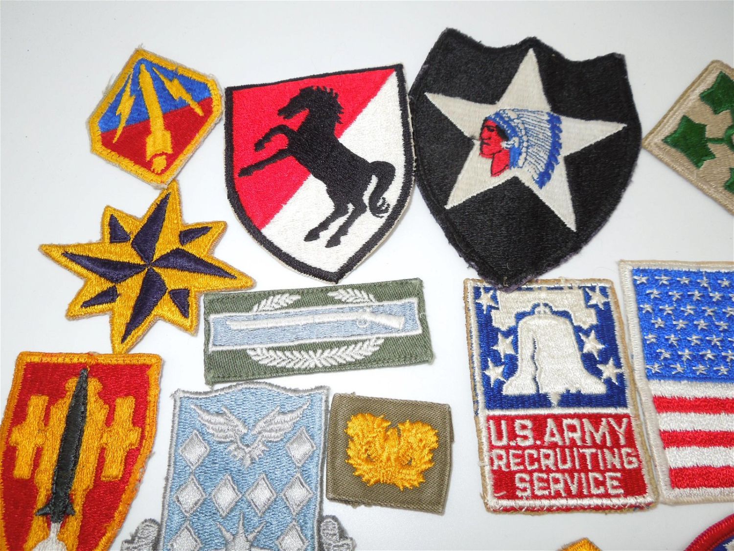 Large lot of Vietnam era, 1960s or 1970s era US Army patches to include cavalry, infantry, schools, US Flag patch, commands, and more. These are period patches in fair to good condition.