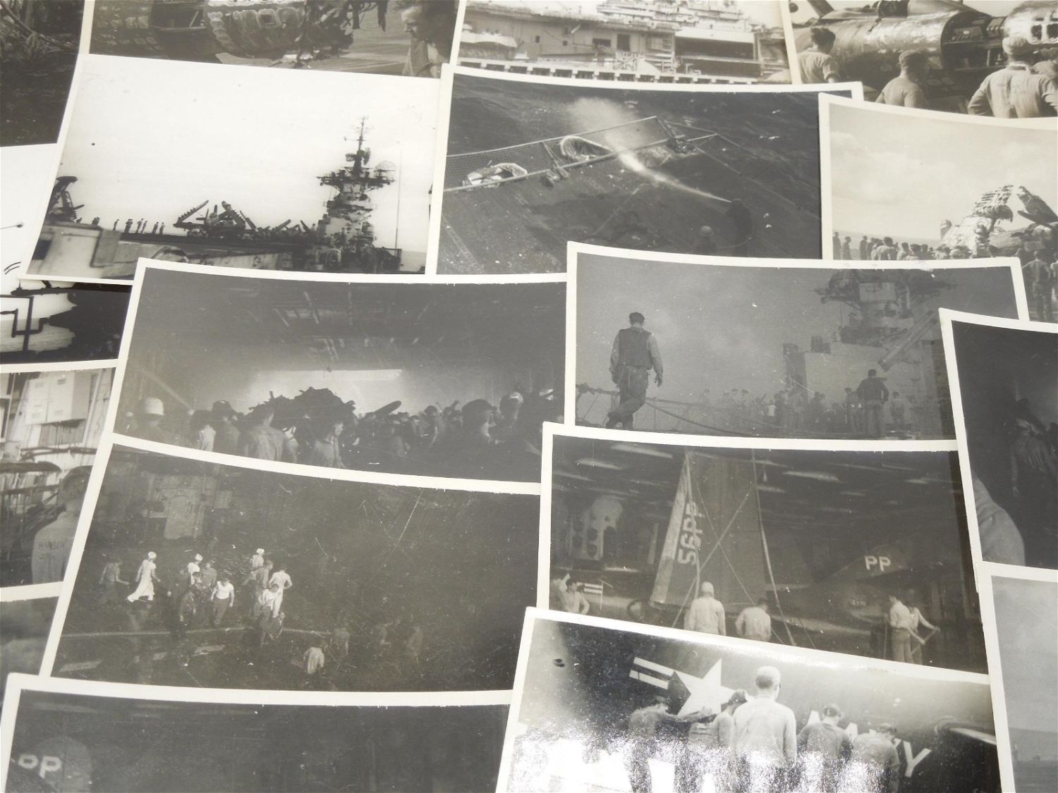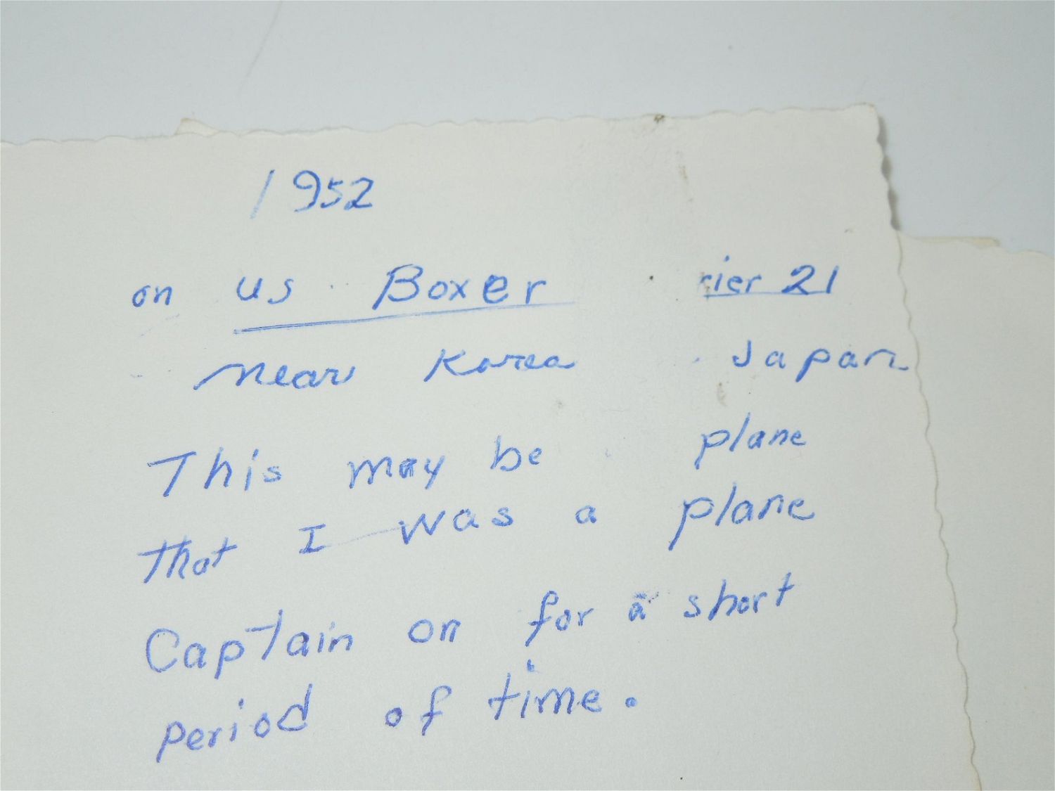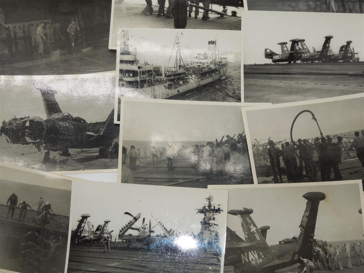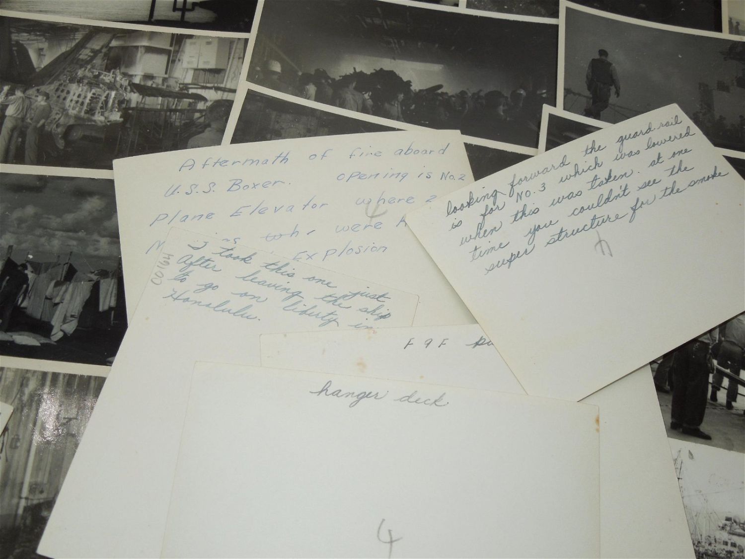 Grouping of original USN Nancy photos from the 1952 fire onboard the Carrier USS Boxer in the Korean War depicting damaged aircraft and more. Many have handwritten captions on the reverse.