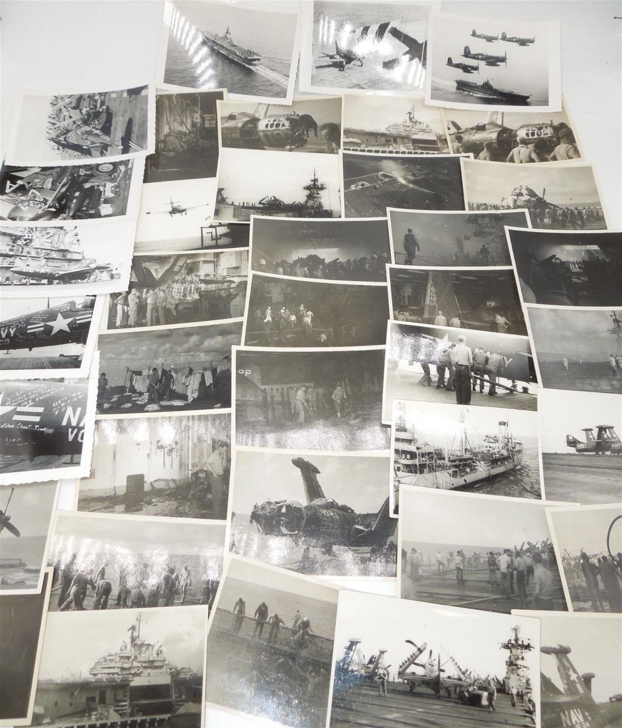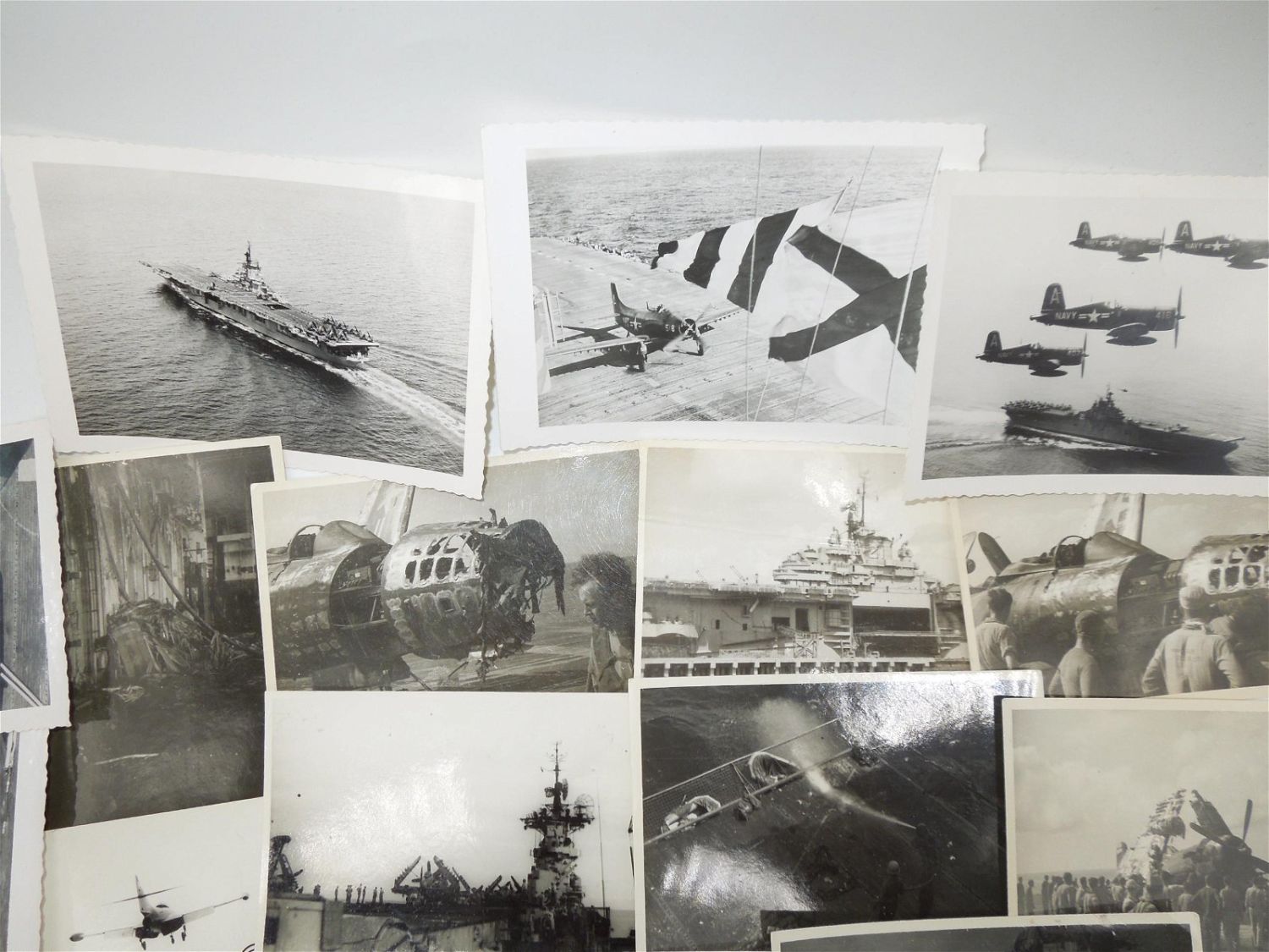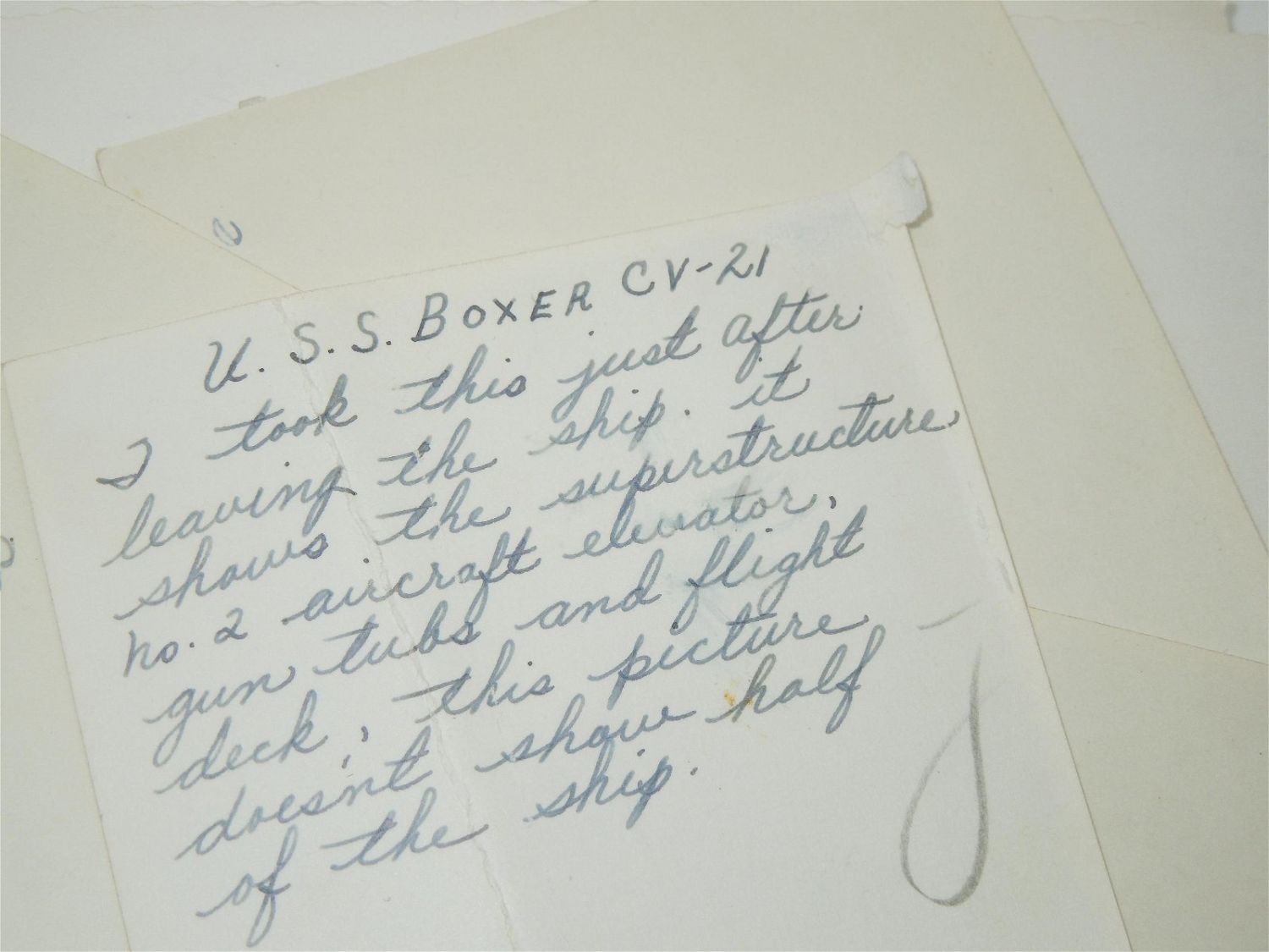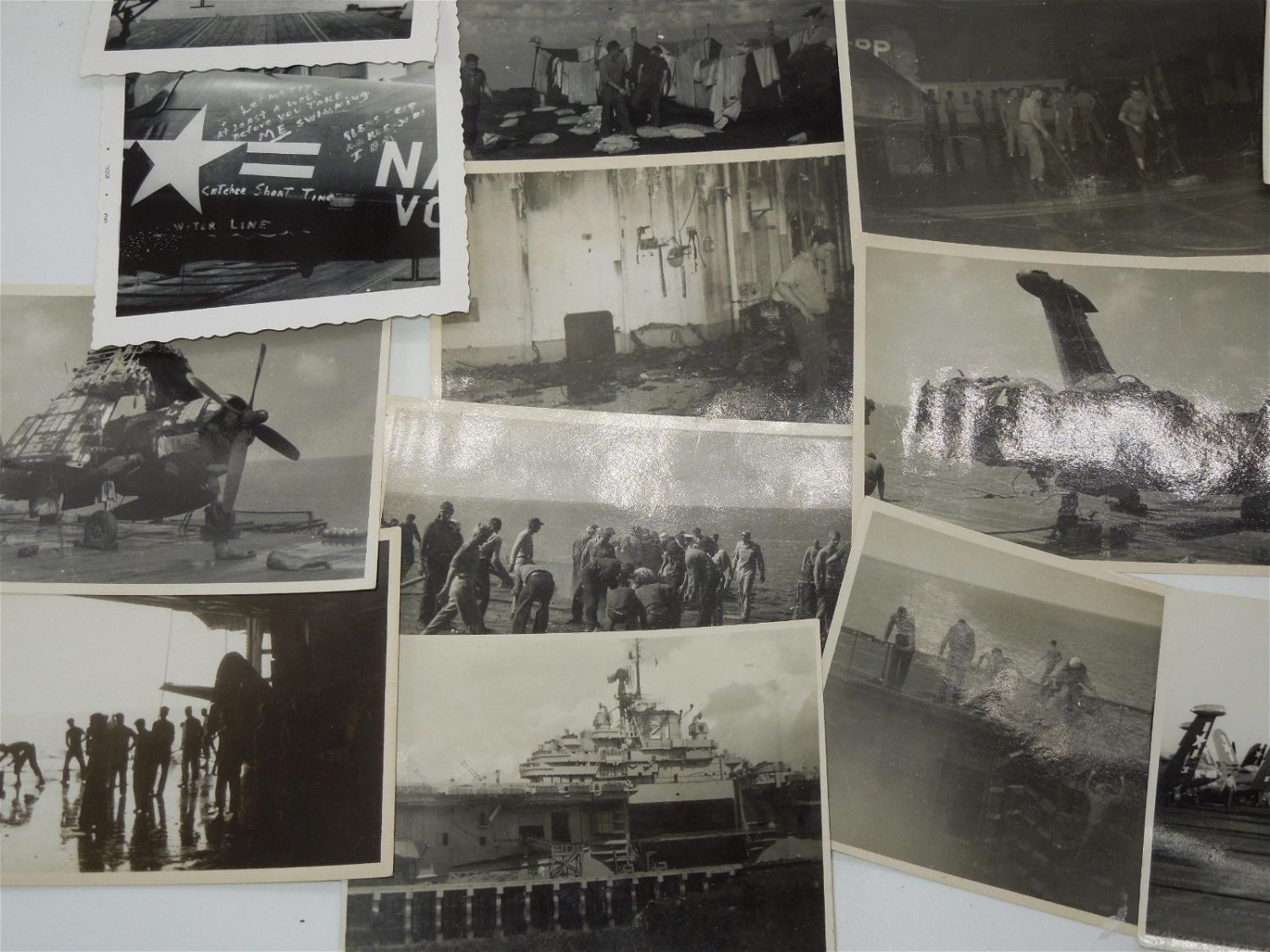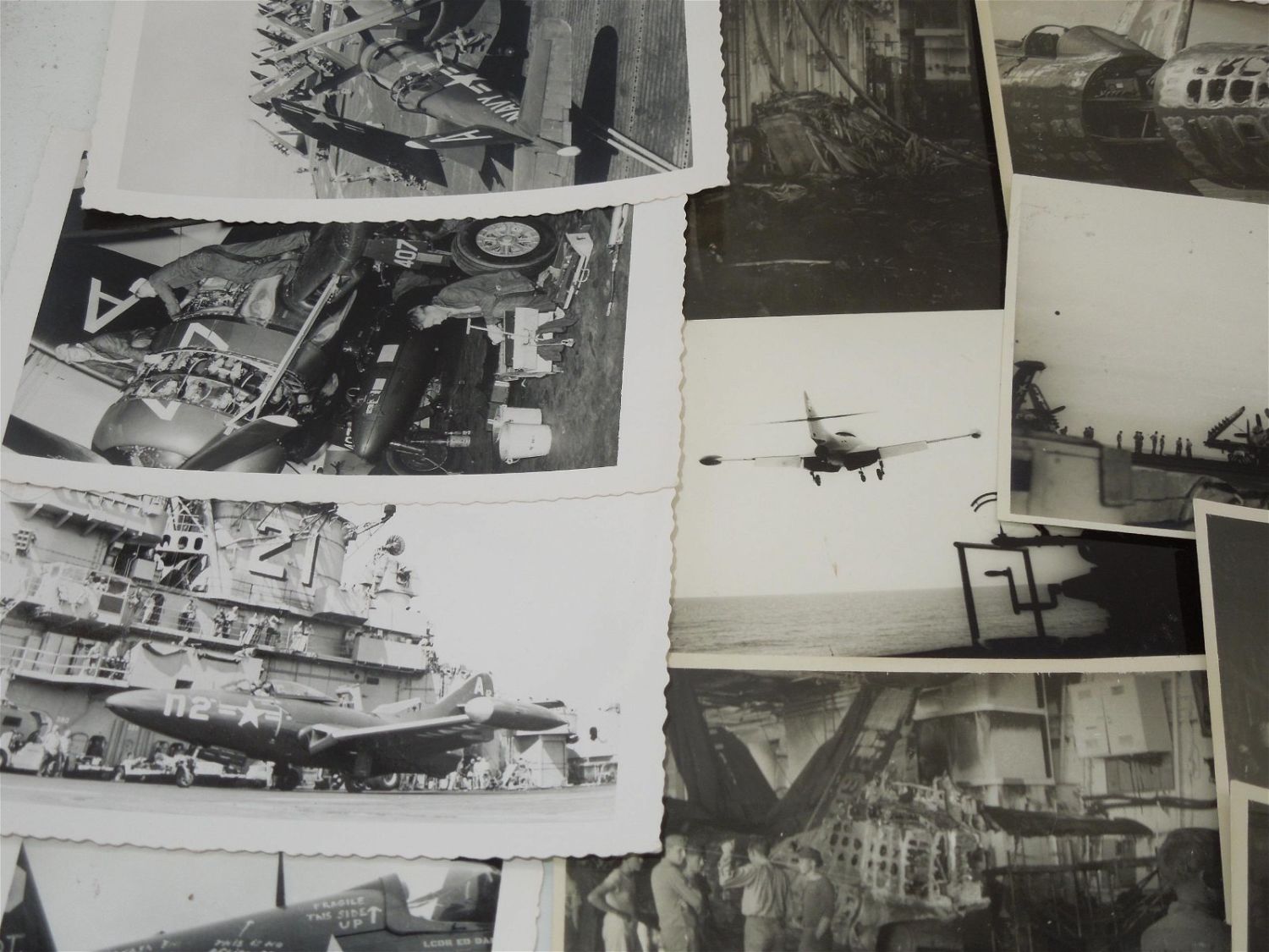 Grouping of original USN Nancy photos from the 1952 fire onboard the Carrier USS Boxer in the Korean War depicting damaged aircraft and more. Many have handwritten captions on the reverse.