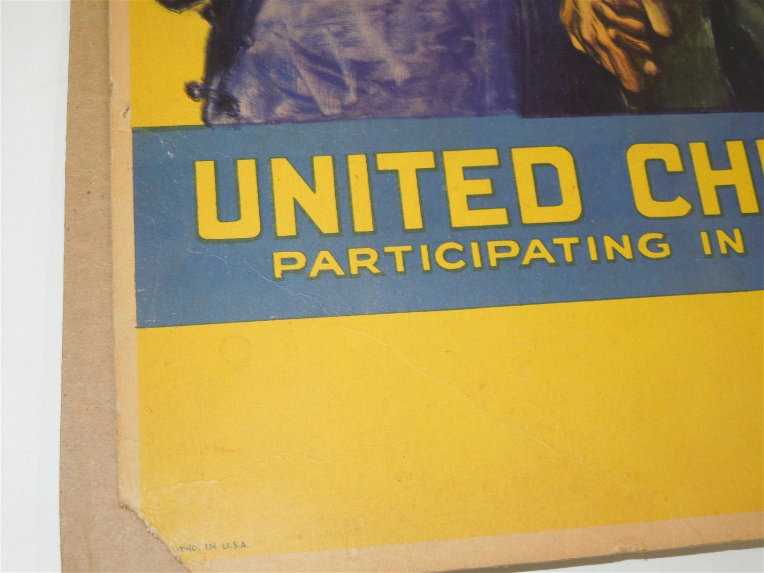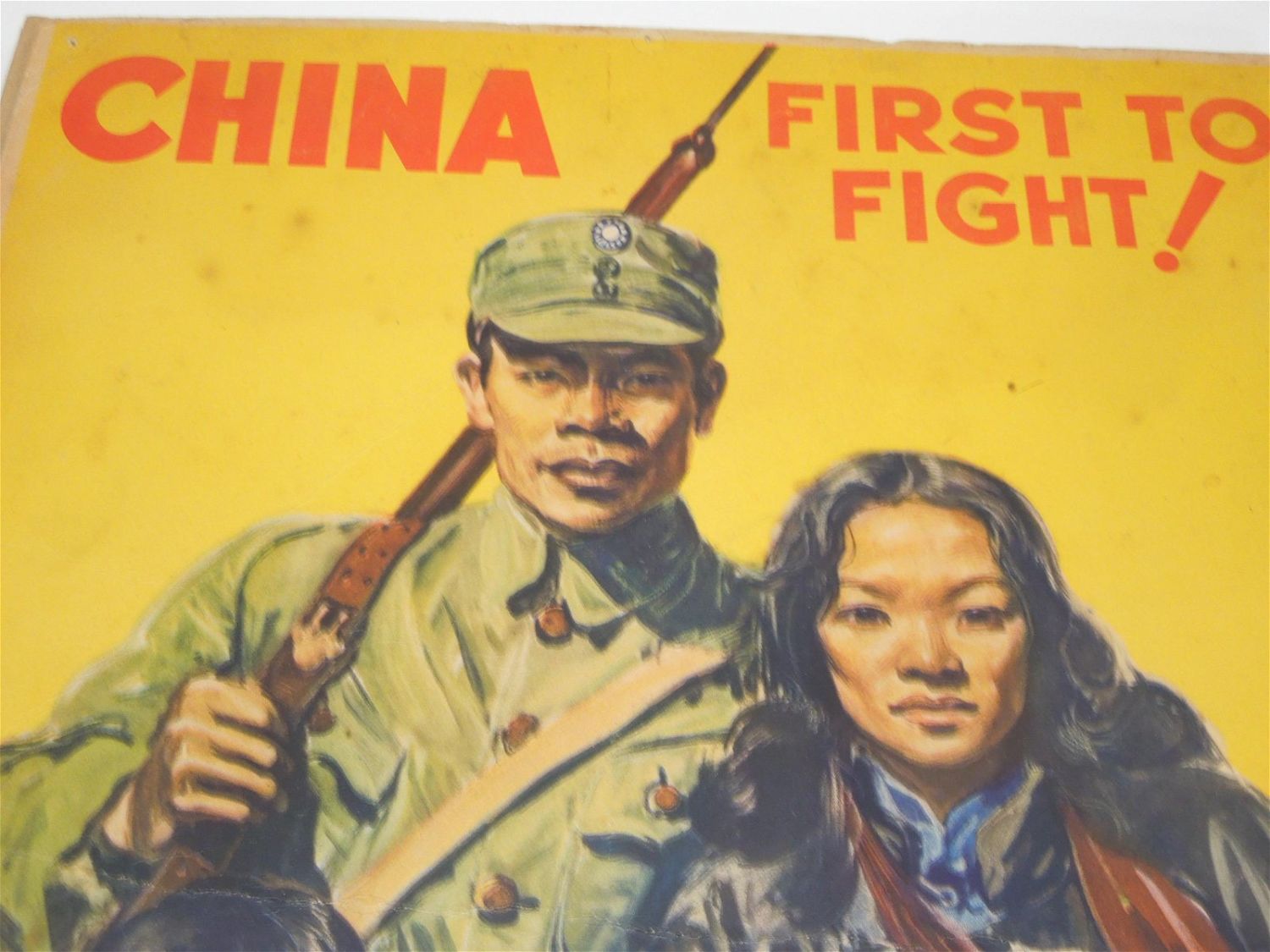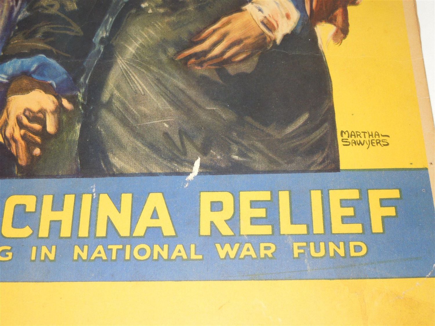 1940s China First To Fight! United China Relief Participating in National War Fund Poster. This piece was created by Martha Sawyers. A color lithographic poster of a Chinese soldier in a green uniform, walking behind a woman holding the hand of child. Both the woman and child are dressed in plain blue traditional Chinese clothing. The woman’s arm is in a sling and a bloody bandage can be seen on her wrist. The poster background is bright yellow. Approximate Size is 13.75 x 21.75 inches. The condition is good for the time period with rounded corners. Also, the bottom left corner is missing its edge. When shipped, this poster will be delivered rolled.