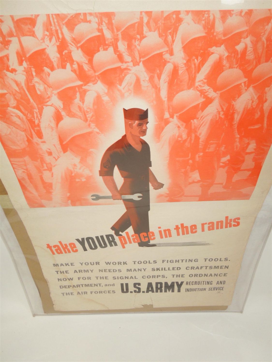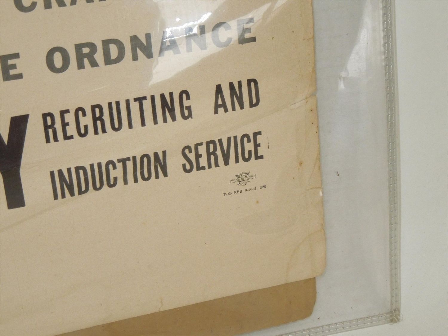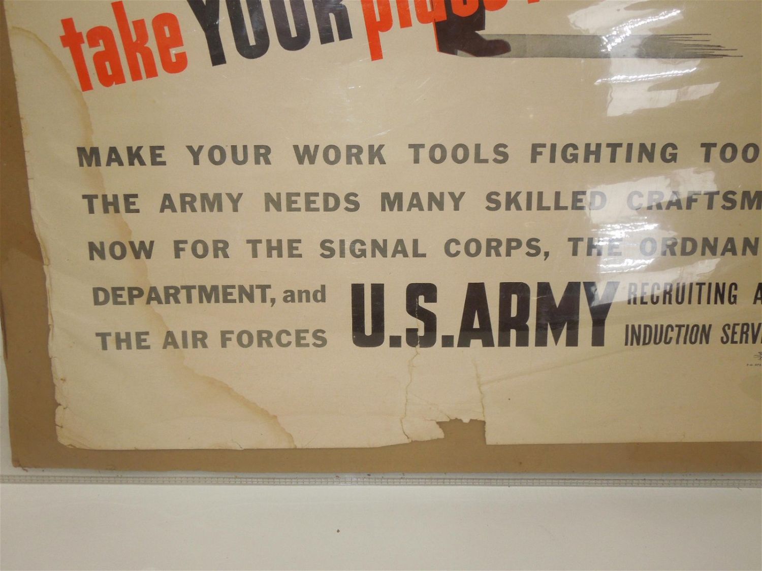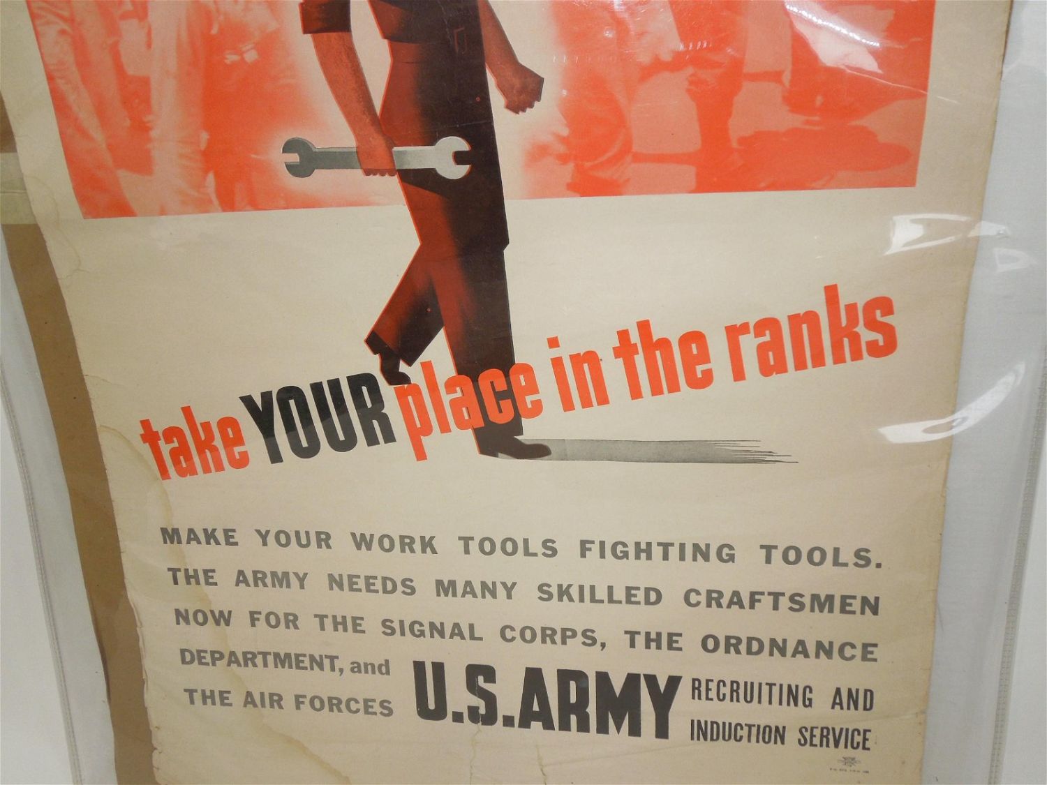 The poster depicts an Army Technician (4th) in work cloth carrying a wrench. In the background, a photo of armed soldiers marching in formation. Below is written Make your work tools fighting tools. The Army needs many skilled craftsmen now for the Signal Corps, the ordinance department and the air forces – U.S. Army recruiting and induction service. P-42–RPB 9-24-42 10M at the bottom. Approximate size is 25 x 38 inches. Condition poor to fair at best. The left side has a water stain. There is also tears and a piece at the bottom. When shipped, this poster will be delivered rolled.