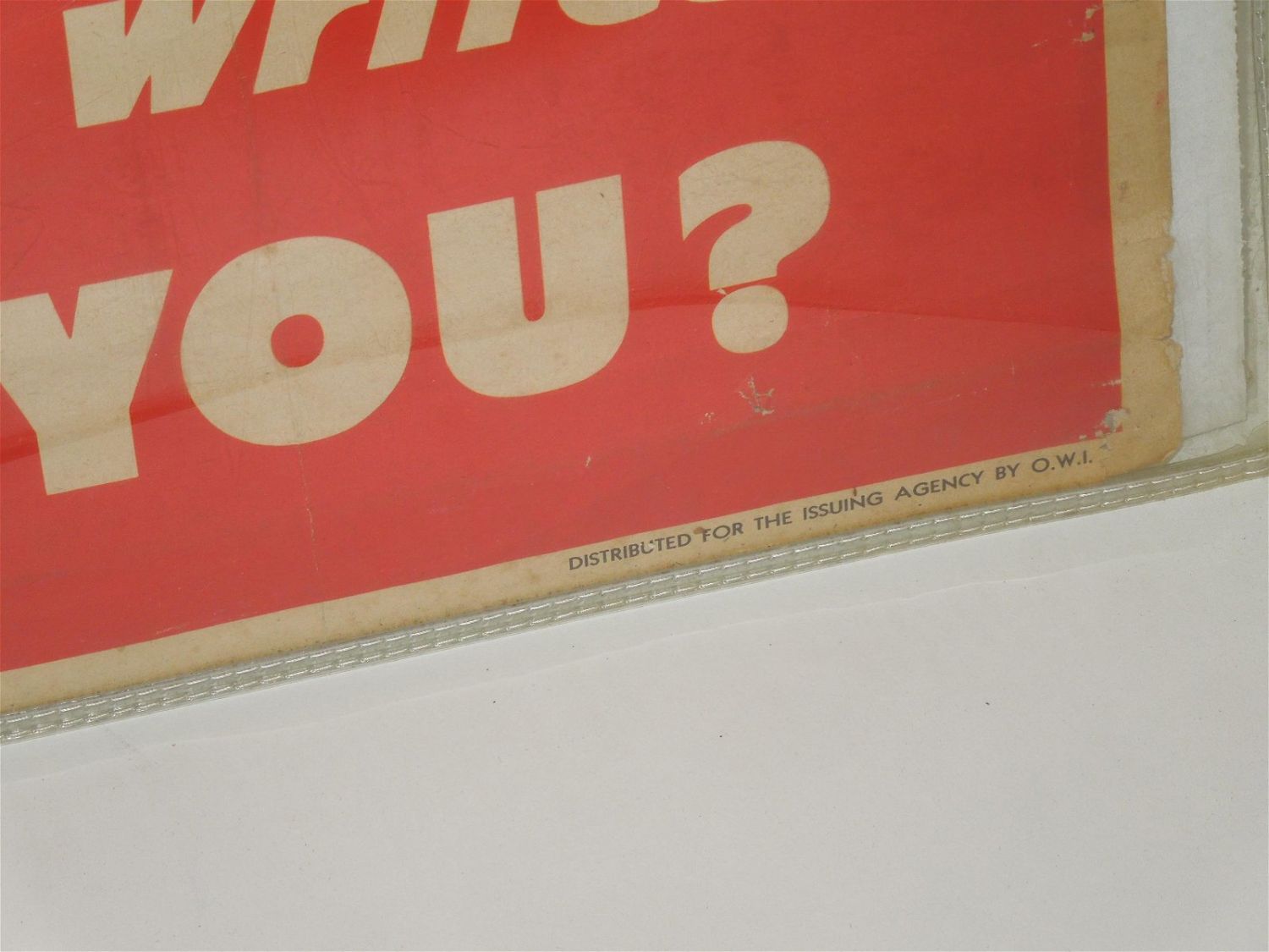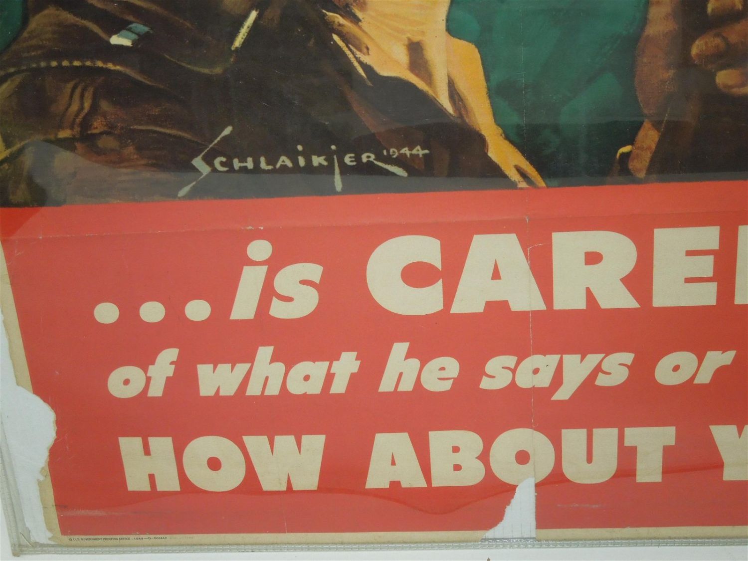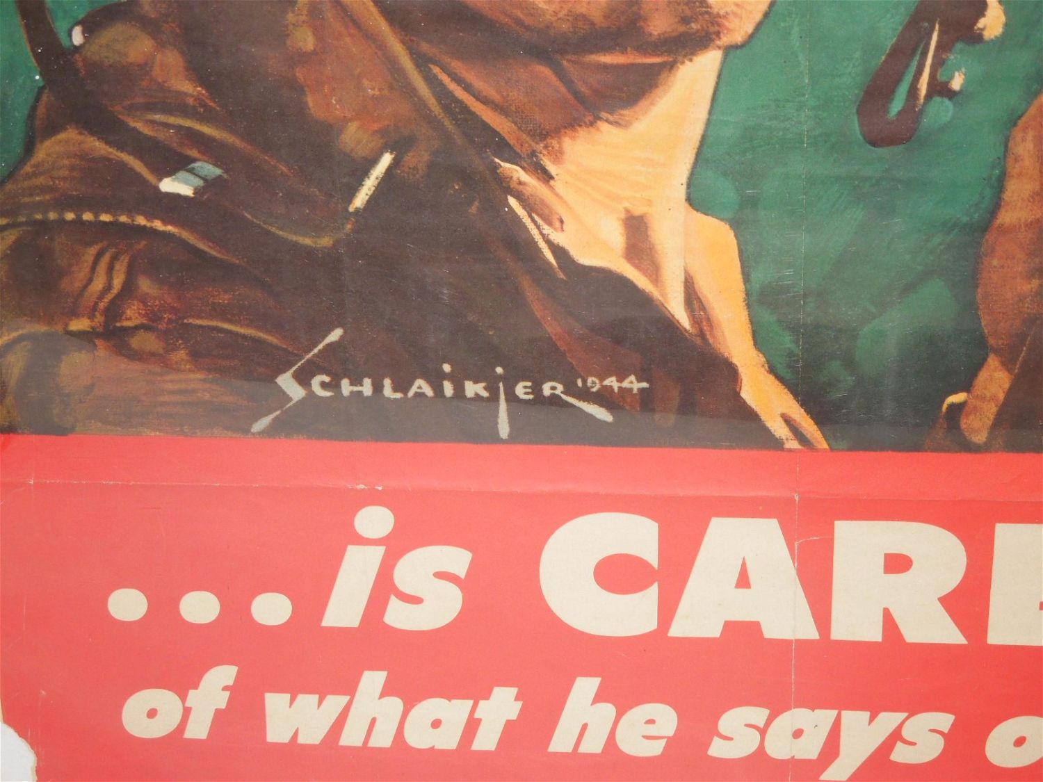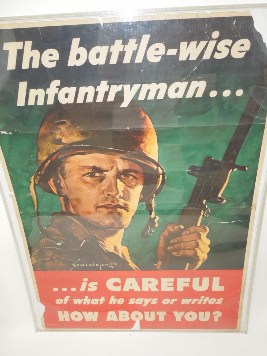 WWII 1944 Army Soldier Battle Infantryman Propaganda Poster. Painting of head and shoulders of infantry soldier with gun in his hands. The battle-wise Infantryman is Careful of what he says or writes. How About You? The artist is Schlaikjer. Produced by United States. Government Printing Office. Distributed For The Issuing Agency By O.W.I. Approximate size is 40 x 28 inches. The condition is fair at best. Look over pictures to see a better explanation of the deficits of this poster. When shipped, this poster will be delivered rolled.
