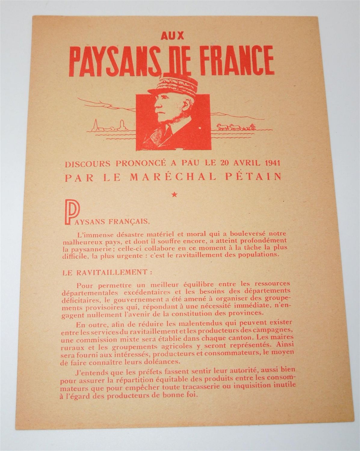Marshal Petain speech to the peasants of France Pau on April 20, 1941. During the year 1941, the question of supplies appeared as the main source of grievance and was undoubtedly the main factor in the process of detachment from the opinion of the Marshal’s regime. By July 1941, the honeymoon was over. The complaints were more numerous, especially in terms of supplies, and the Marshal’s prestige was no longer enough to get the rutabagas through. Thus the reason why Marshall Pertain created this propaganda. Text of the speech addressed to the peasants included that Petain wanted to make peasants one of the bases of his regime. Himself from the rural world, symbol of the victory of Verdun during the First World War (where many peasants lost their lives to defend the fatherland), he addressed many speeches to the peasant world. This is one of those speeches. Approximate size is 6 x 8 inches. Good condition for its age.