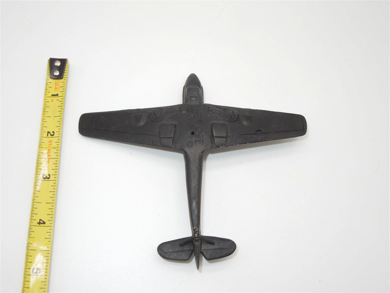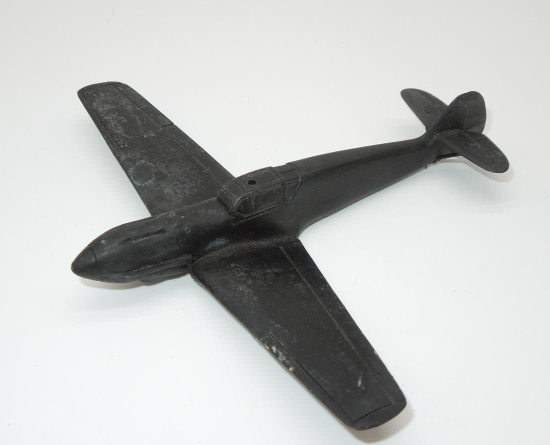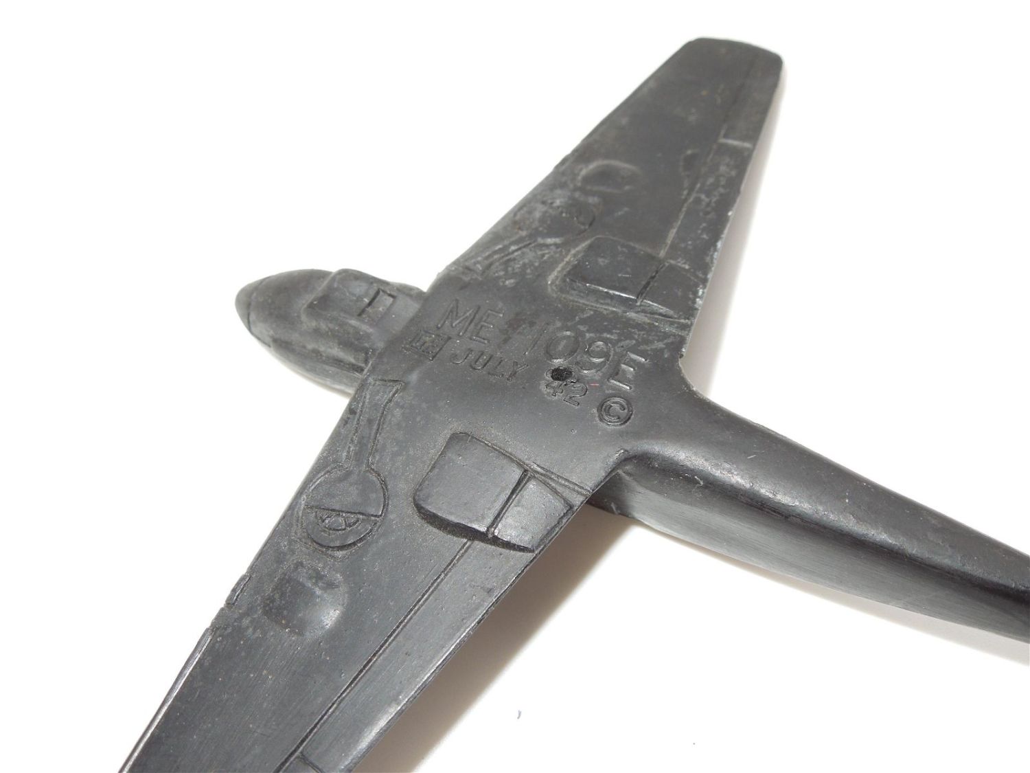 WWII 1942 German Messerschmitt ME 109E Spotter Recognition Fighter Plane. These planes were produced by the Cruver Mfg. Co of Chicago, IL as indicated by the c inside the circle. They were used by military service members in aircraft recognition training programs. Made of celluloid acetate. Approximate size is 5 x 5.25 inches. Condition is good for the time period.