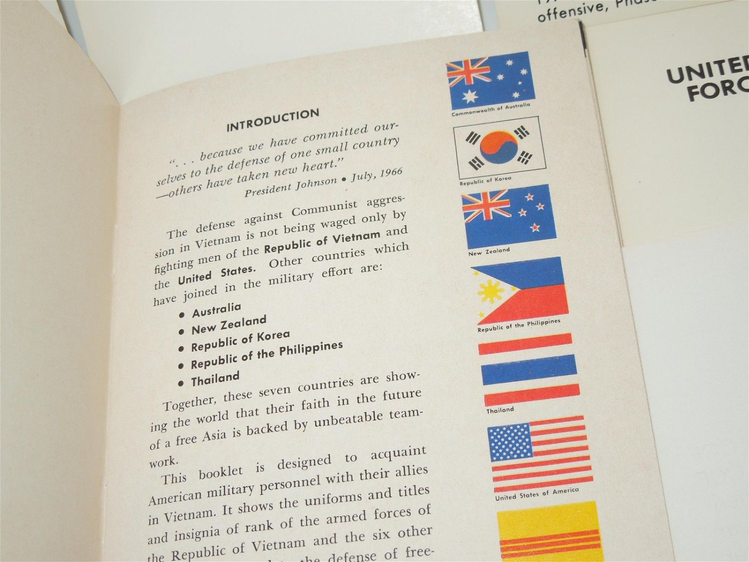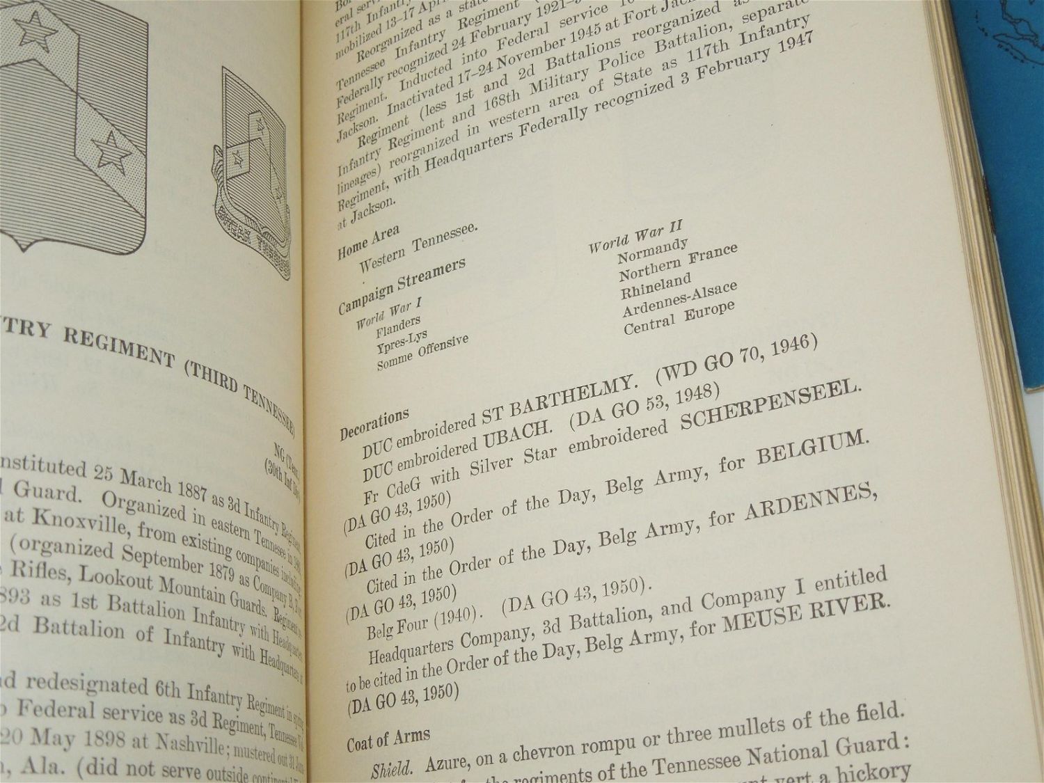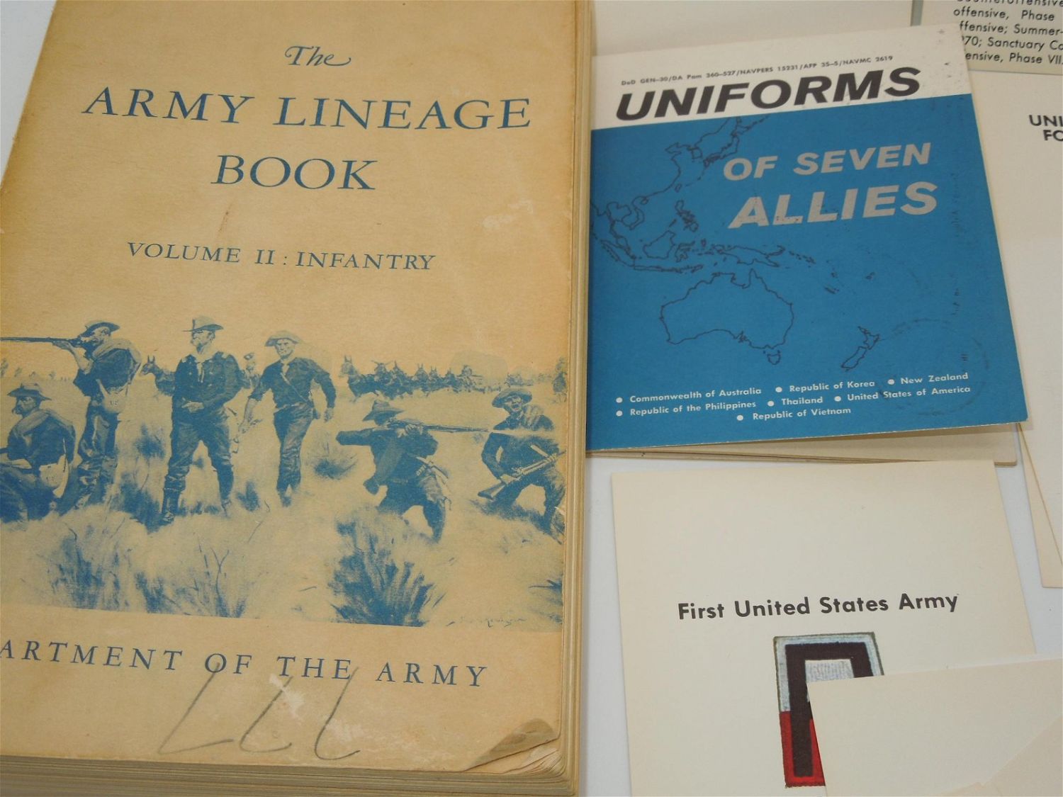1953 Army Lineage Book Volume II: Infantry (859 pages) in good readable condition. This book describes the history of each unit along with a picture of the patch and DUI associated with the Unit. 1967 Uniforms of Seven Allies (23 pages), 30 cards displaying patches of Army units and a narrative of the unit. Approximate size is 7 x 3.75 inches.