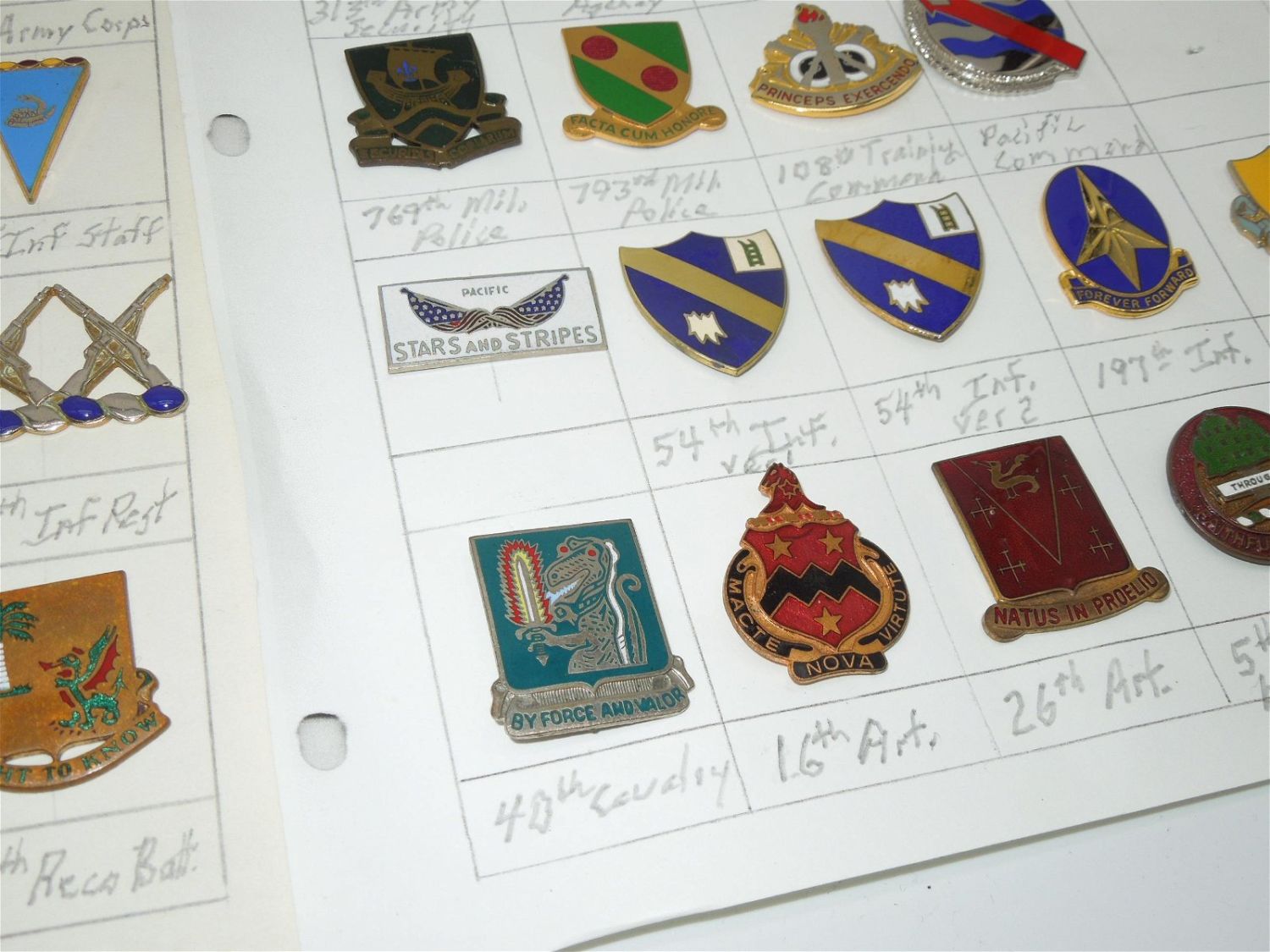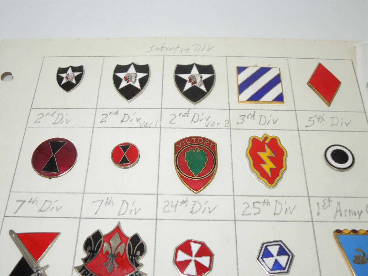 Army Infantry Division Distinctive Unit Insignia DUI Crest Collection. You will receive 49 DUIs to include some pin backs. Most are clutch backs. Some pieces include: infantry, cavalry, artillery, military police, aviation, infantry regiments, & divisions. Good overall condition.