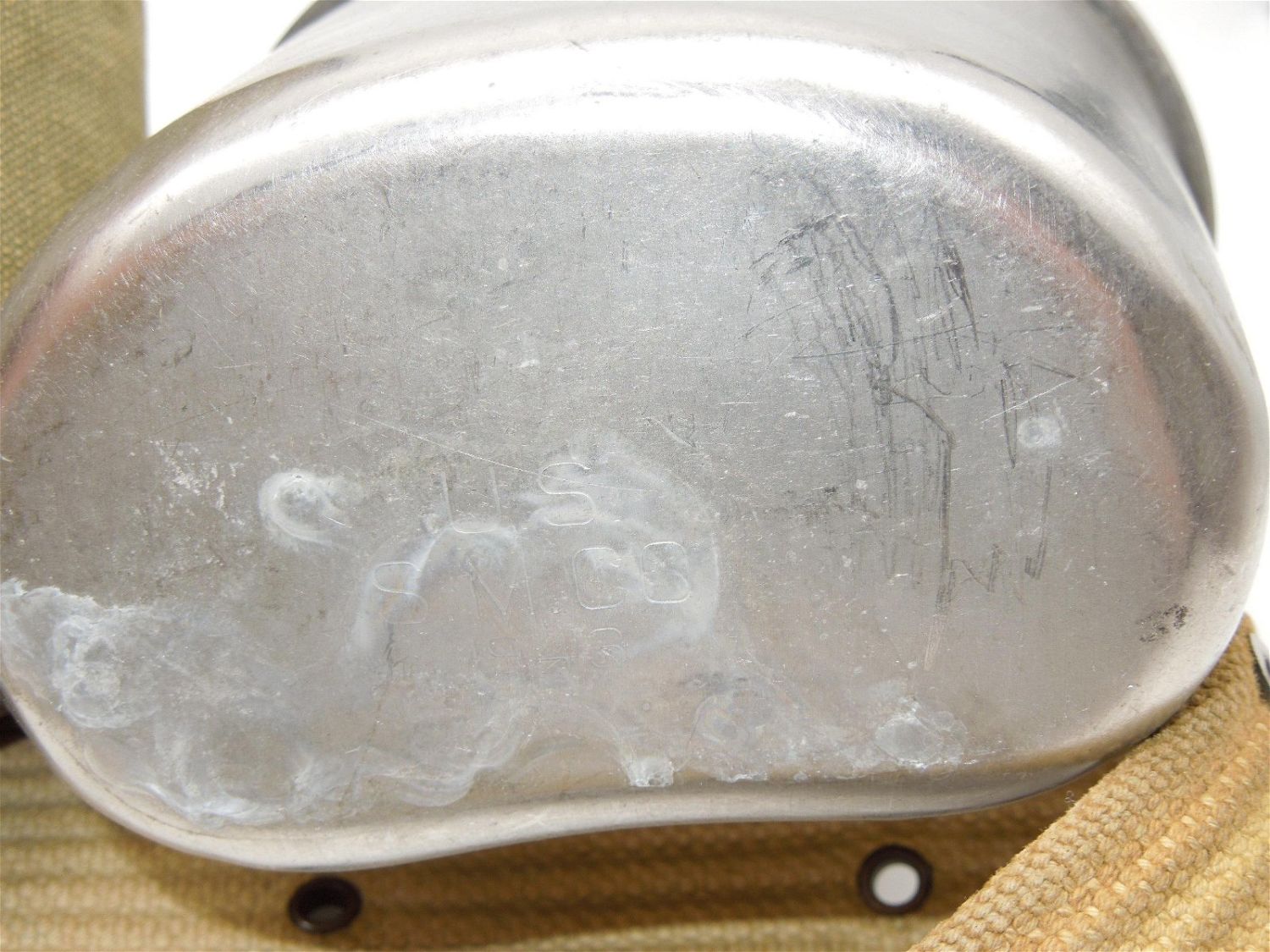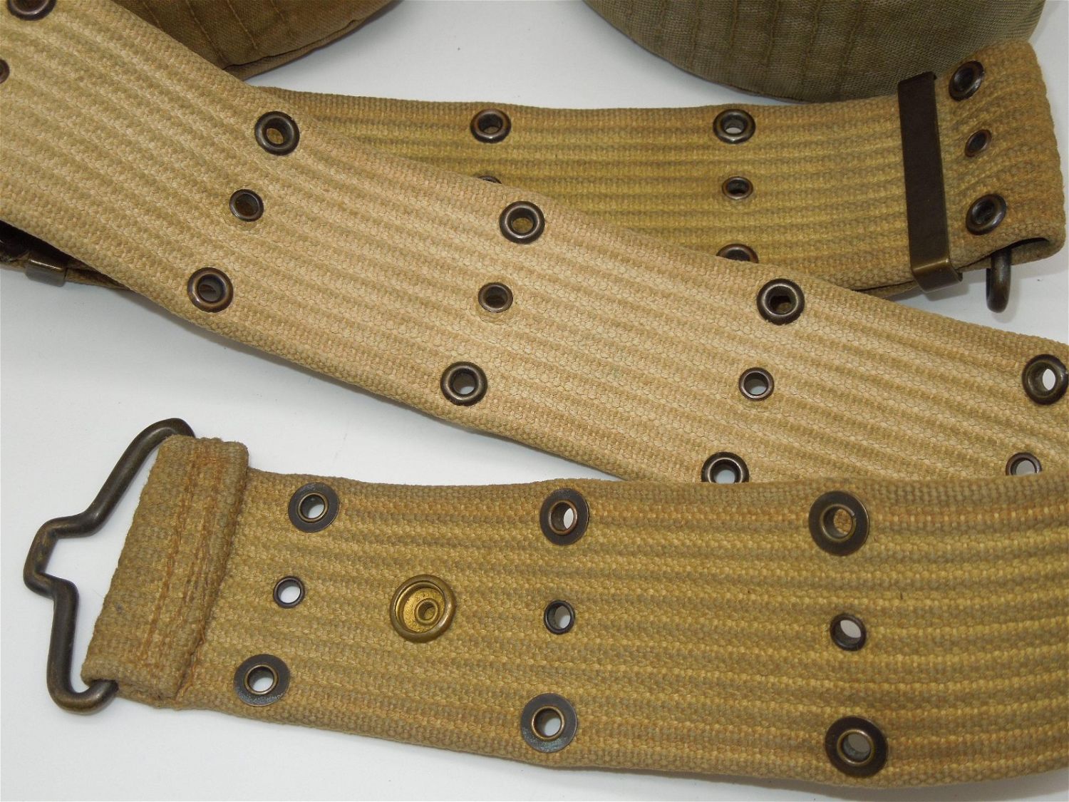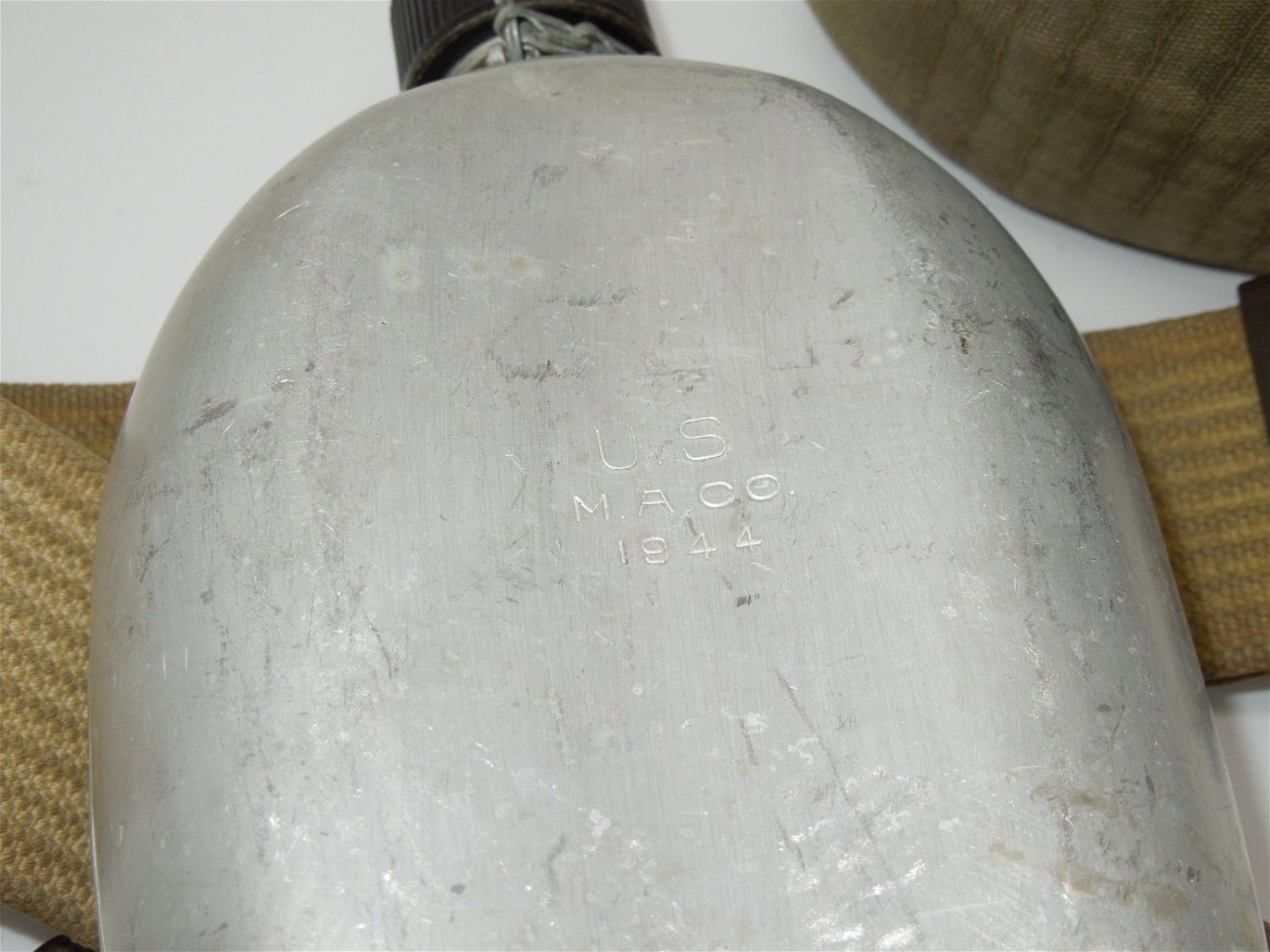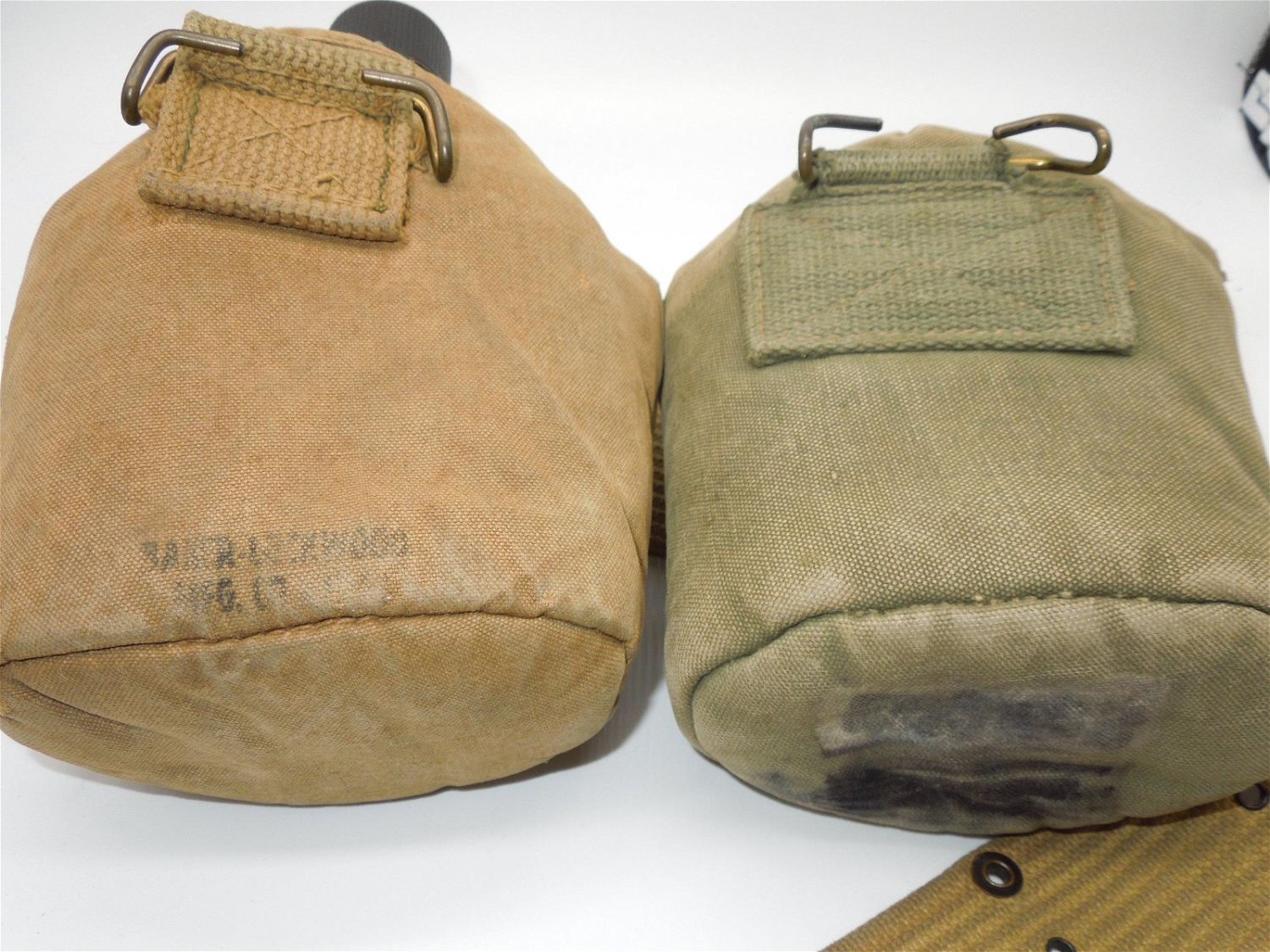 Lot of two WWII canteens- dated 1943 and 1944, with their cups and covers. The green cover may be Korean War era. Also a nice web belt from the period. All pieces are field used and worn from age.