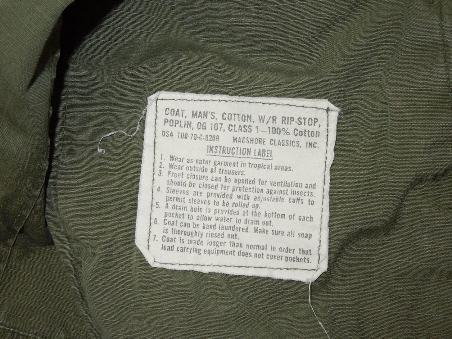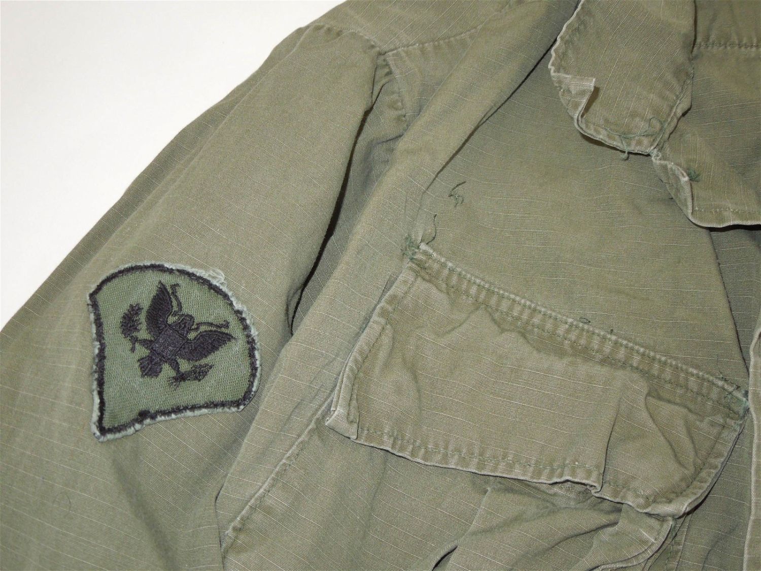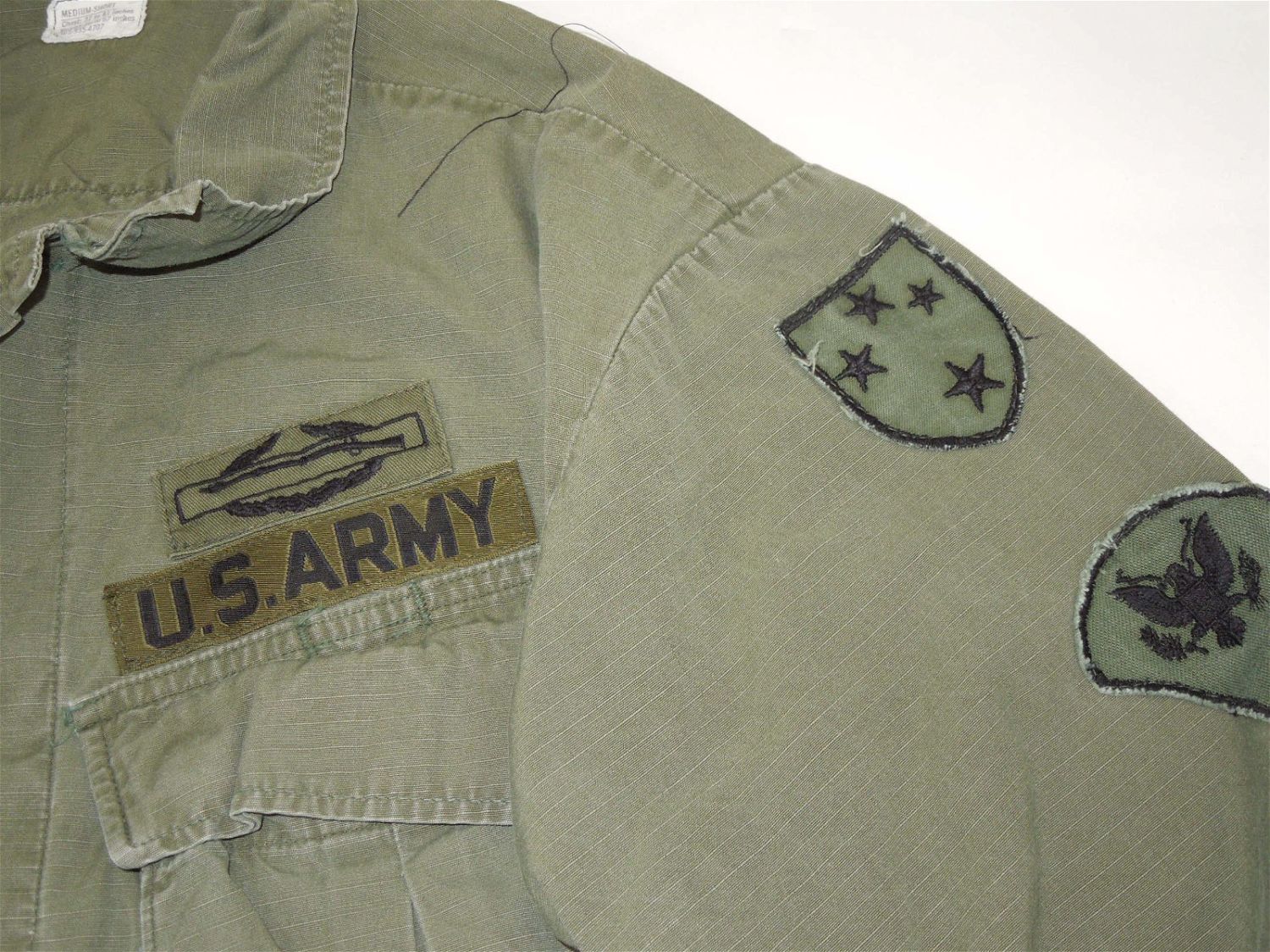 Vietnam Era Army 23rd Infantry Americal Division Olive Drab Jacket. Rank is SP4. Combat Infantryman Badge is affixed to the jacket. Size is Medium Short. Good condition for its age. Moth ball smell from storage.