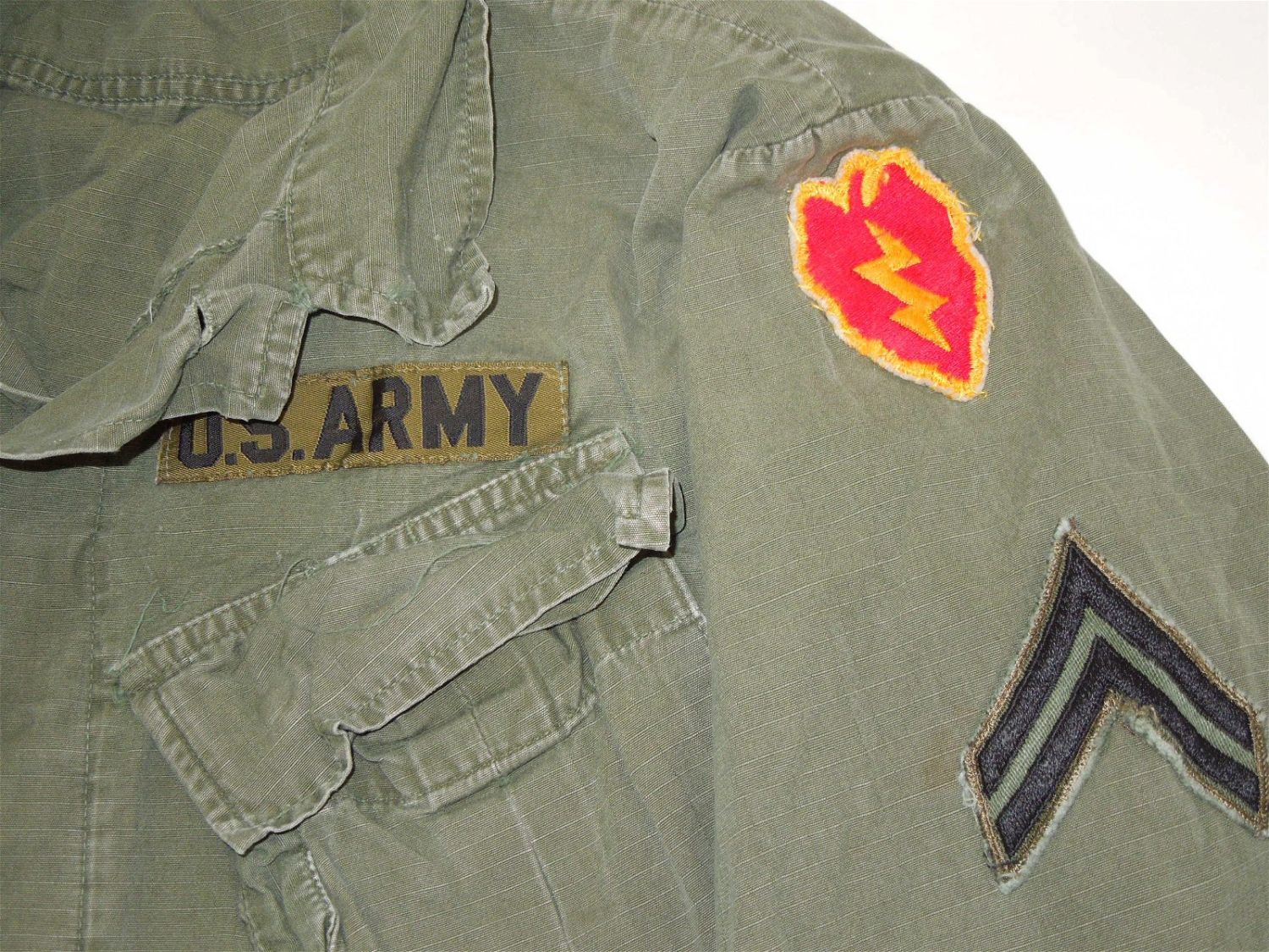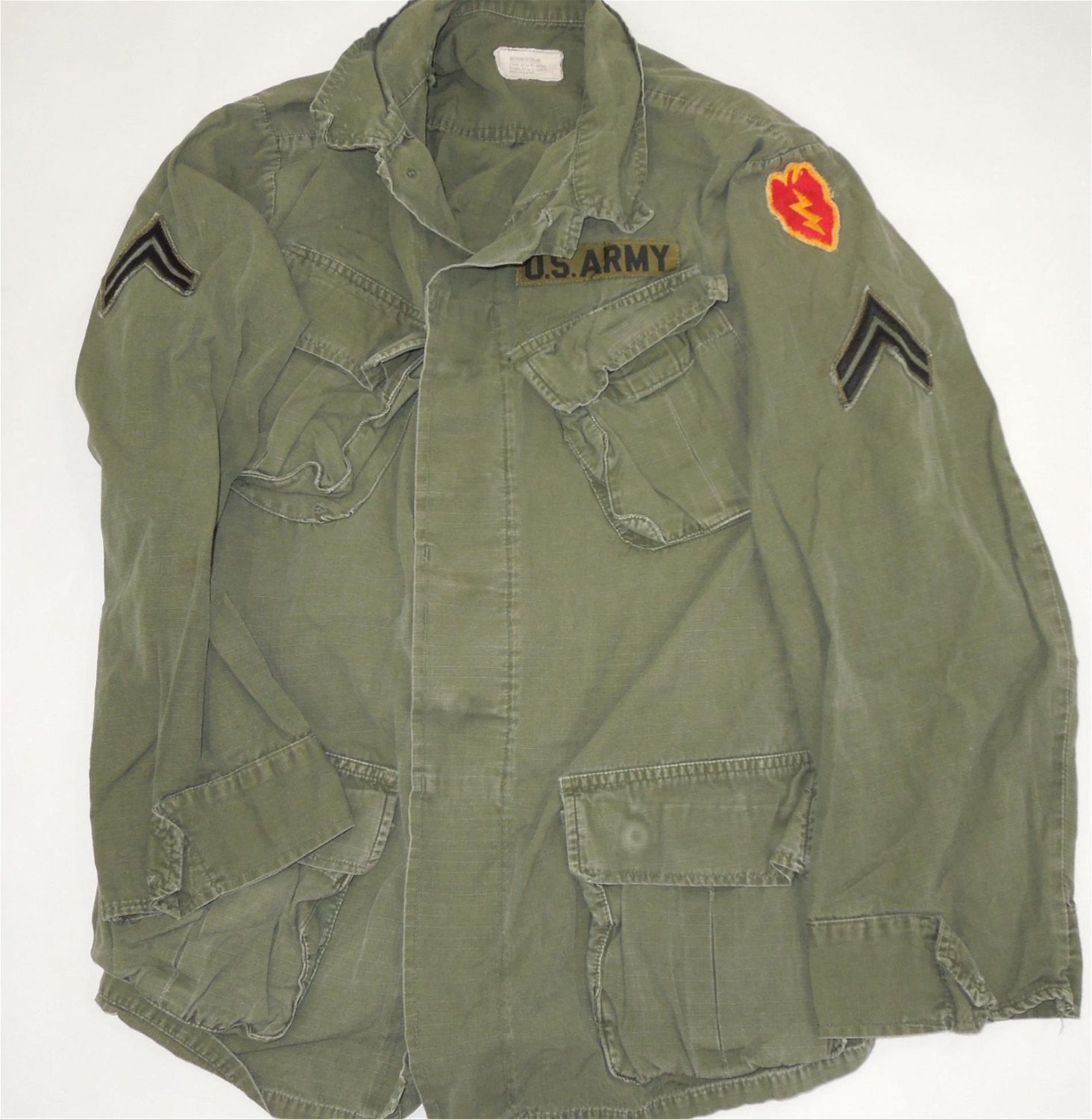 Army Corporal 25th Infantry Division Olive Drab Jacket. Size is Medium / Regular. Good condition for its age. Moth ball smell from storage.