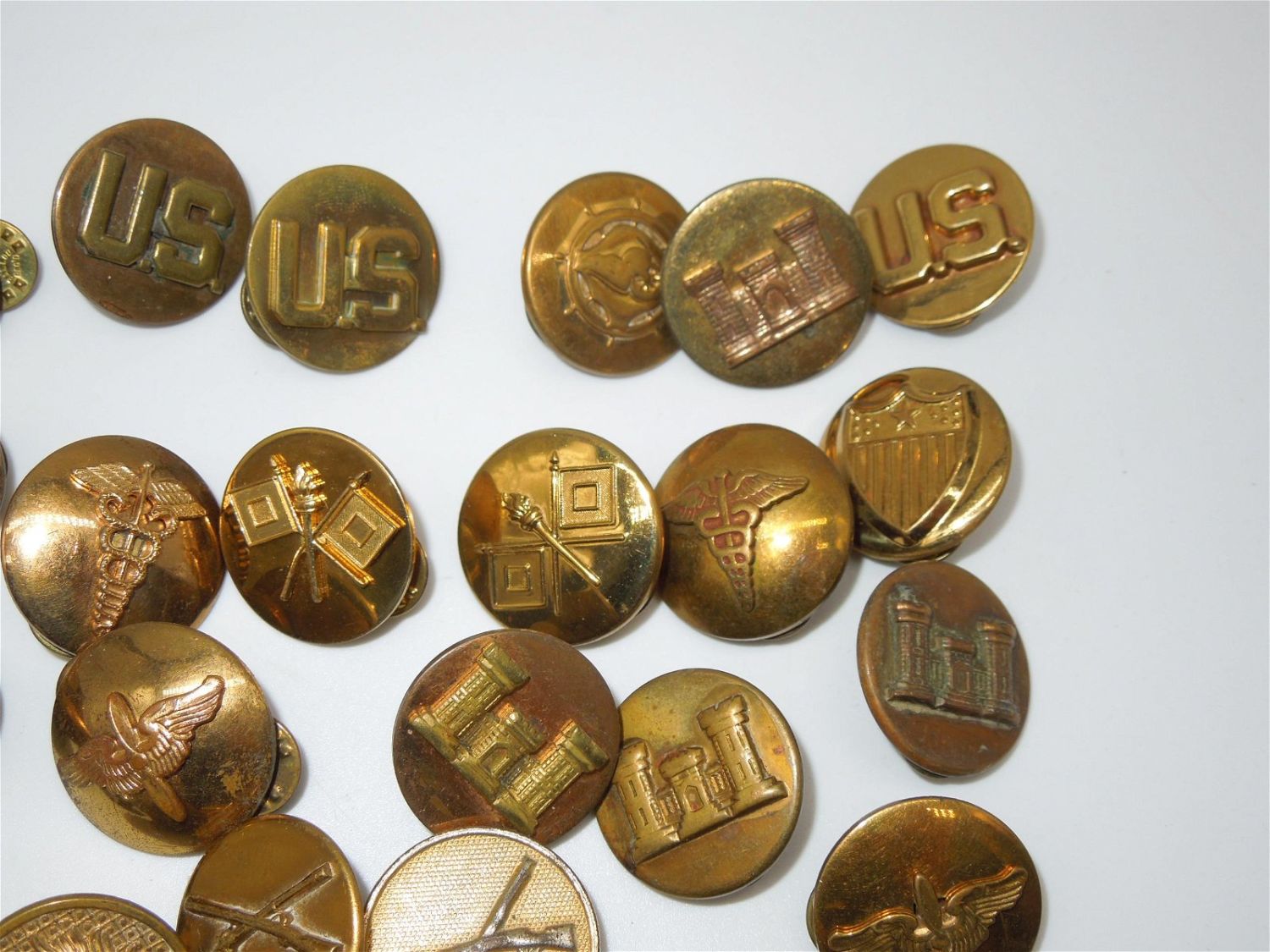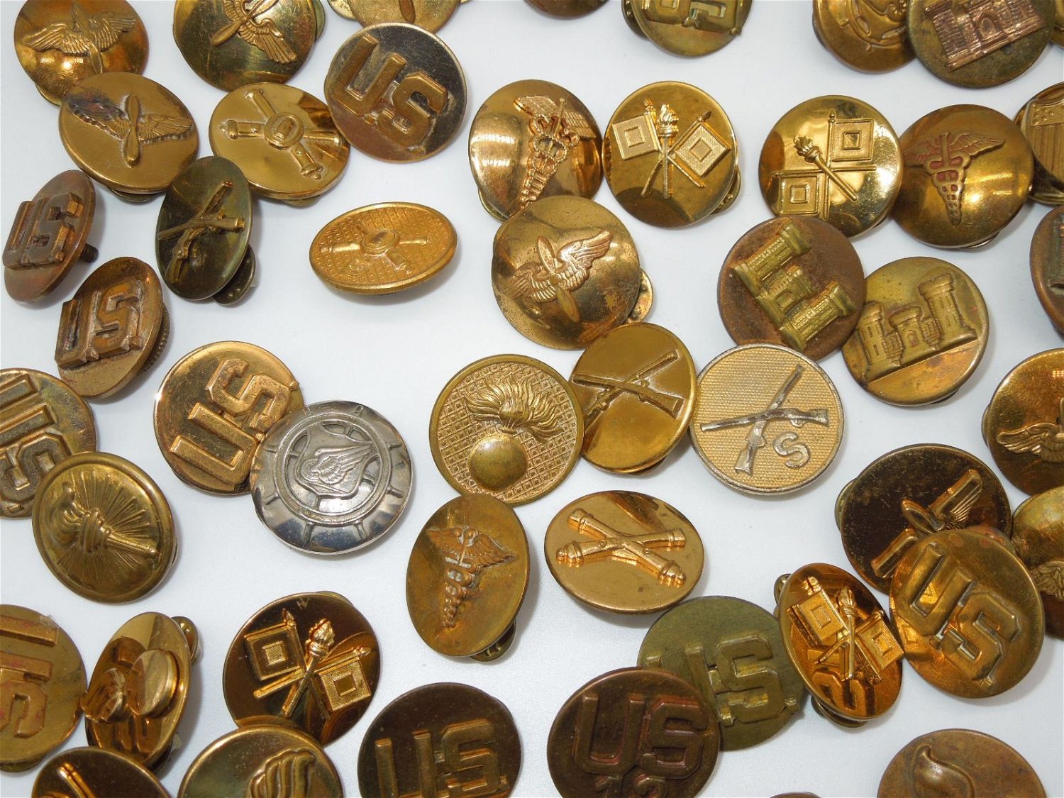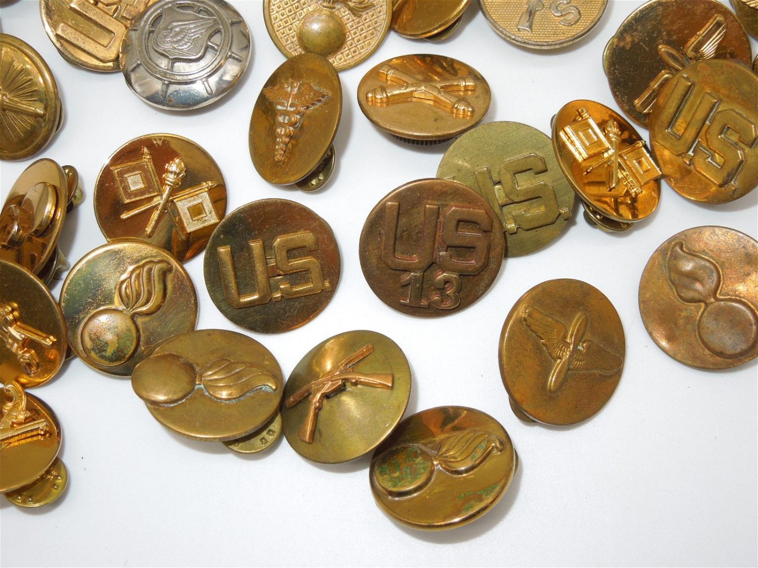 US Military Collar Disc Insignia Lot Engineer, Ordnance, Medical, Infantry, Artillery, etc. You will receive 50 plus pieces. This group of collar discs include some of the following: Medical, Engineer, Signal Corps, Infantry, Coast Artillery, Ordnance, Air Corps, Artillery, etc. Pieces are screw back and clutch back. Good condition consistent with their ages.