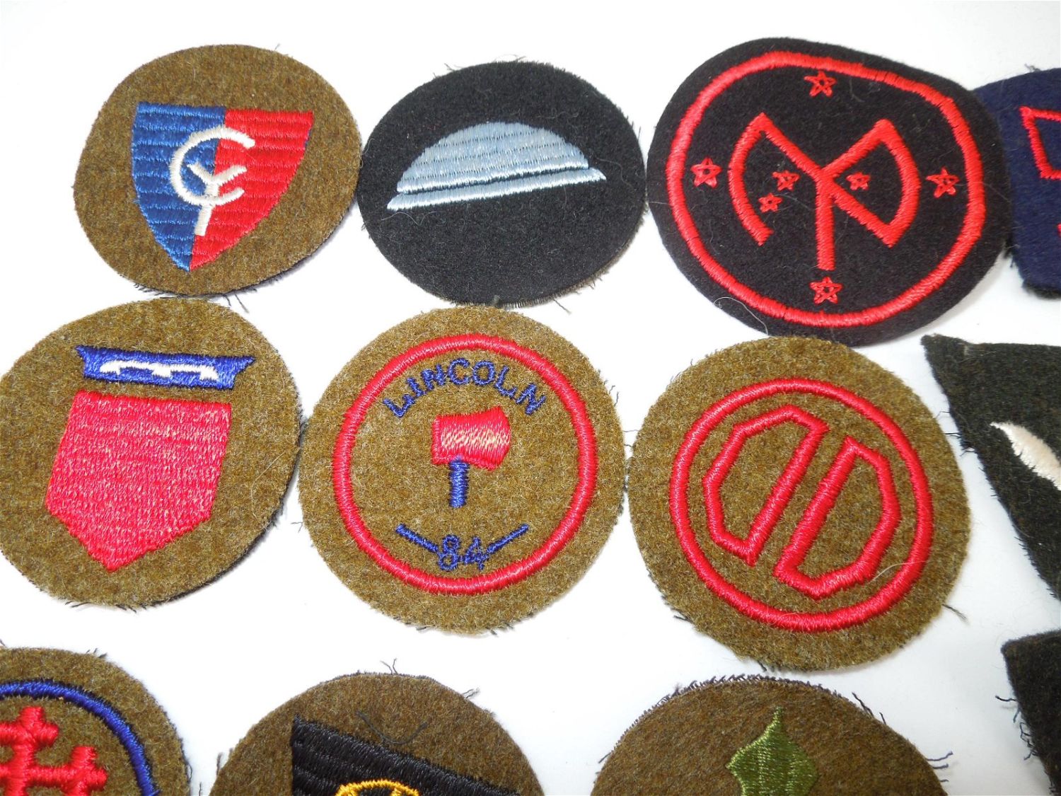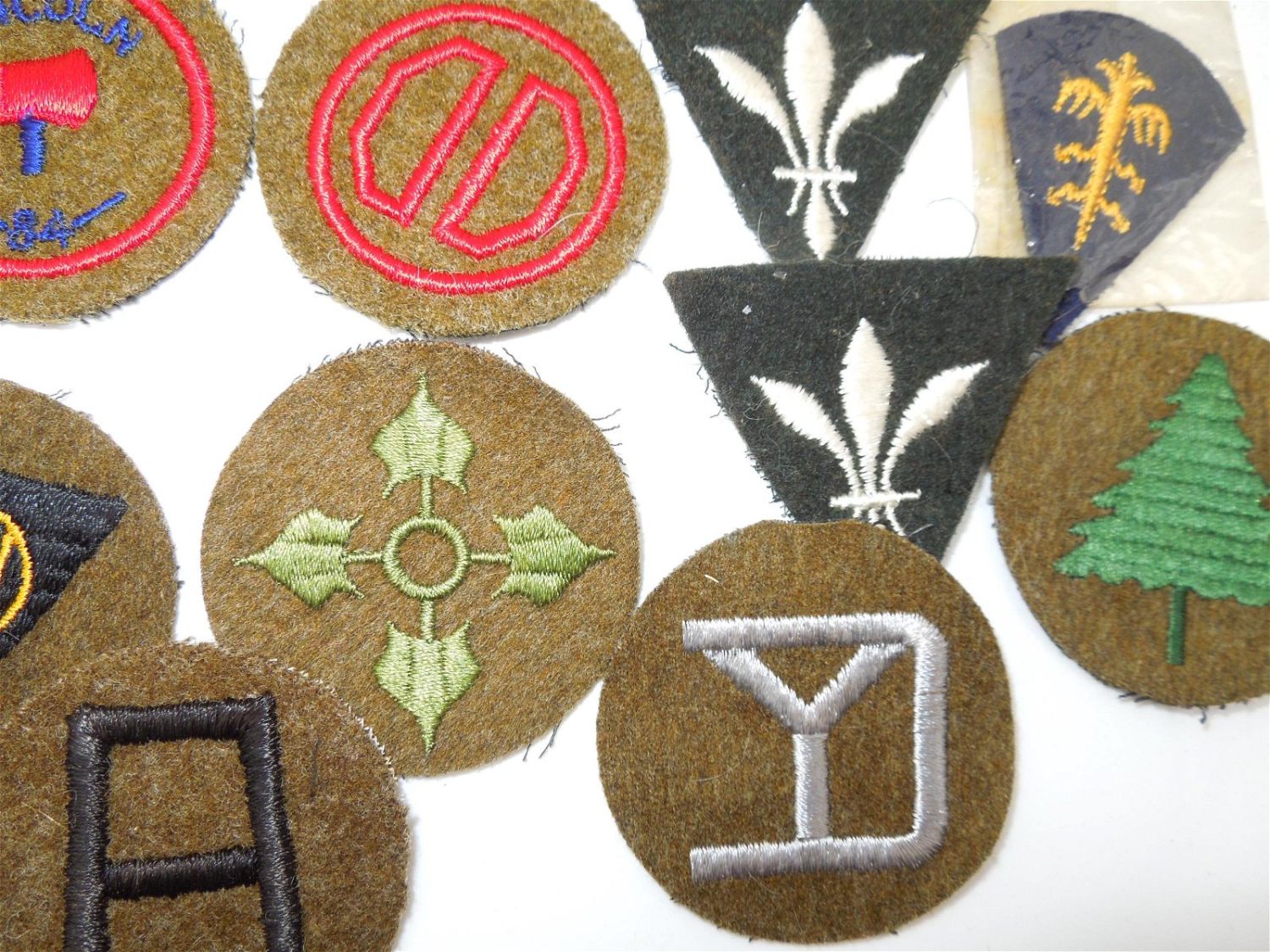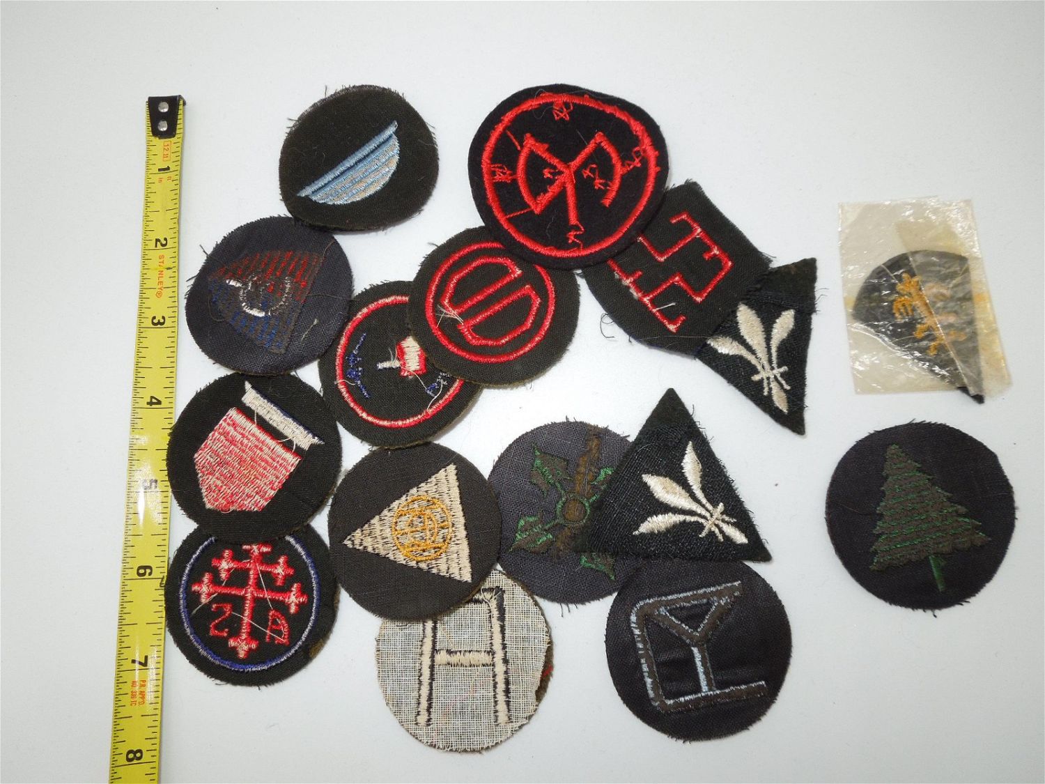 Lot of 17 embroidered on Wool mini division patches, US Army type. These might be Patch King type pieces sold in the 1920s – 40s. One 5th Division version is not pictured, but included. Good condition.