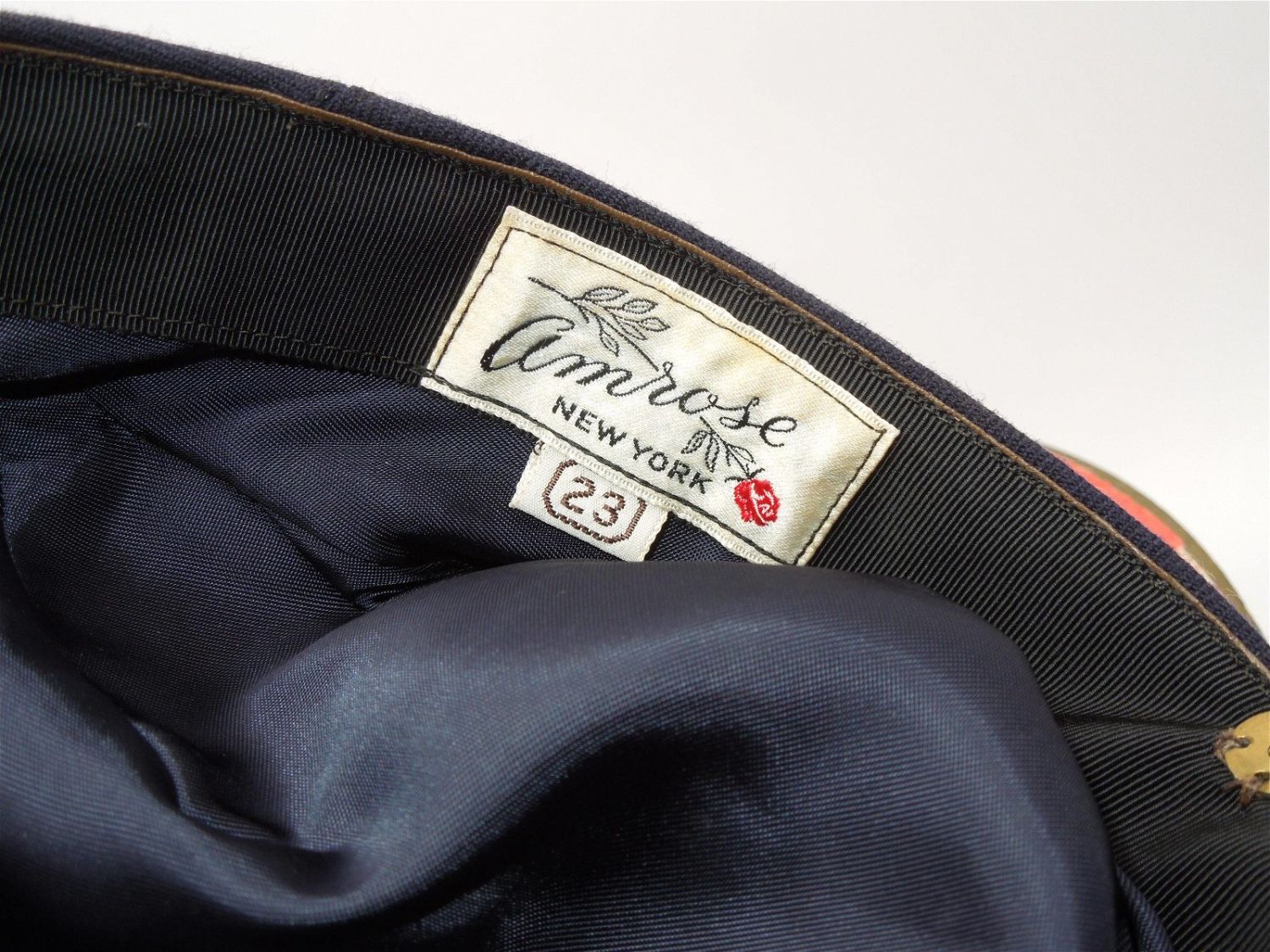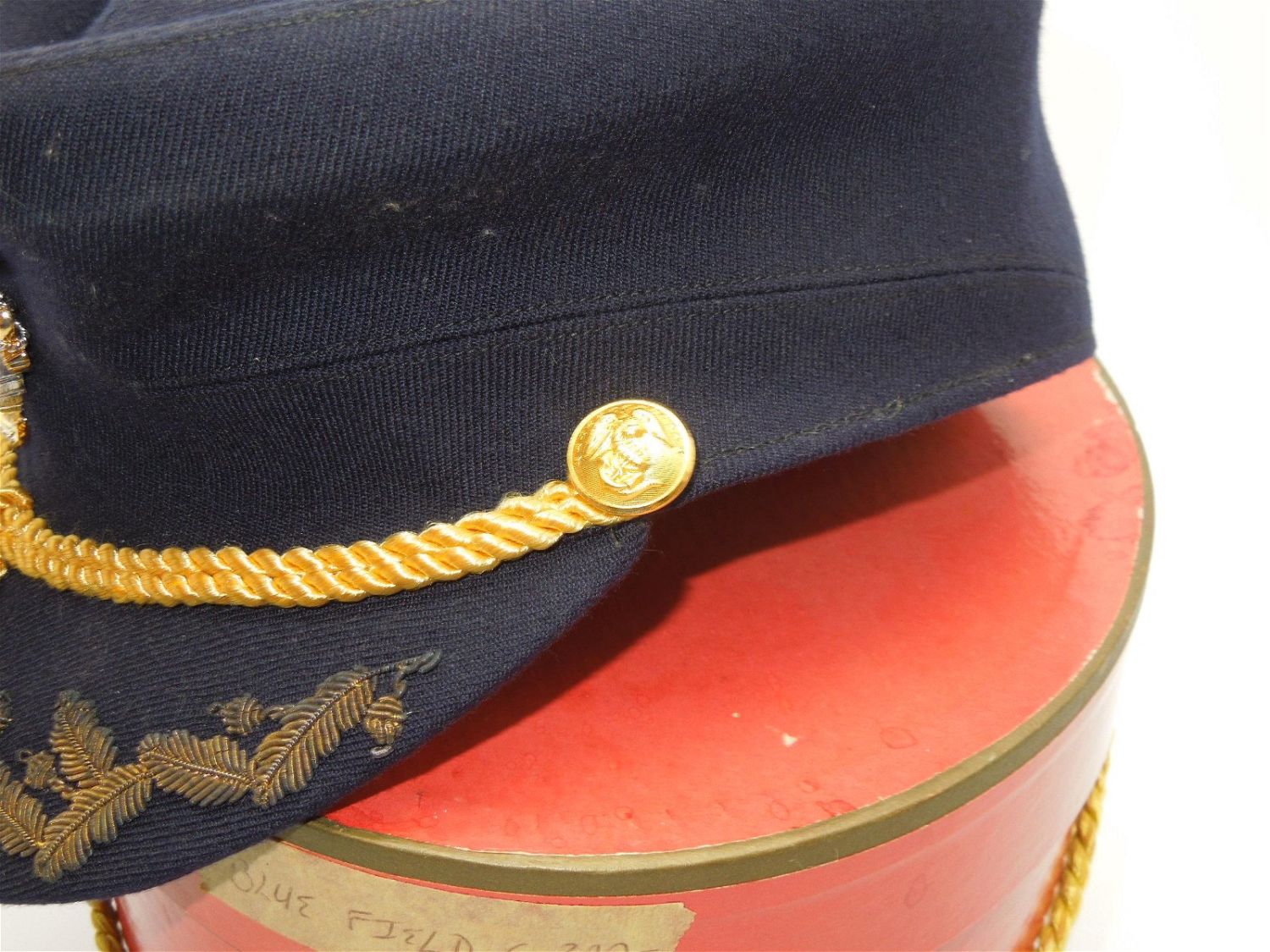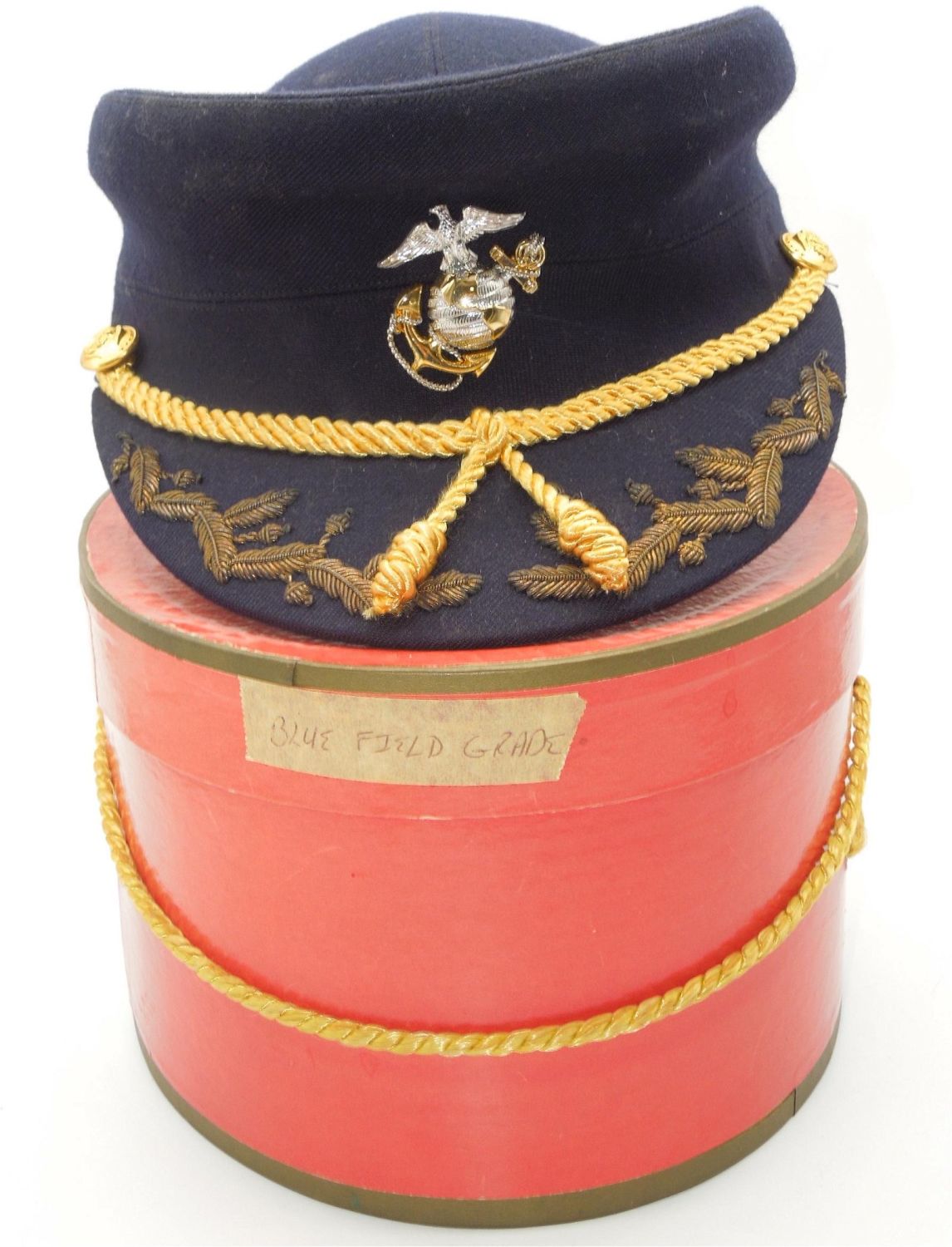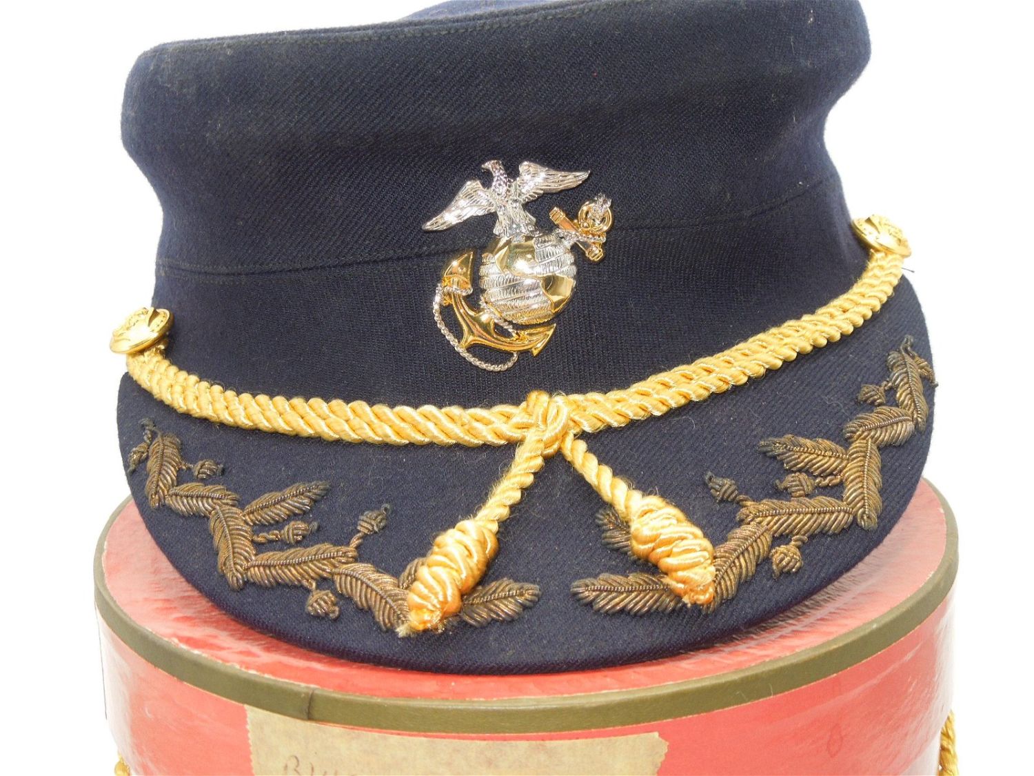 1950s Korean War Era Marine Corps Womens Officer Bullion Hat & Box. Dark Blue Field Grade. Made by Amrose, New York. Size is 23. Nice condition for its age.