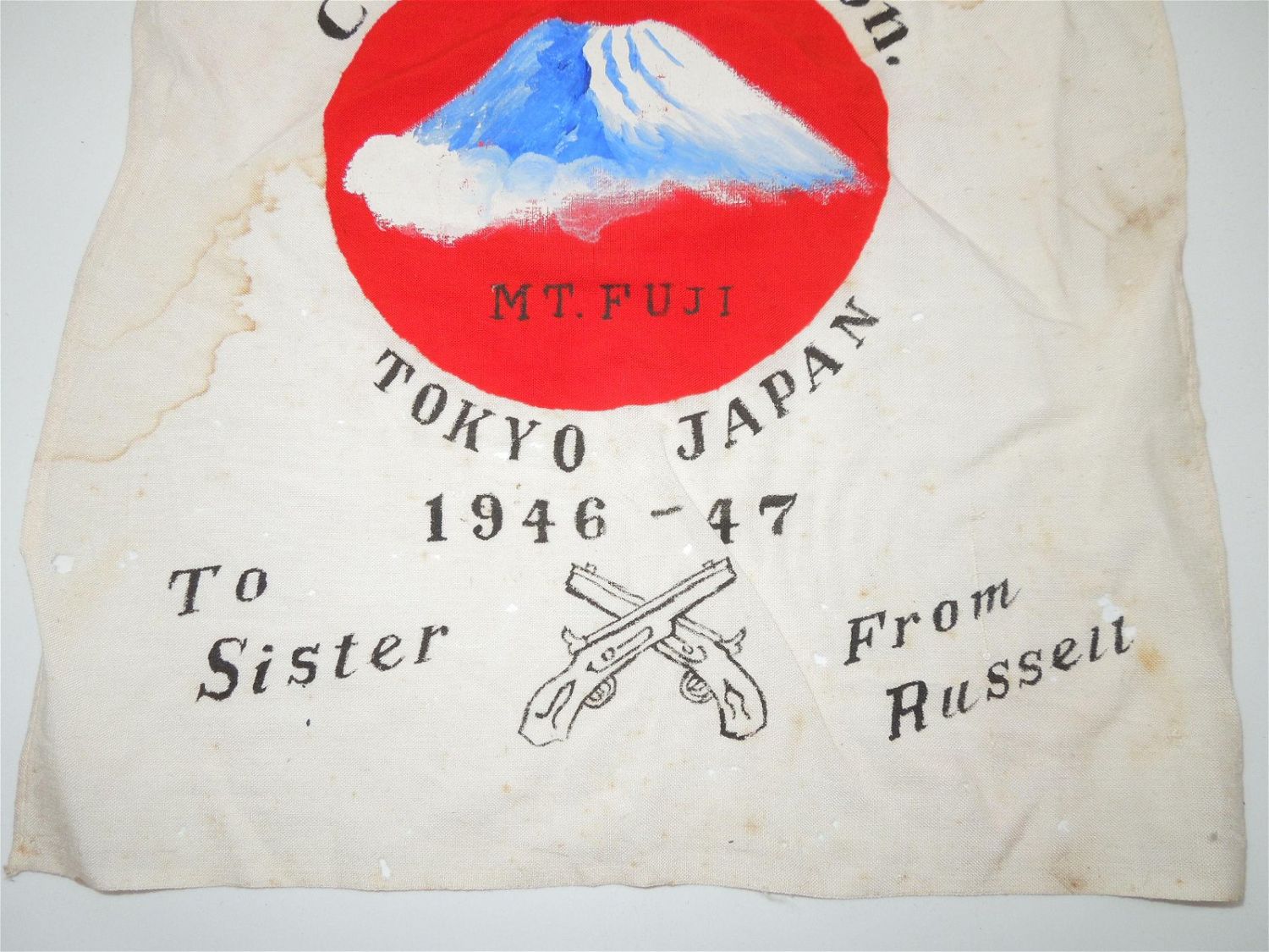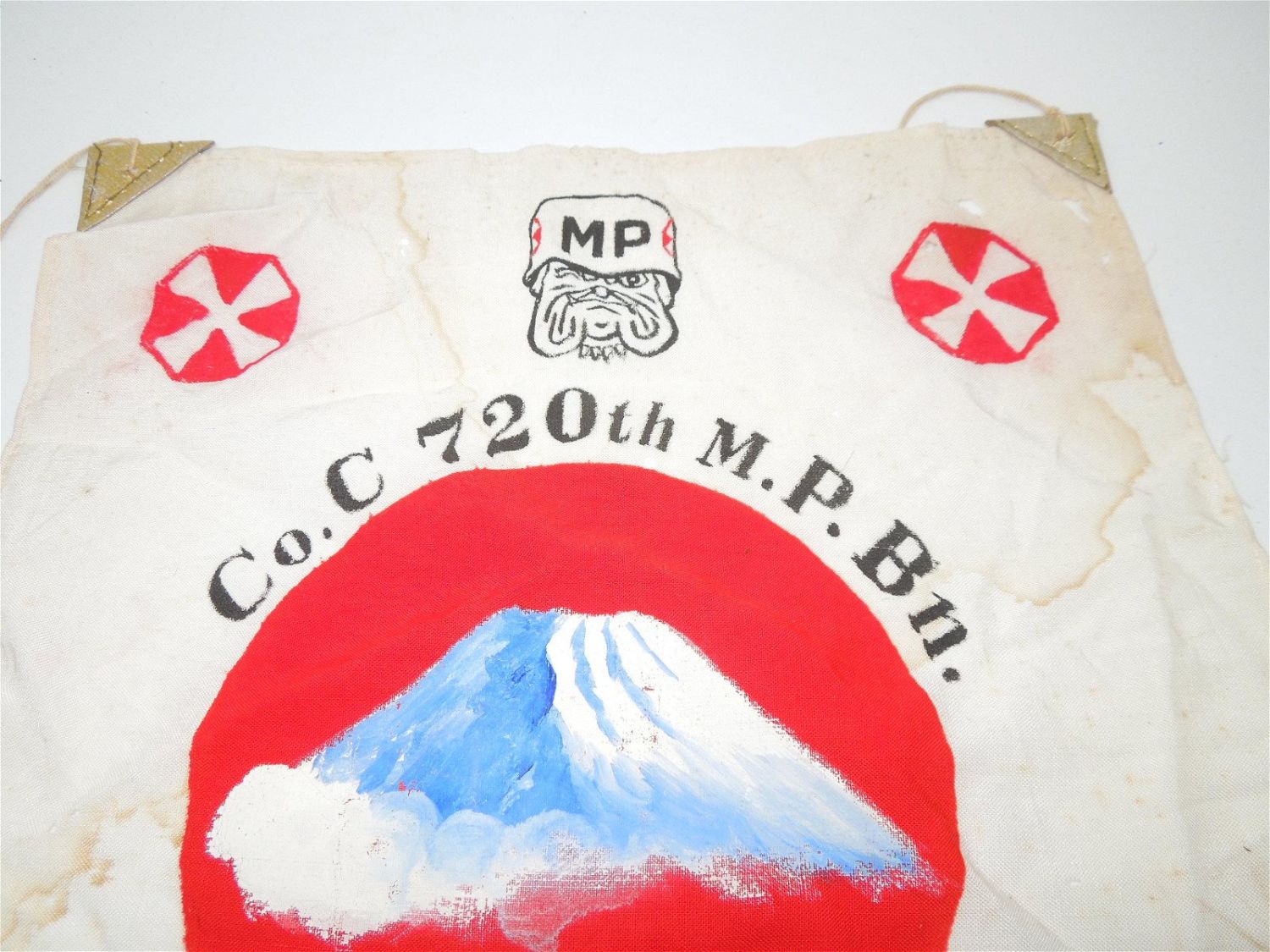 Eighth Army Company C, 720th Military Police Battalion Tokyo Japan 1946-1947 Silk Banner. Picture of Mount FUJI is painted in the center. Approximate size is 11 x 14 inches. This item is not in perfect condition. There are various size holes throughout the piece. Also, there is some sort of staining present. Still a decent piece for being over 70 years old.