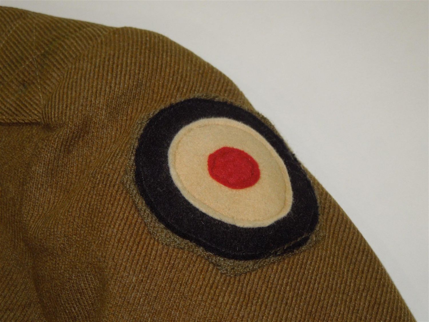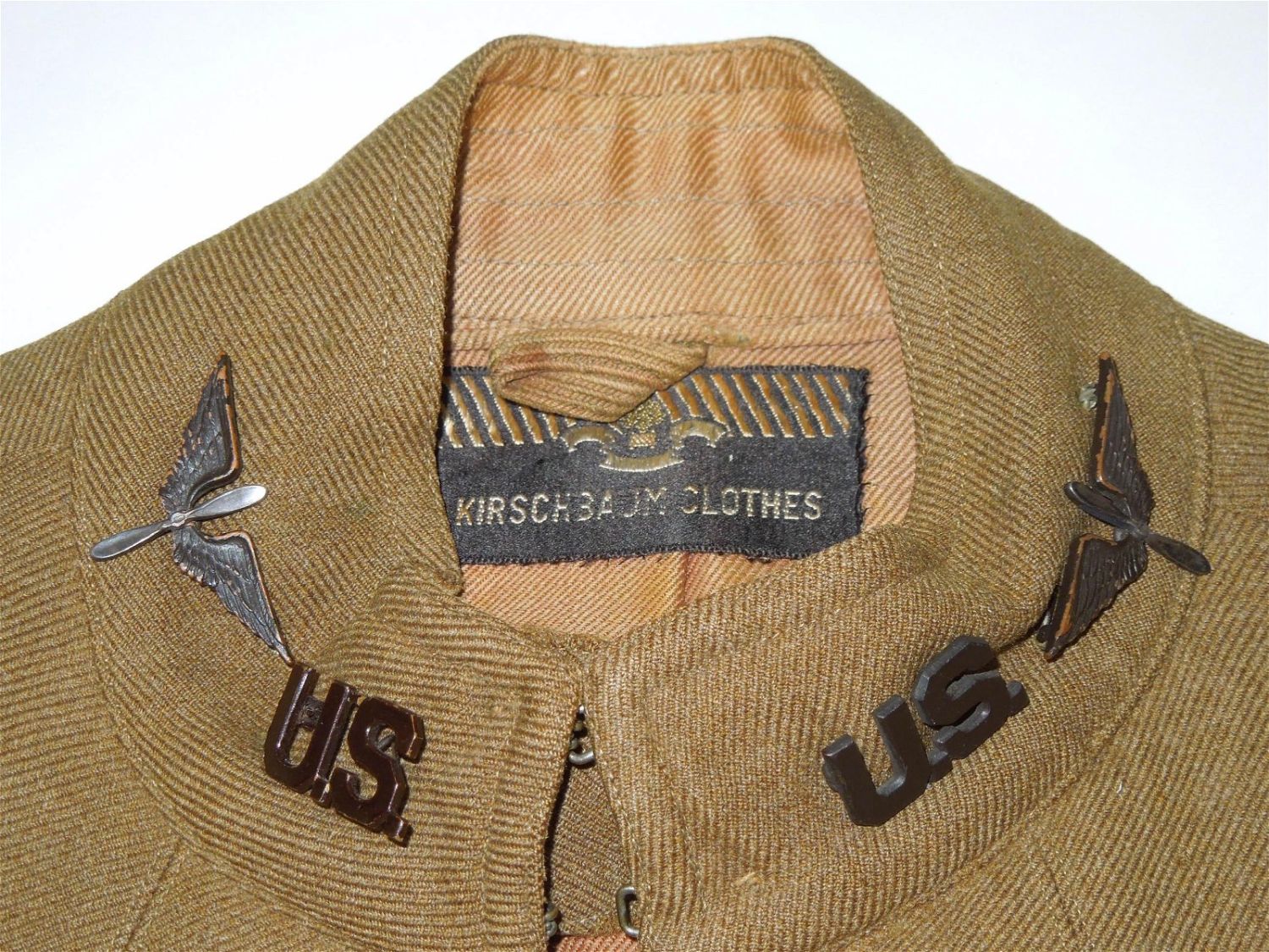 WWI US Army Air Service winter weight Officer jacket, with US and Air Service collar insignia. There is a machine sewn multi-layered wool Air Service patch on one sleeve. No name or ID. Jacket has some mothing and wear to the fabric.