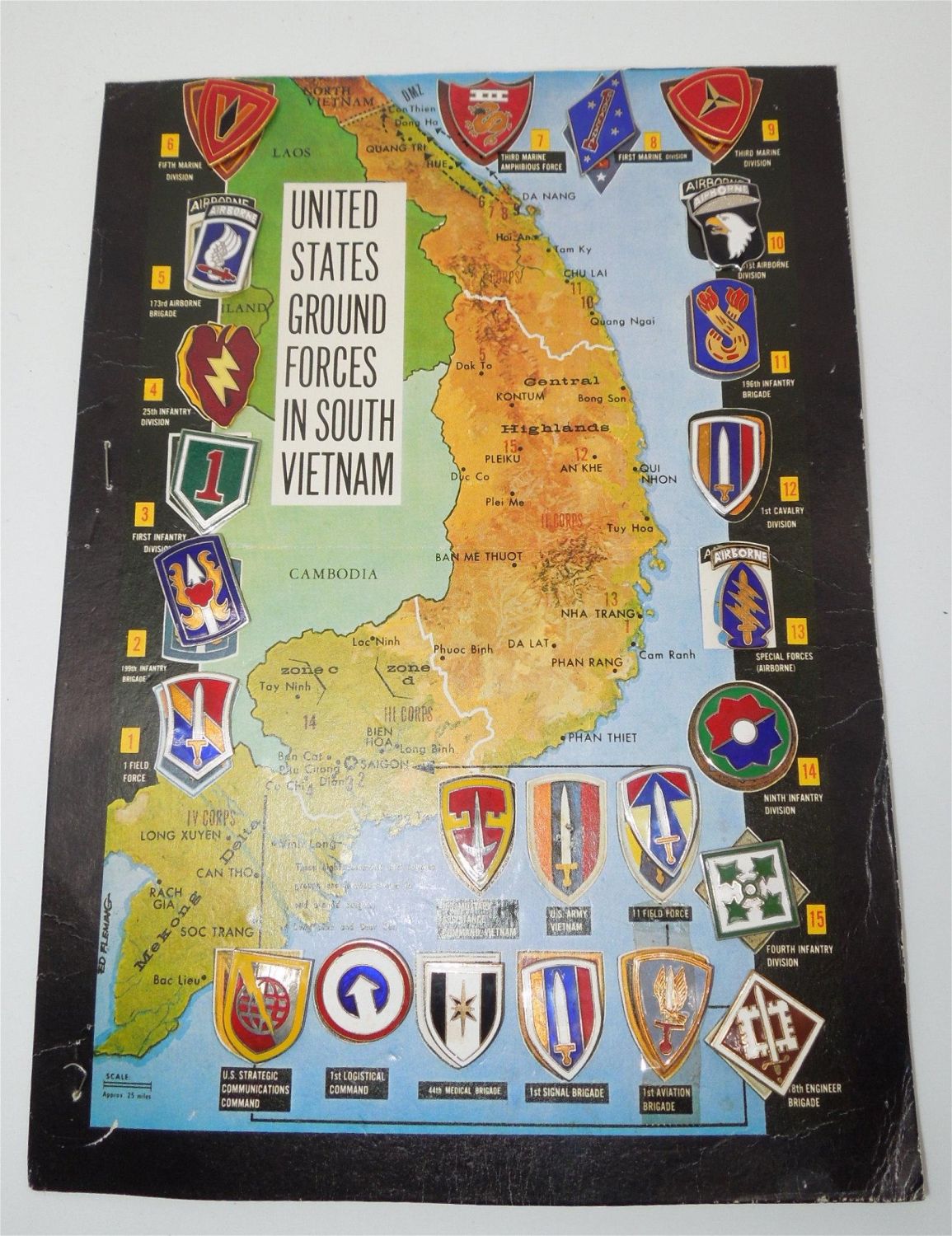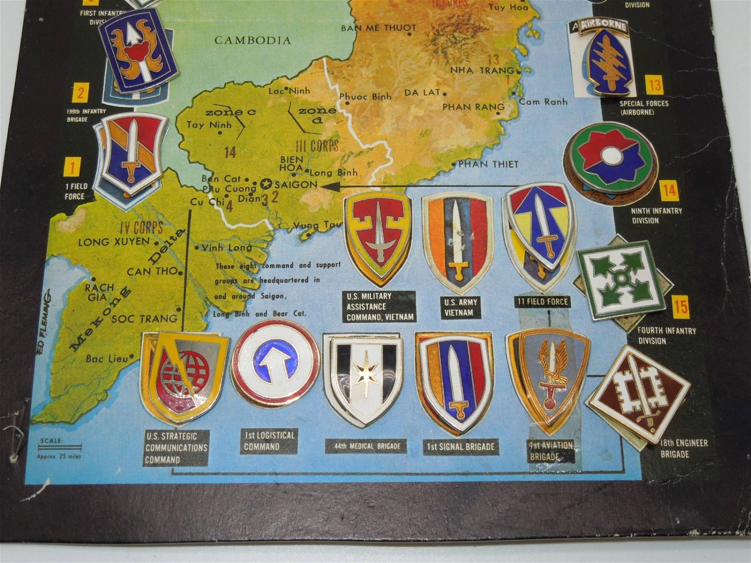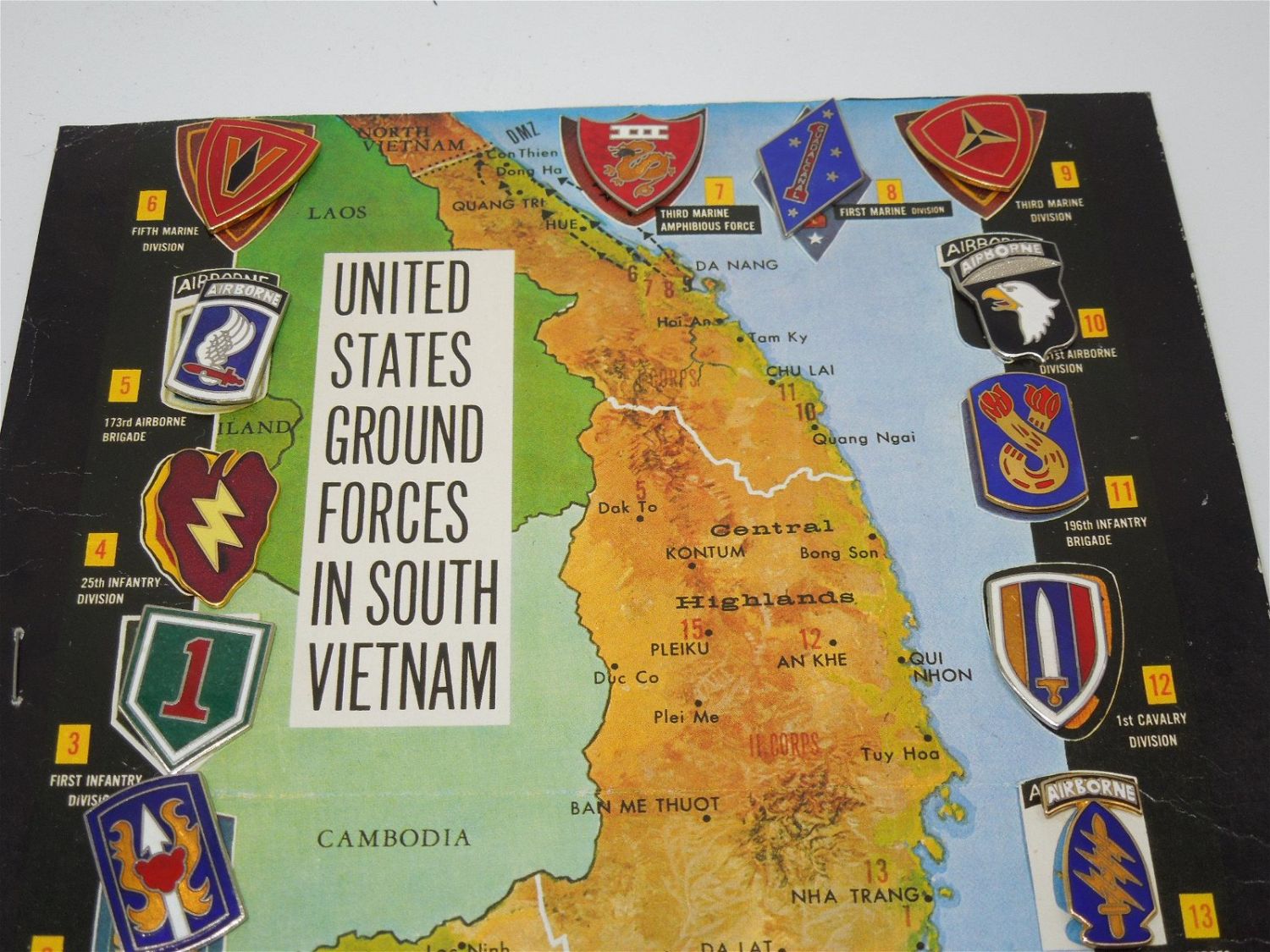 Original display board with 1960s – 70s era pins mounted on them showing the ground forces in Vietnam. Good condition.
