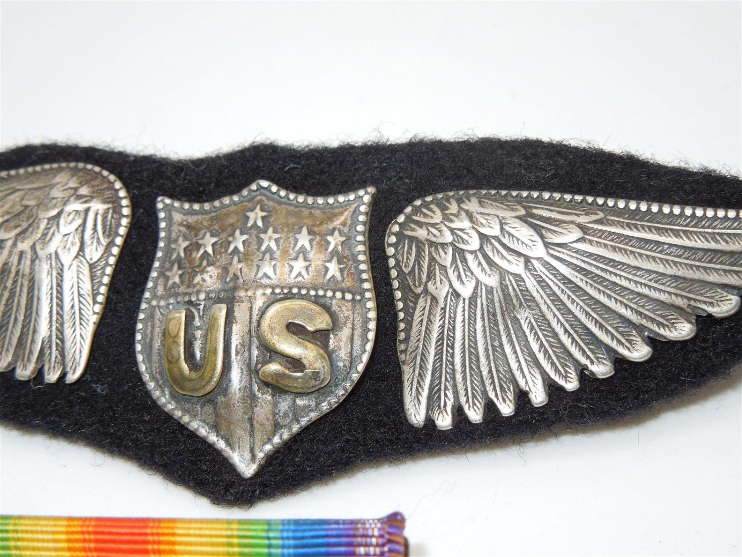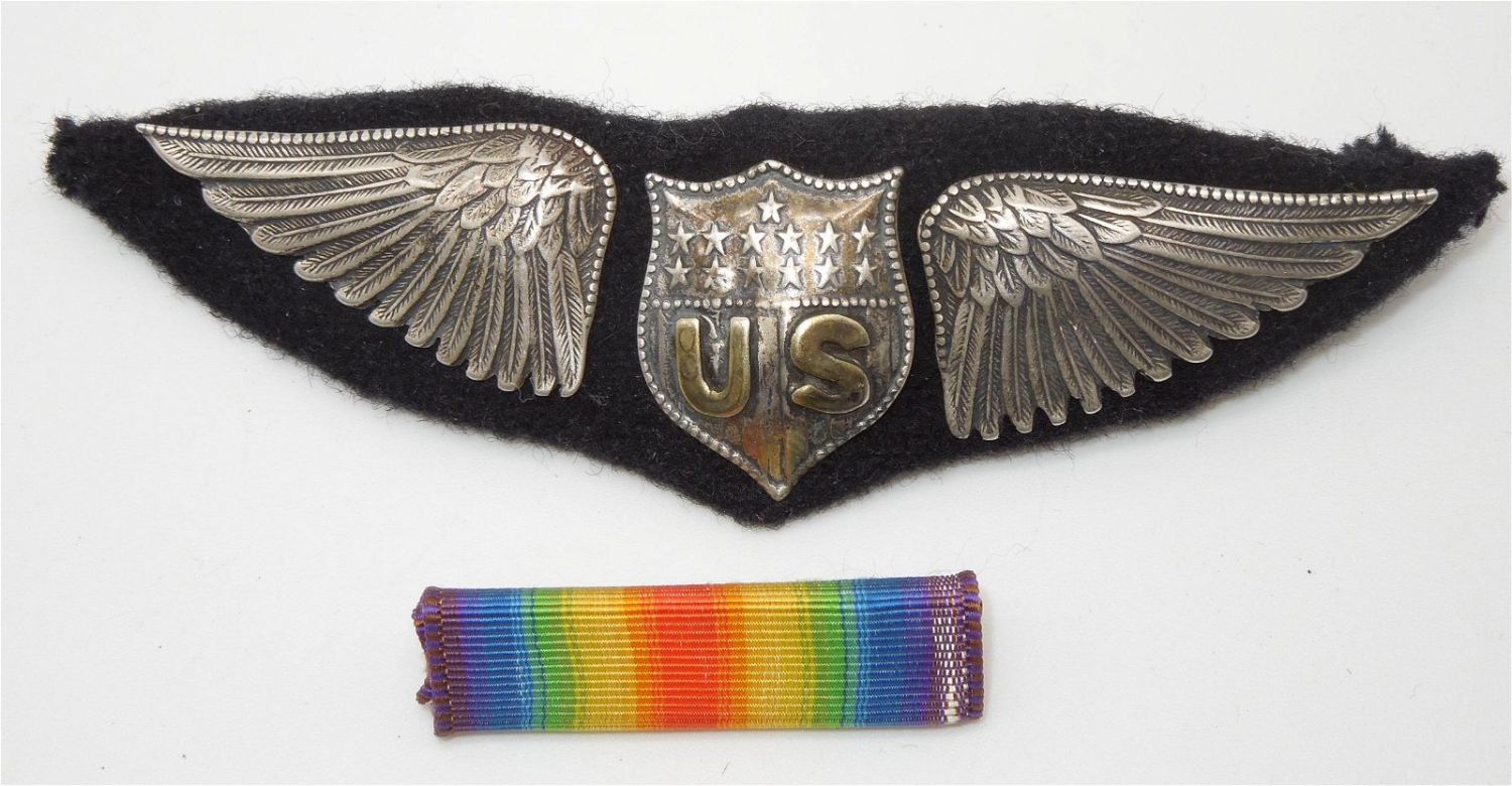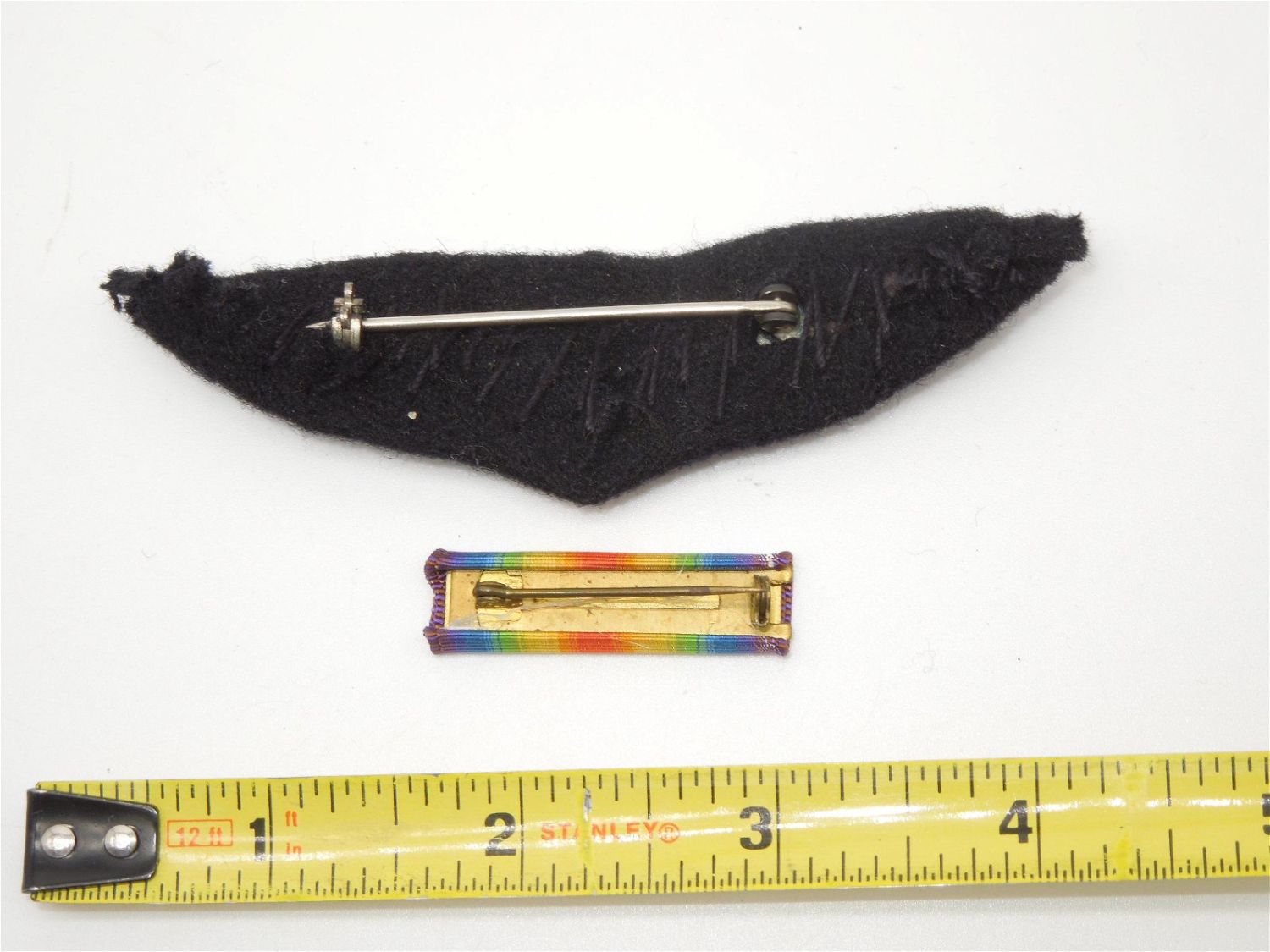 Reproduction full sized metal pin back wings and modern WWI Victory ribbon bar. Perfect for a restoration. Condition: See description for condition report.