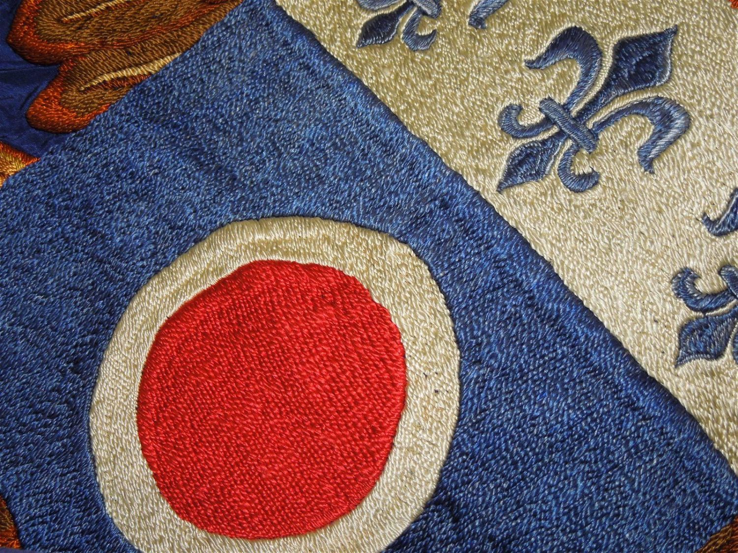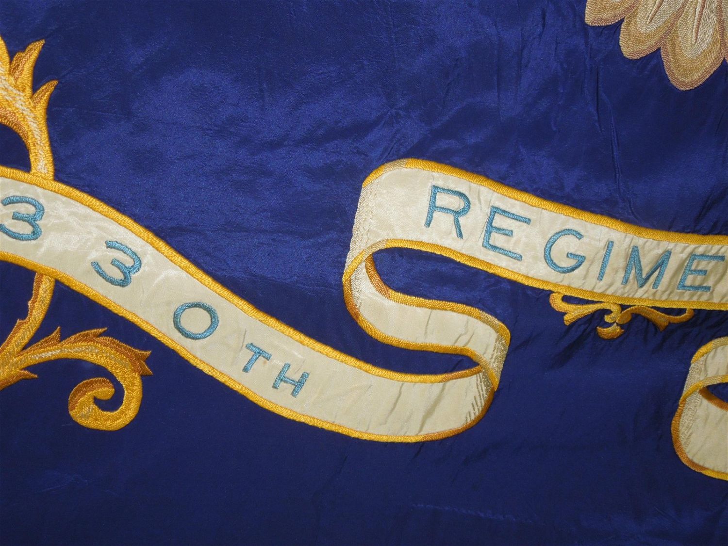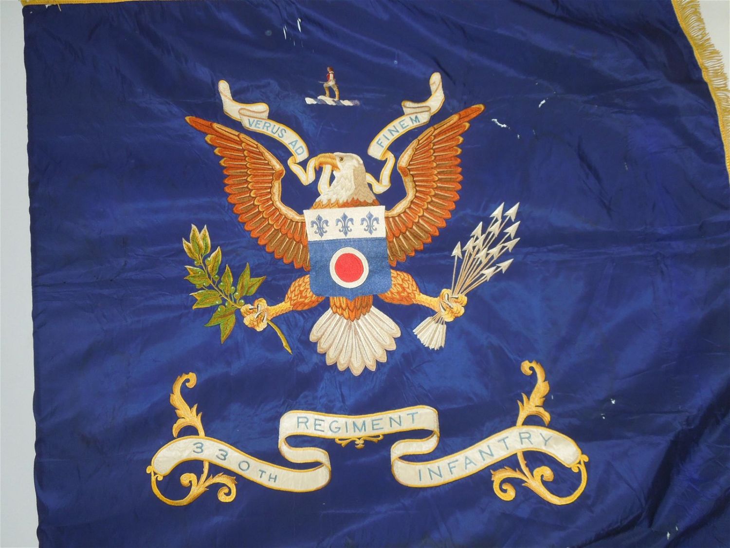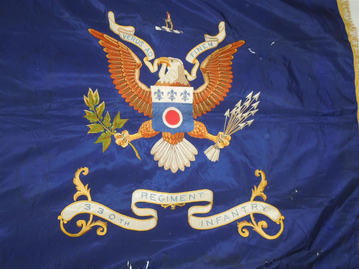 Full sized WWII era Quartermaster Issued flag of the 330th Infantry Regiment, 83rd Infantry Division from the ETO. Well made and embroidered on a thick silk like material, each regiment had ONE flag at a time until retired. This one has numerous small holes around the edges and throughout that likely necessitated a replacement. These are exceedingly difficult to obtain due to so few being made. Each side retains the leather strap and faded QM label. Excellent display piece. Approximate size is 53 inches by 64 inches.