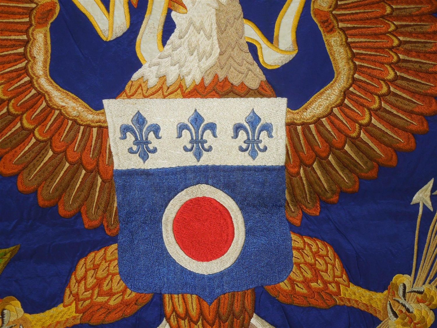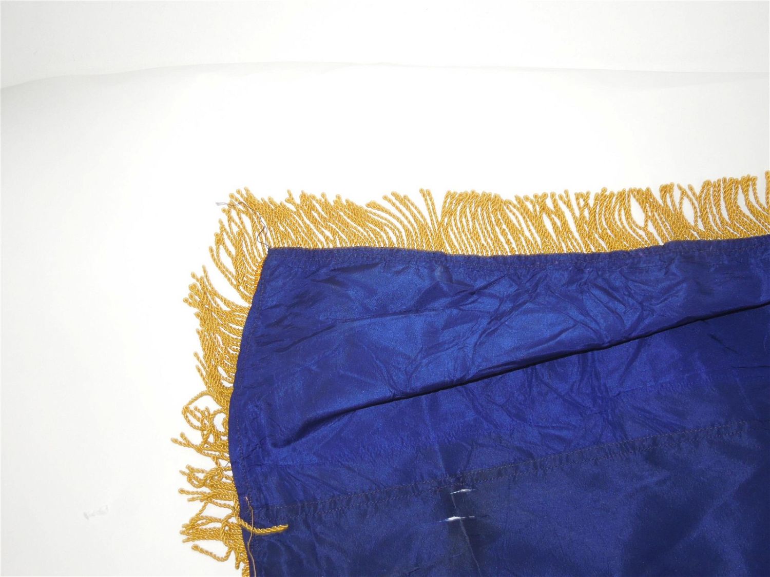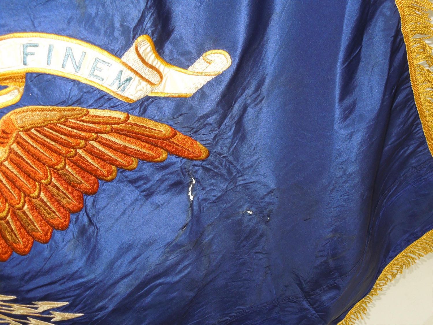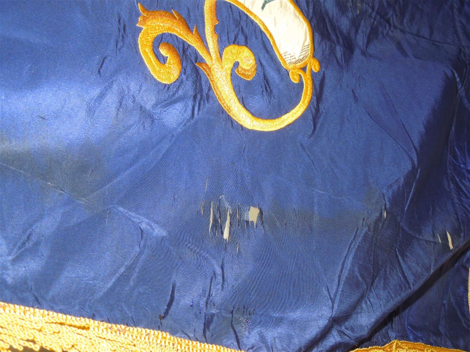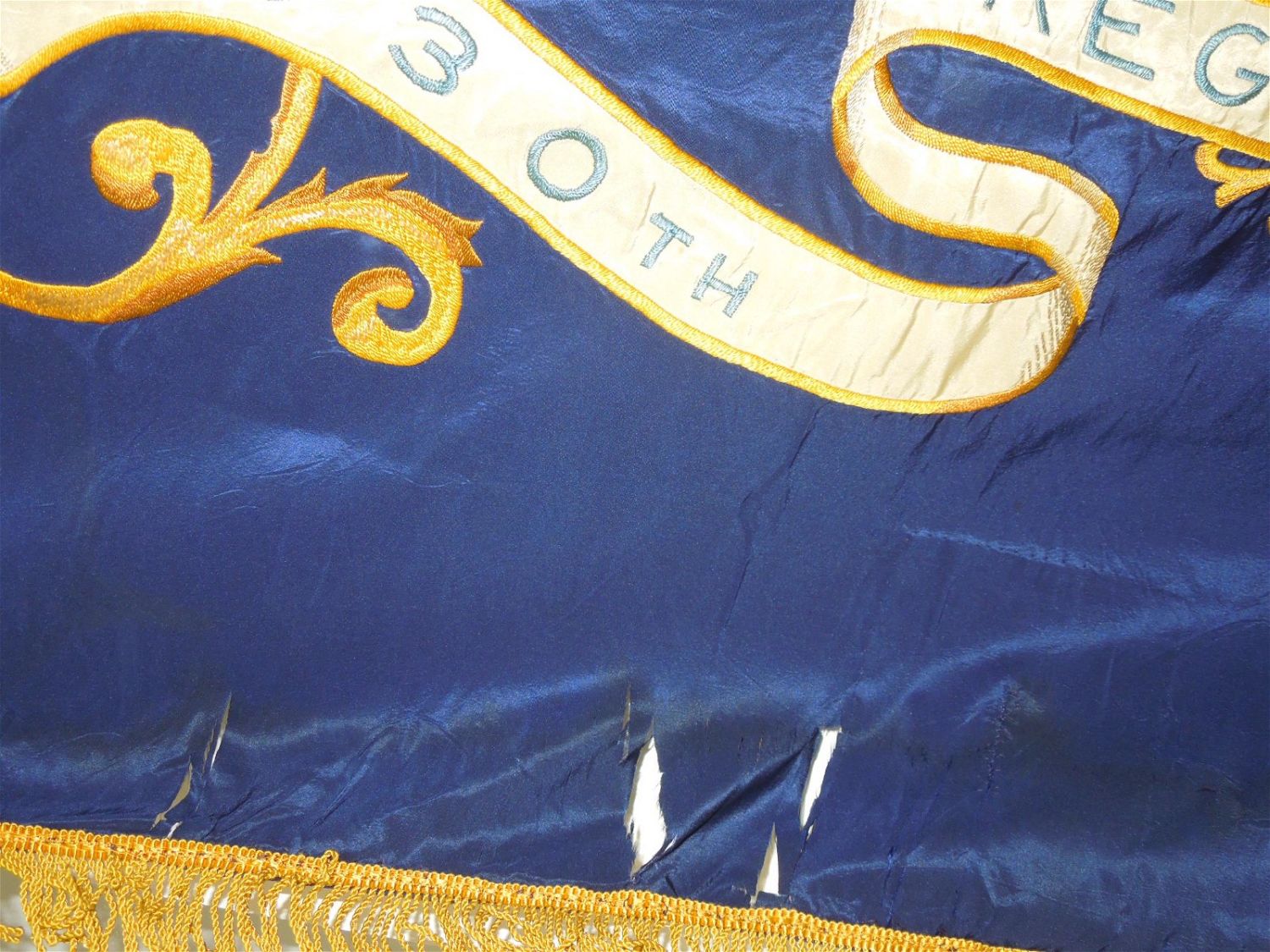 Full sized WWII era Quartermaster Issued flag of the 330th Infantry Regiment, 83rd Infantry Division from the ETO. Well made and embroidered on a thick silk like material, each regiment had ONE flag at a time until retired. This one has numerous small holes around the edges and throughout that likely necessitated a replacement. These are exceedingly difficult to obtain due to so few being made. Each side retains the leather strap and faded QM label. Excellent display piece. Approximate size is 53 inches by 64 inches.