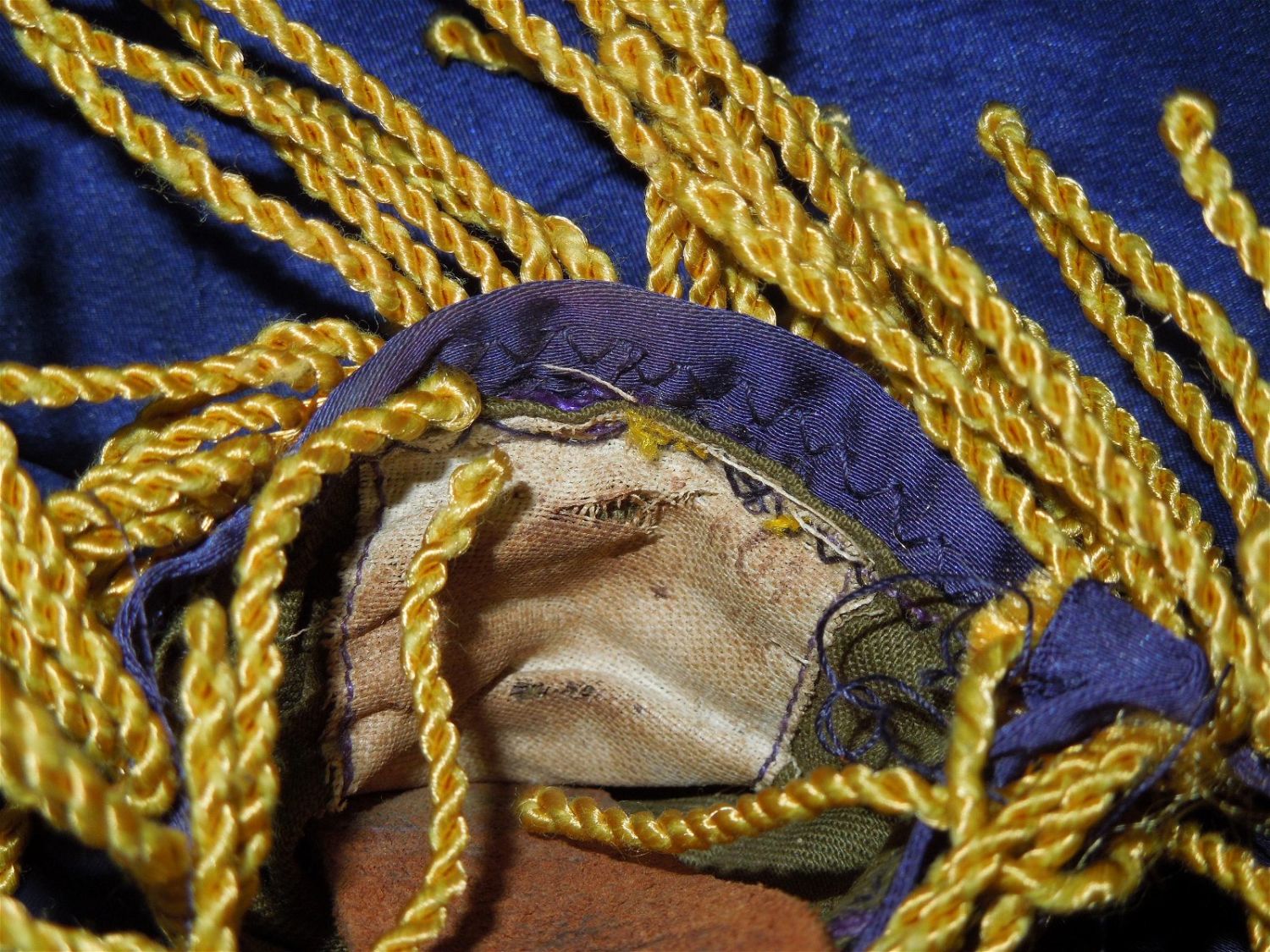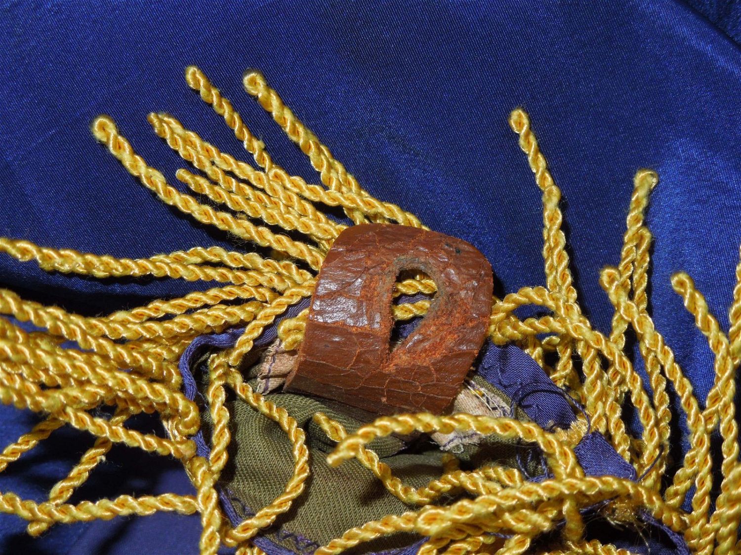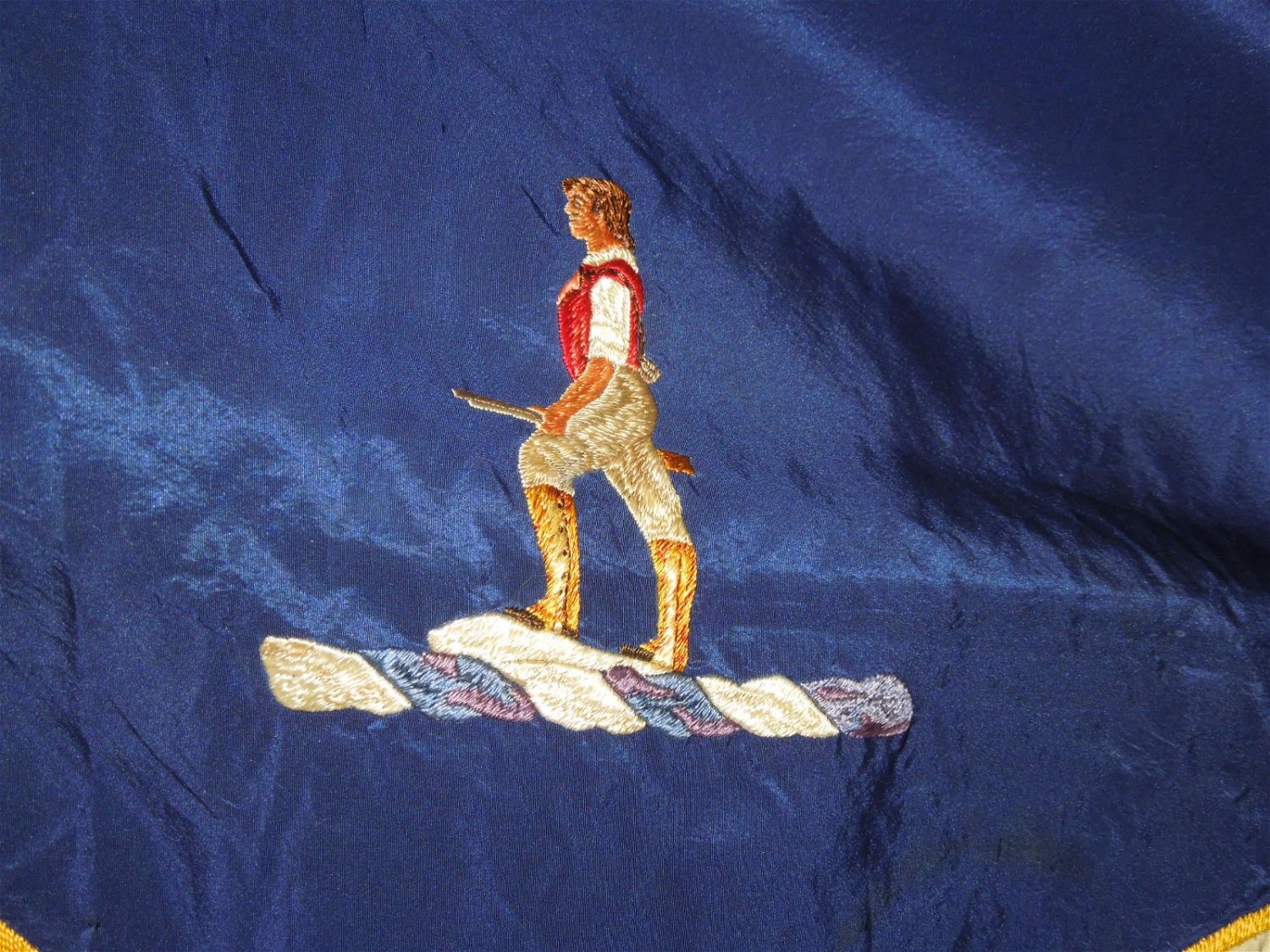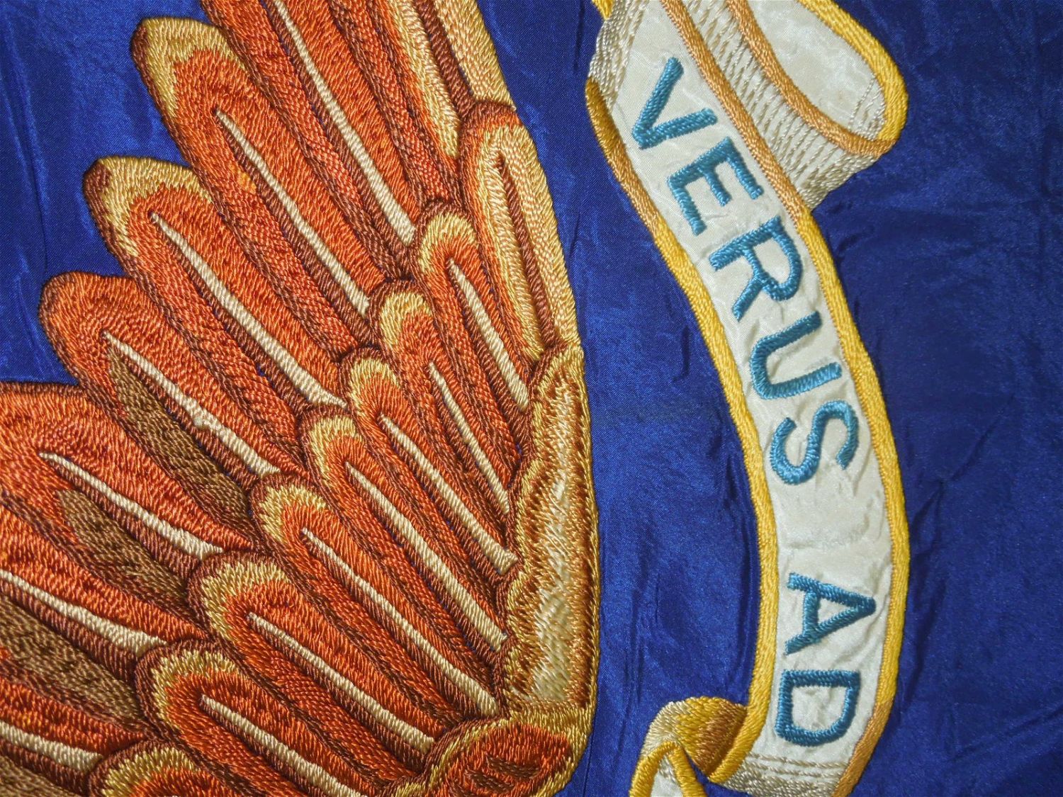 Full sized WWII era Quartermaster Issued flag of the 330th Infantry Regiment, 83rd Infantry Division from the ETO. Well made and embroidered on a thick silk like material, each regiment had ONE flag at a time until retired. This one has numerous small holes around the edges and throughout that likely necessitated a replacement. These are exceedingly difficult to obtain due to so few being made. Each side retains the leather strap and faded QM label. Excellent display piece. Approximate size is 53 inches by 64 inches.