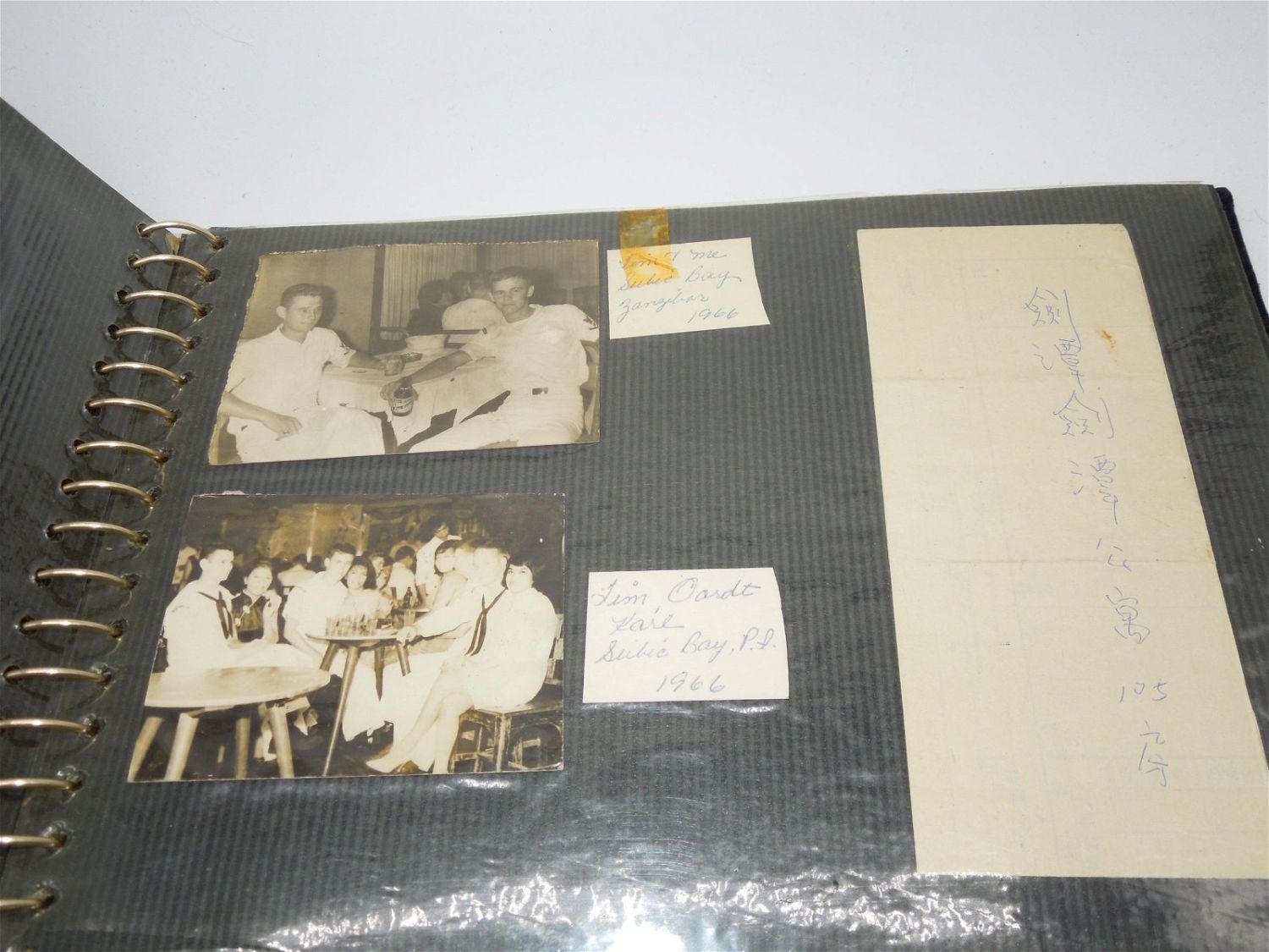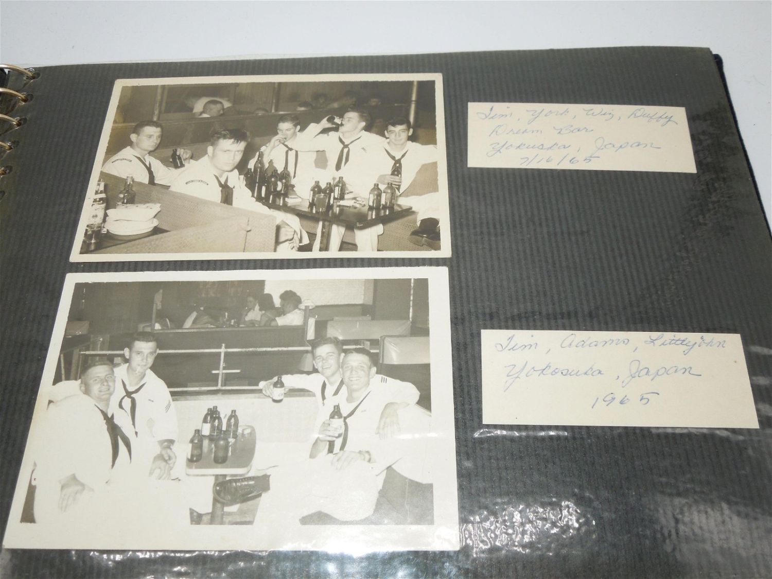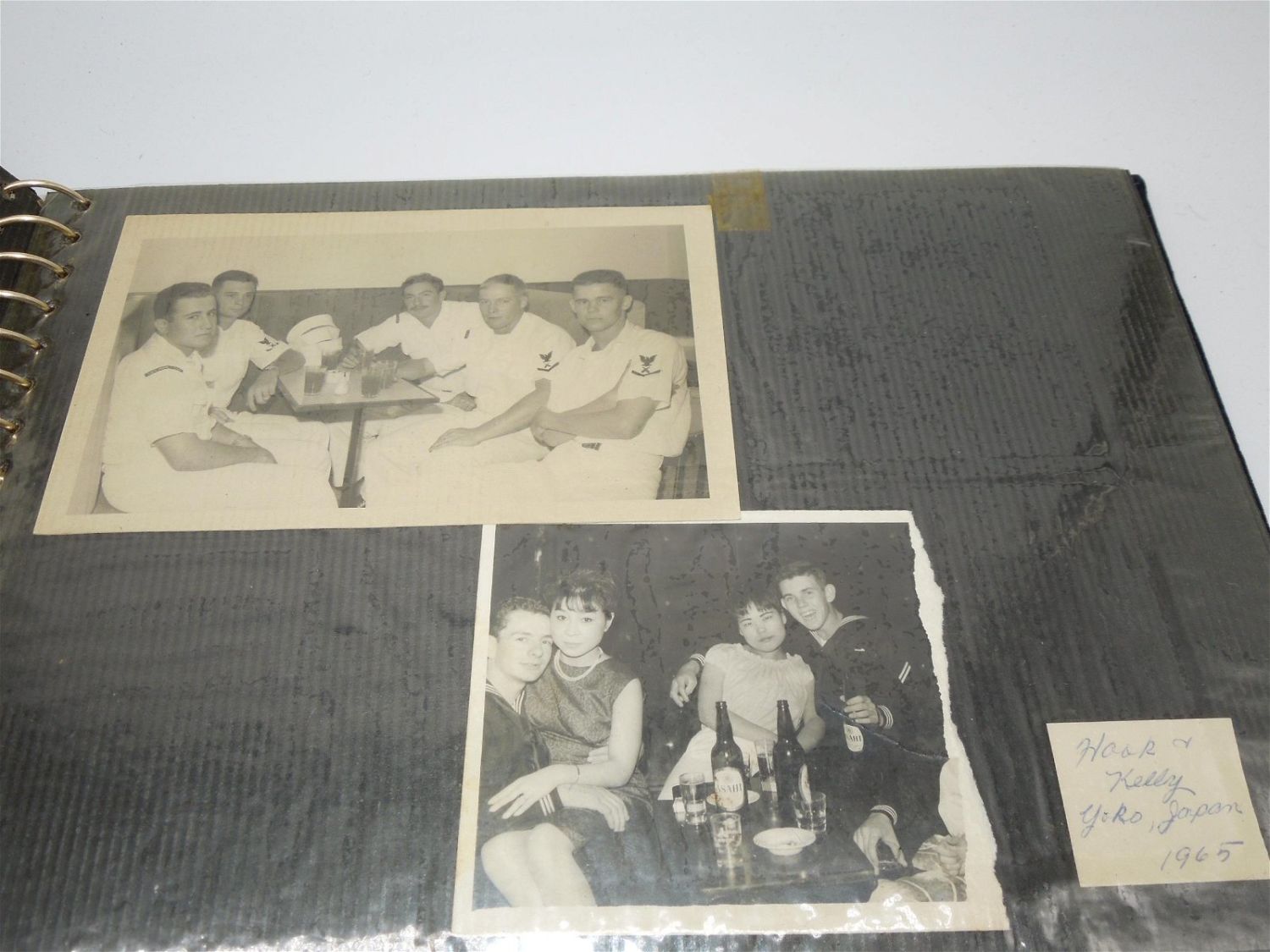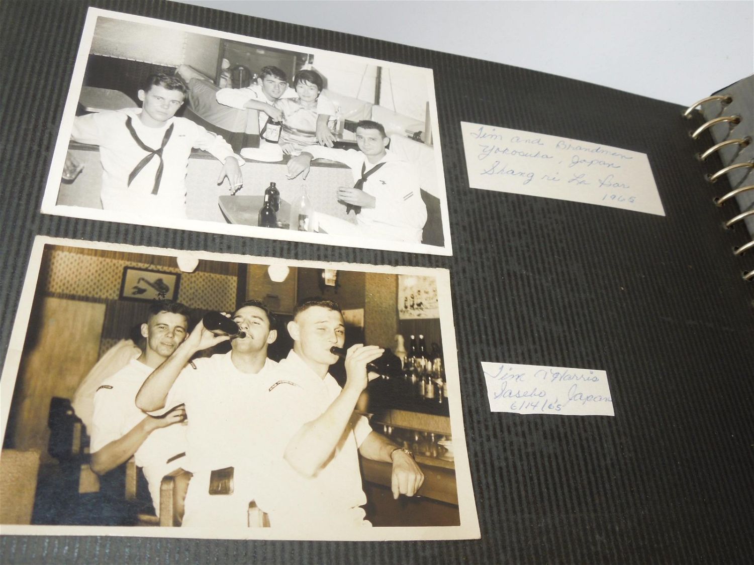 Vintage themed photo album with a decorative velvet like cover, with many photos and items from a 1965 trip to the far east aboard a US Ship.