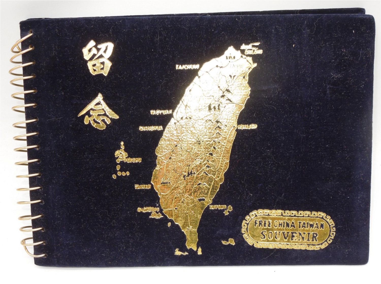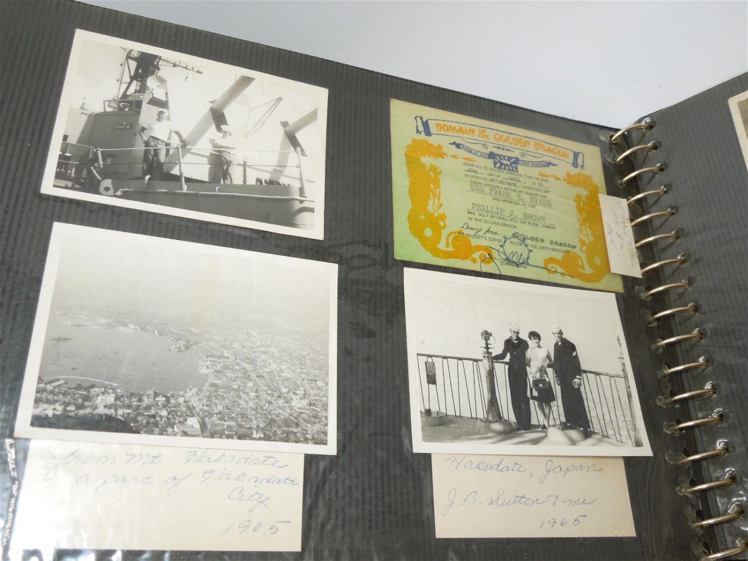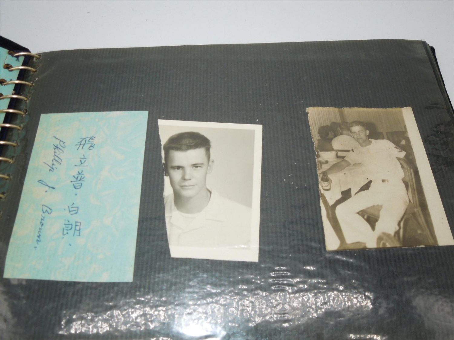 Vintage themed photo album with a decorative velvet like cover, with many photos and items from a 1965 trip to the far east aboard a US Ship.