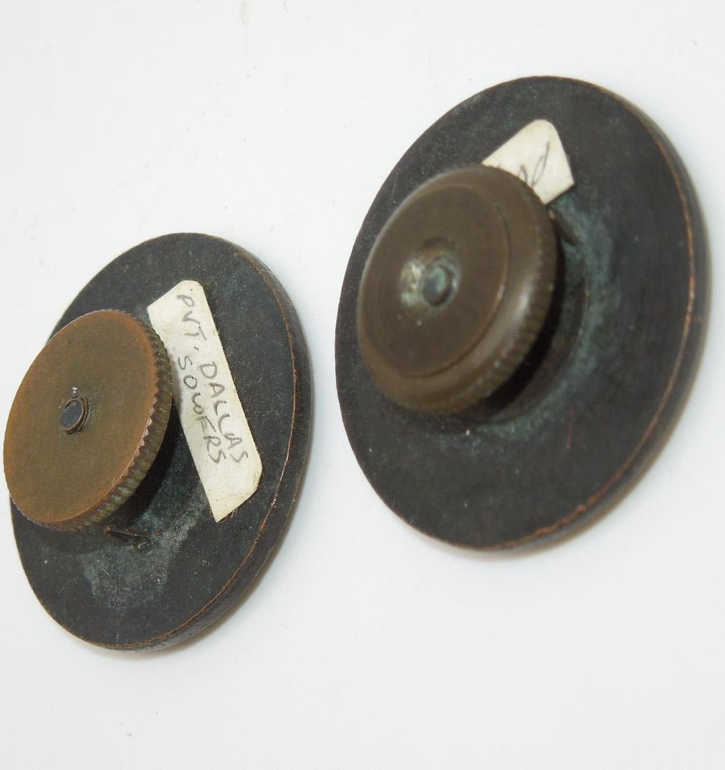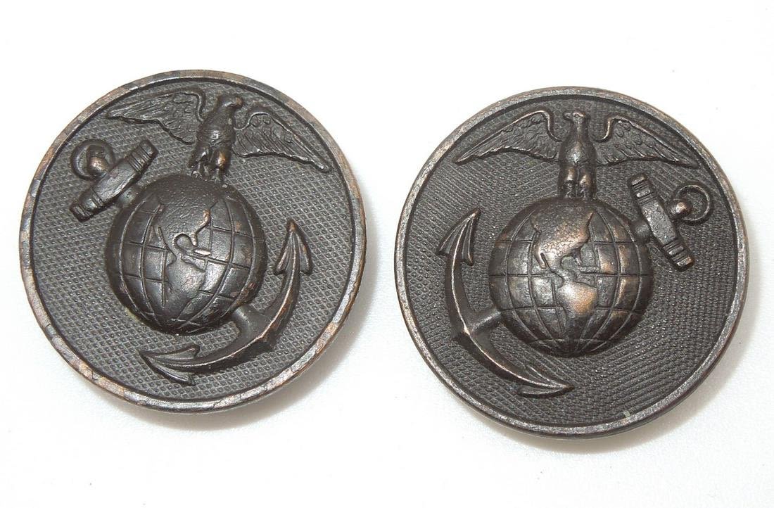 Original WWI Eagle Globe and Anchor uniform screw back collar discs identified to Pvt. Dallas L. Sowers. He served at the Marine Barracks in Parris Island, SC from 1917-1919 and was from Maryland. Good condition with some wear to the front.