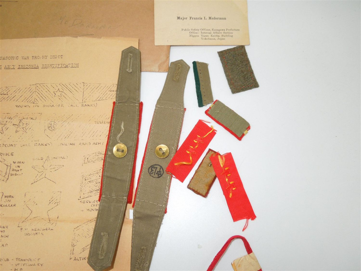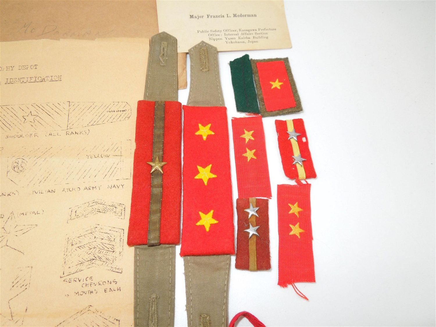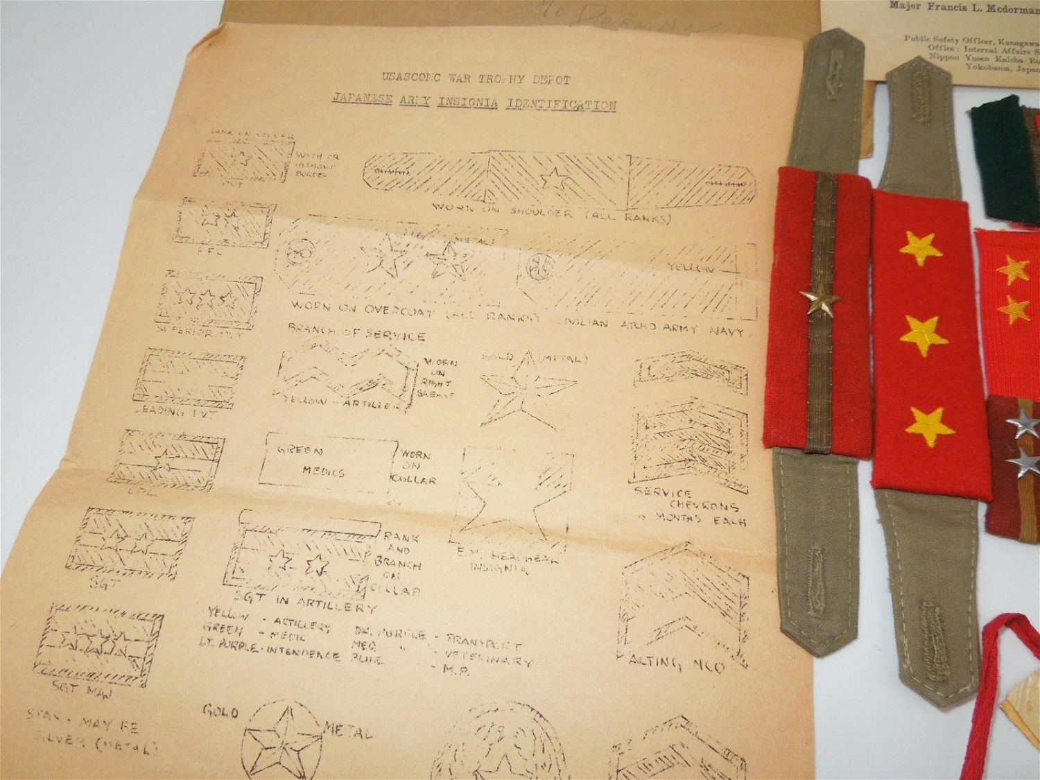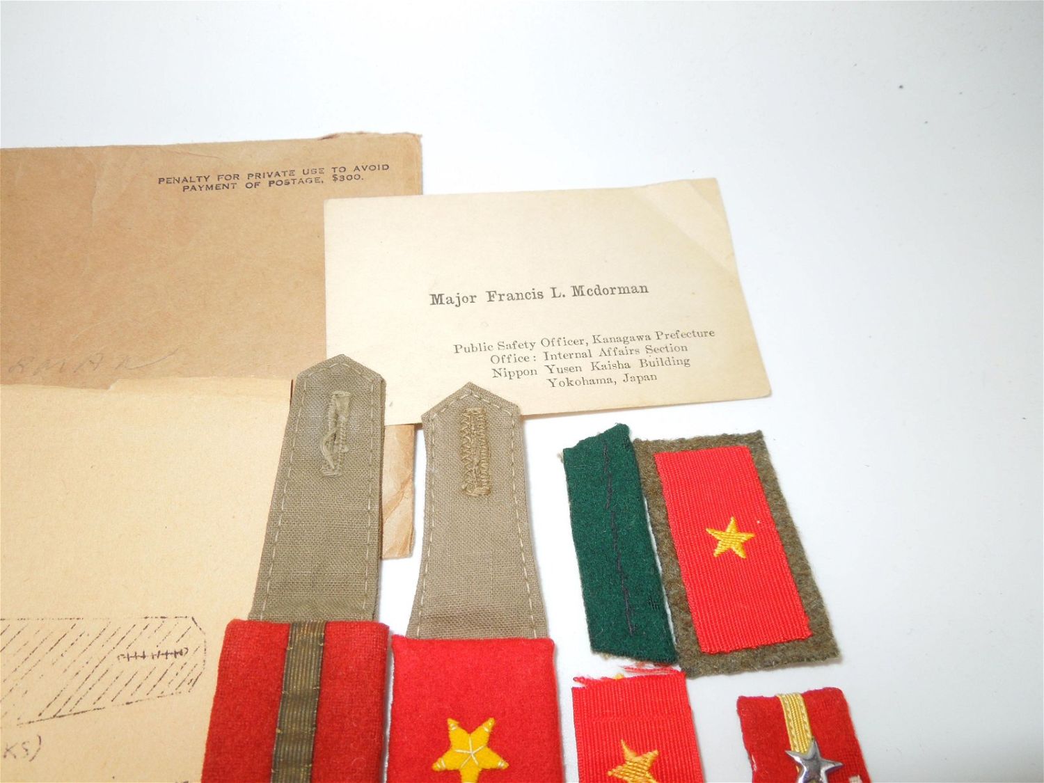Original lot of captured Japanese WWII rank insignias that came in an envelope with a document describing them and a card from the officer who served as a Major in the embassy after the war. Also some copies of documents from the family.