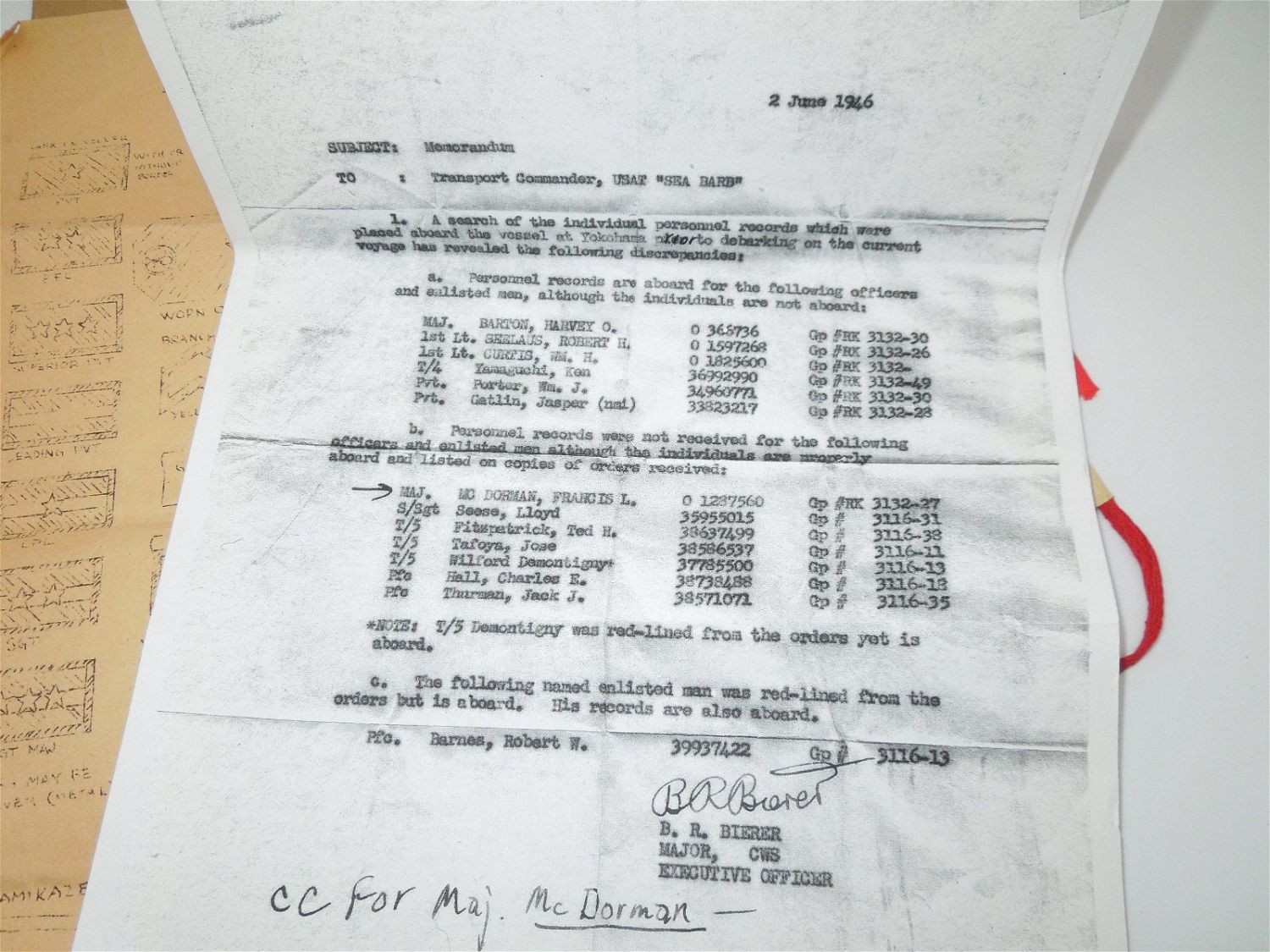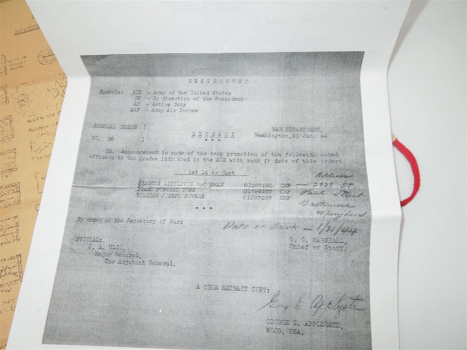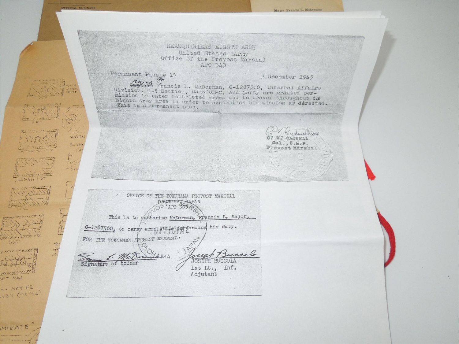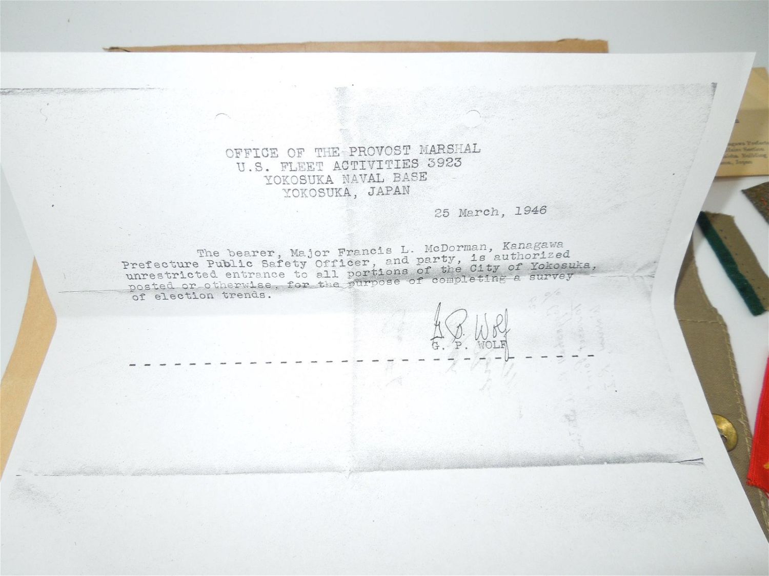 Original lot of captured Japanese WWII rank insignias that came in an envelope with a document describing them and a card from the officer who served as a Major in the embassy after the war. Also some copies of documents from the family.