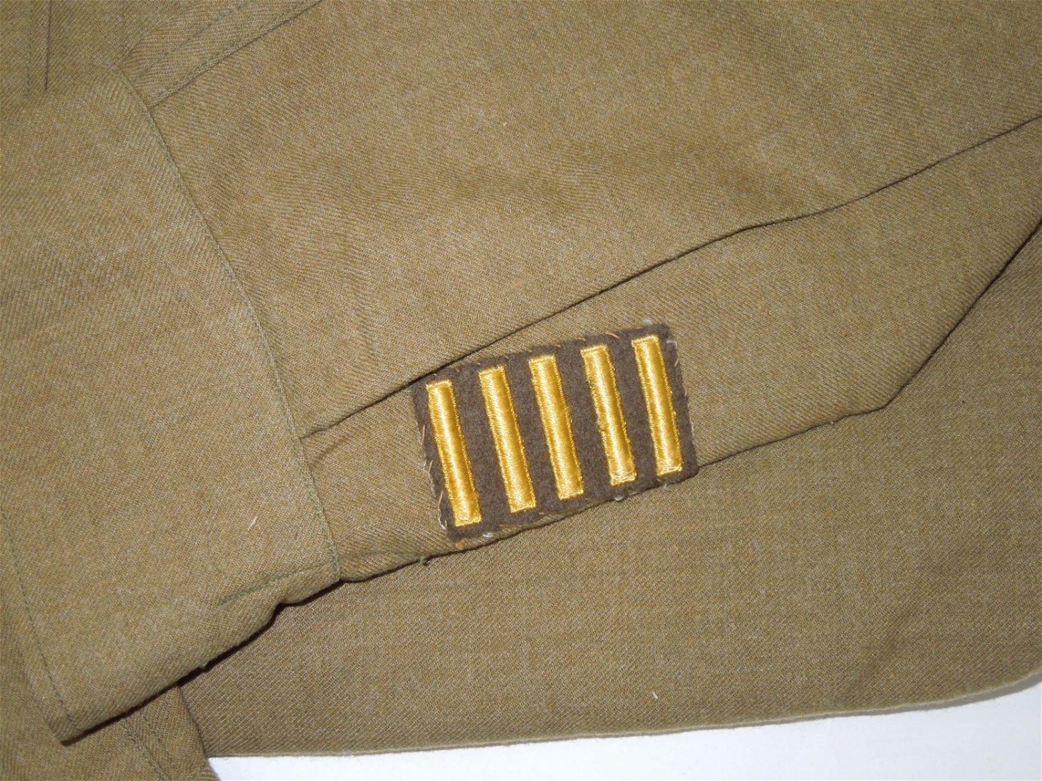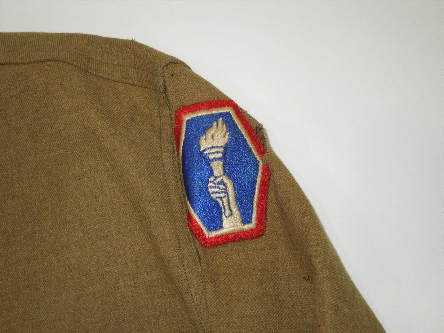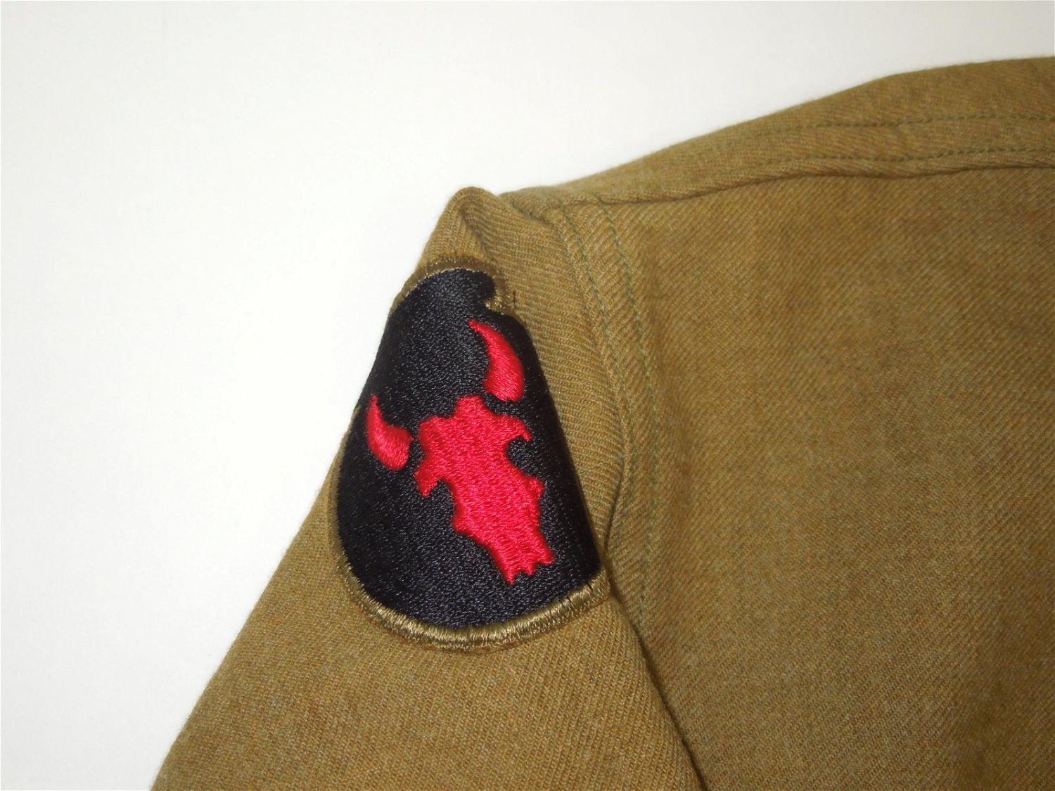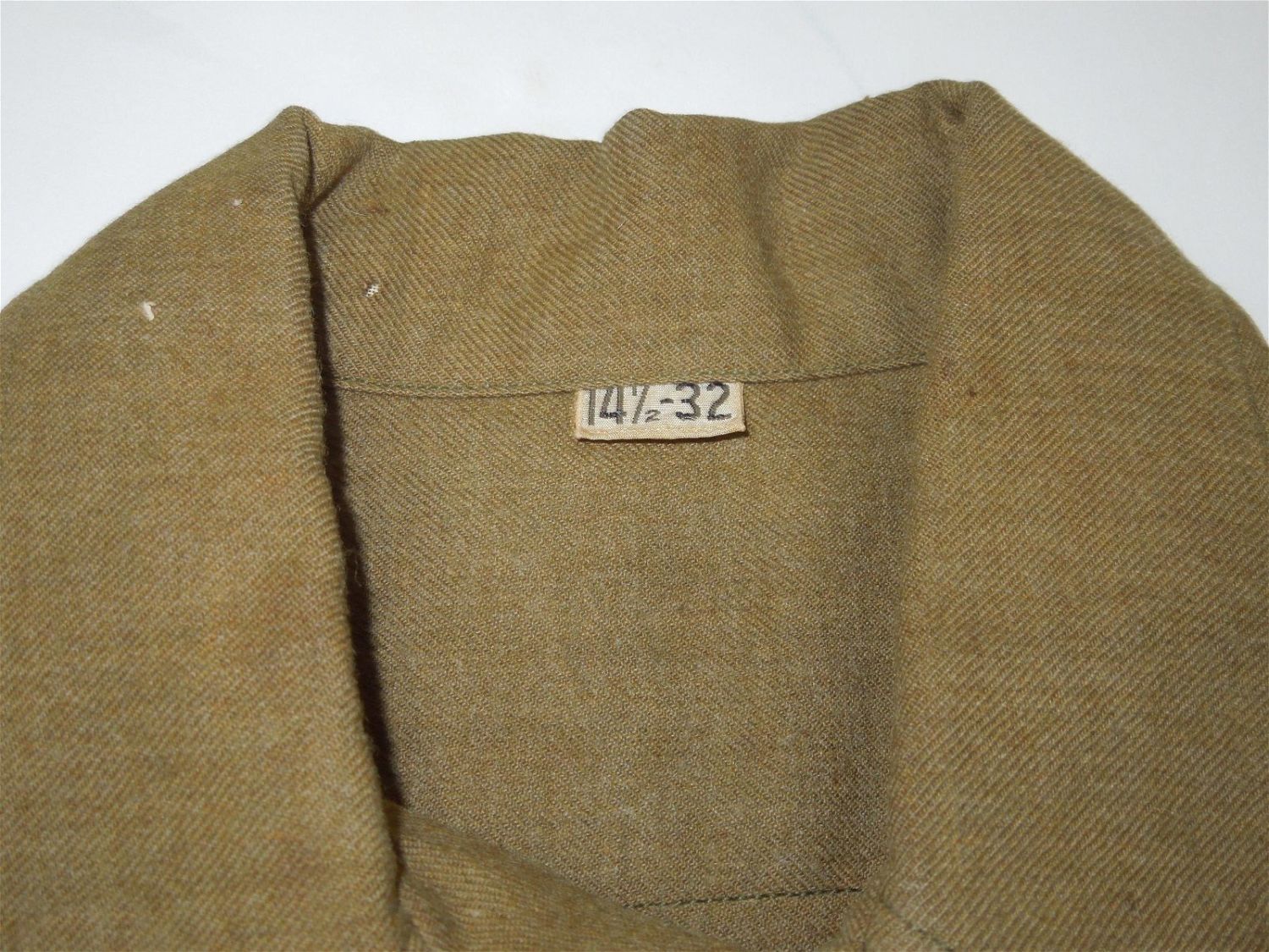 WWII U.S. Army 442nd RCT & 34th Infantry Division Japanese American Uniform Shirt. Size is 14.5 – 32. There is some mothing and holes on the shoulder and arm. The front of the shirt displays nicely.