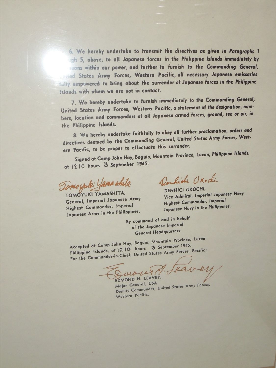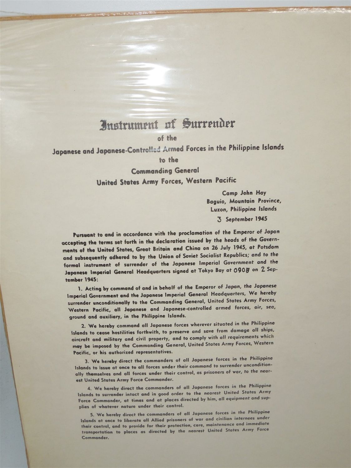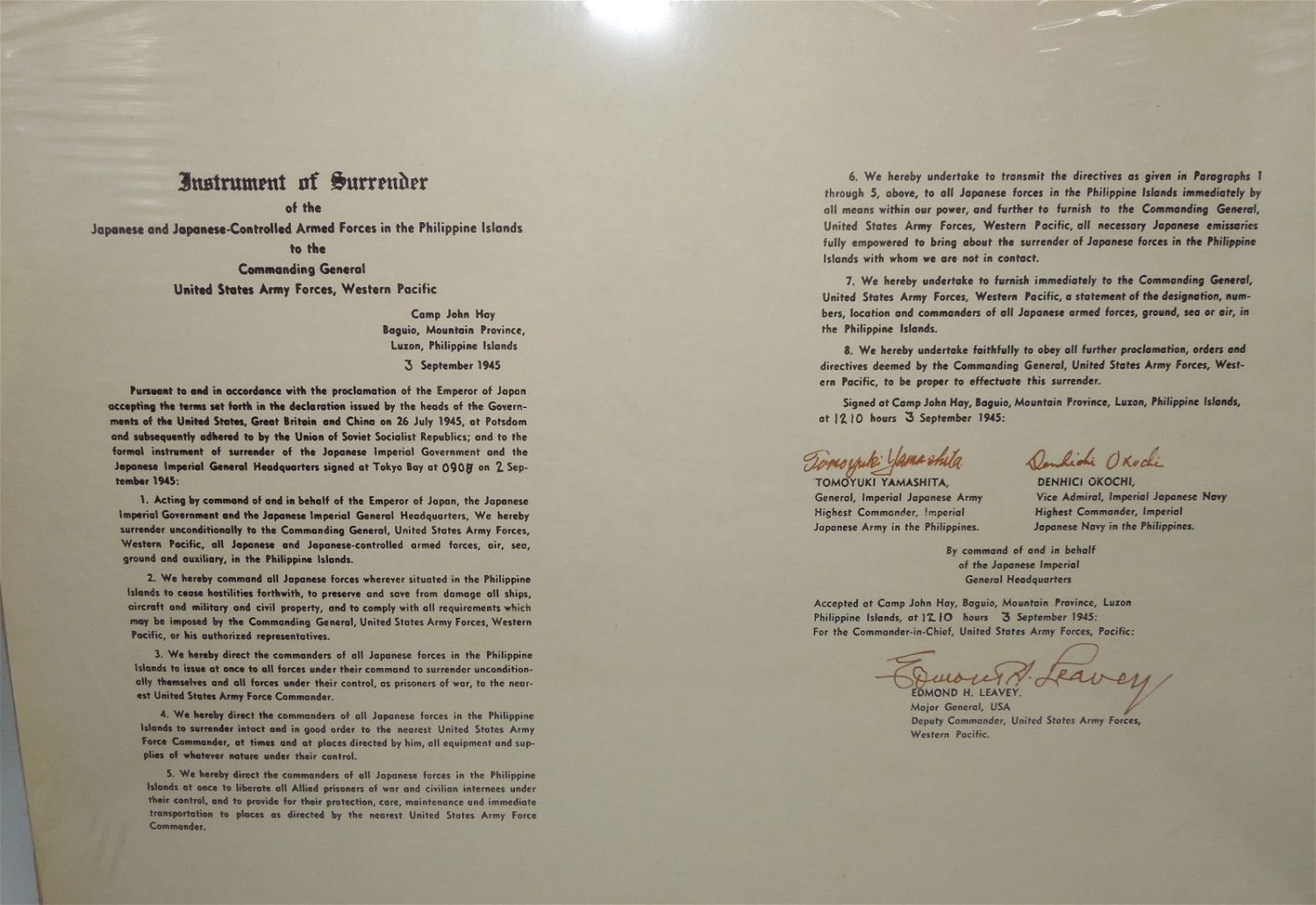 Instrument of Surrender of the Japanese and Japanese-Controlled Armed Forces in the Philippine Islands to the Commanding General United States Army Forces, Western Pacific. This is a copy of the instrument with which all Japanese controlled forces in the Philippine Islands surrendered in World War II. It was signed at Camp John Hay, Luzon, Philippine Islands by General Tomoyuki Yamashita, Vice Admiral Denhici Okochi, and Major General Edmond H. Leavey. This official copy of the Japanese surrender in the Philippines, was signed by General Yamashita the, "Tiger of Malaysia, " who was later tried and hanged for war crimes. Approximate size is 20 x 15 inches. Nice condition. The reverse of the document can not be photographed because it is encased in a plastic wrap for protection.