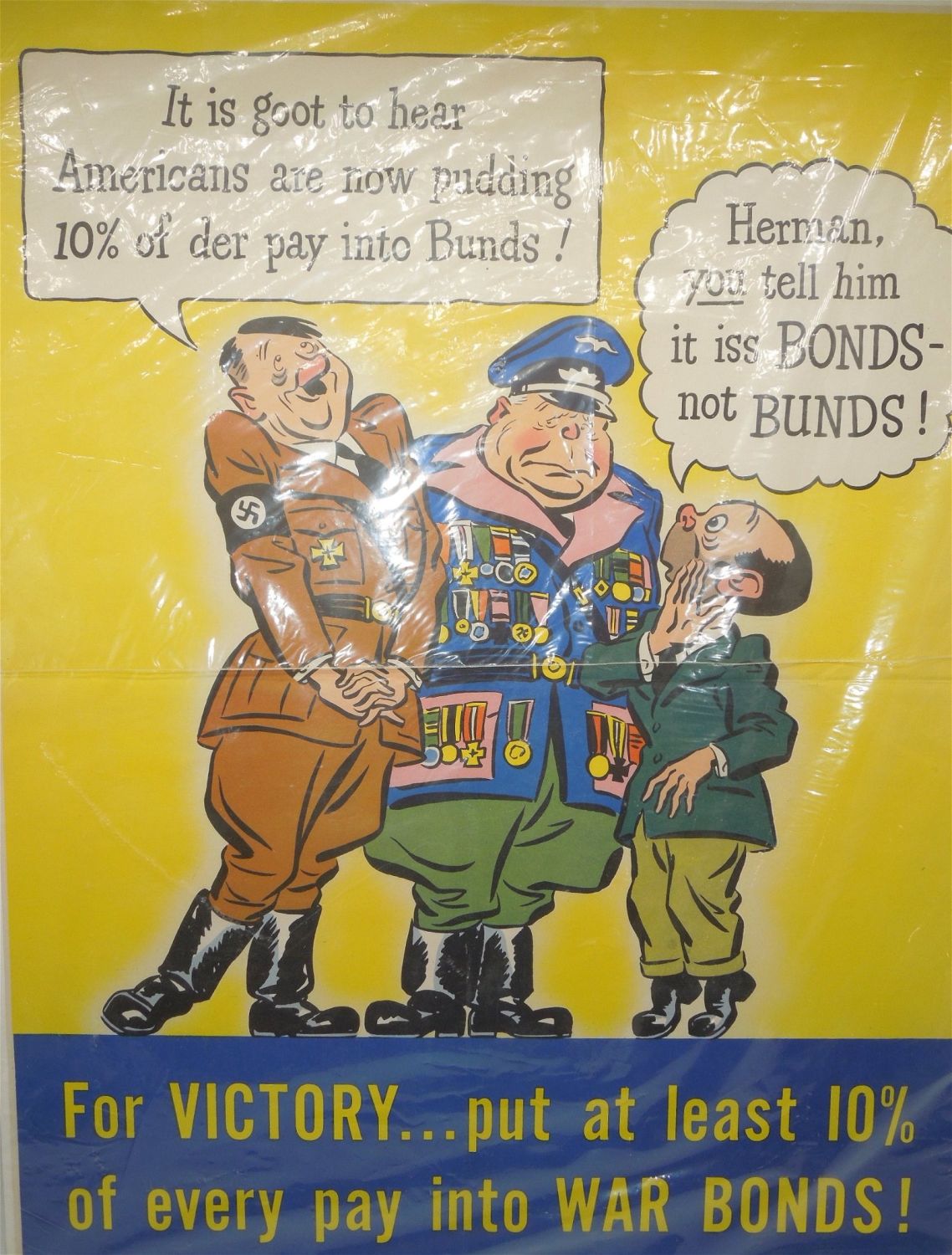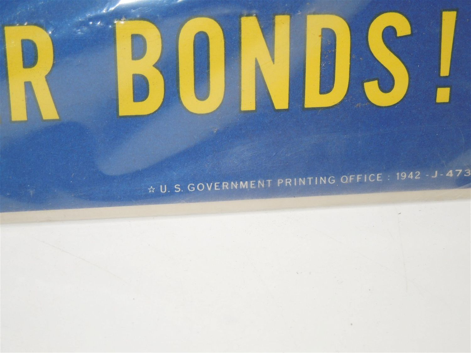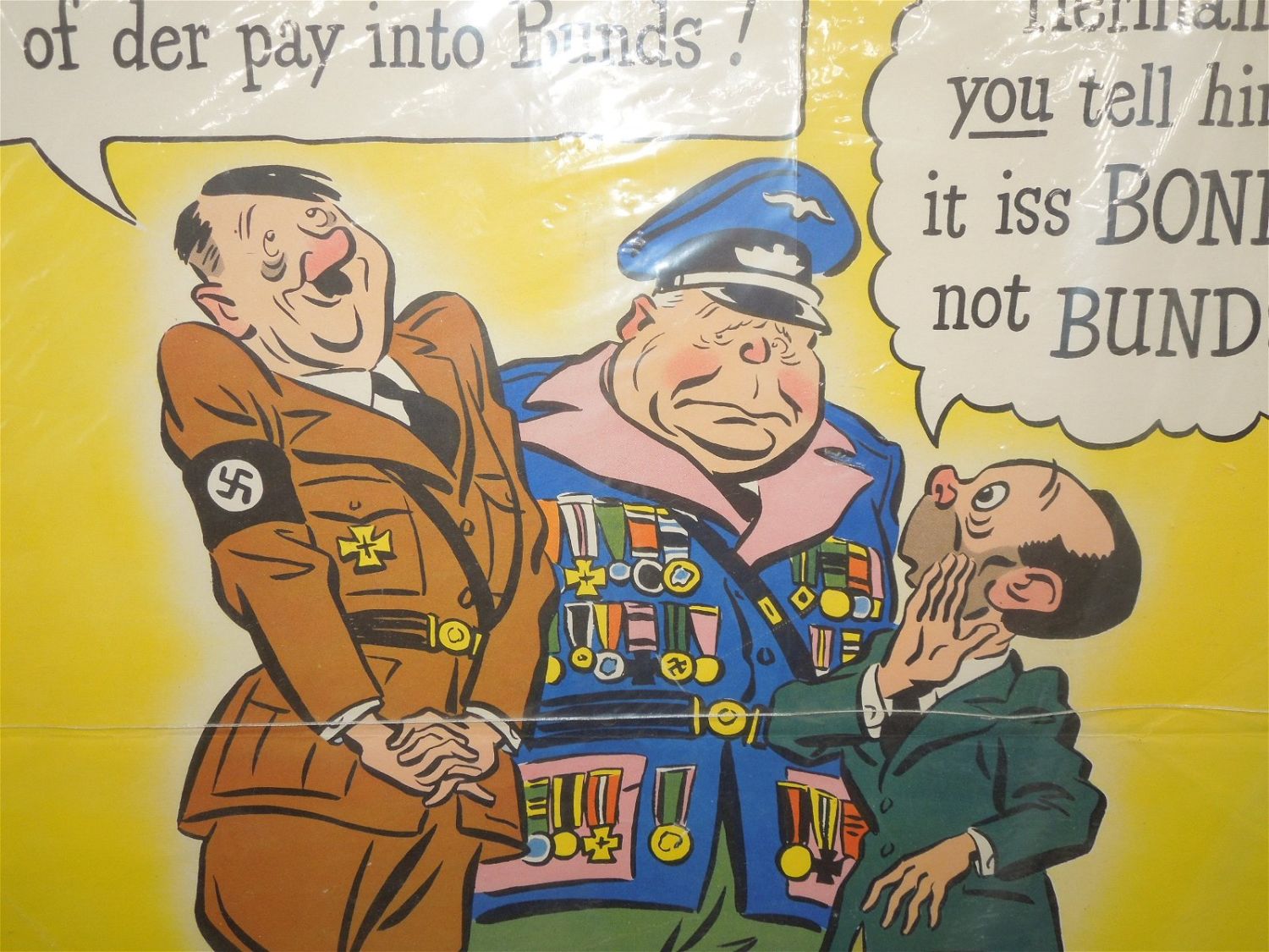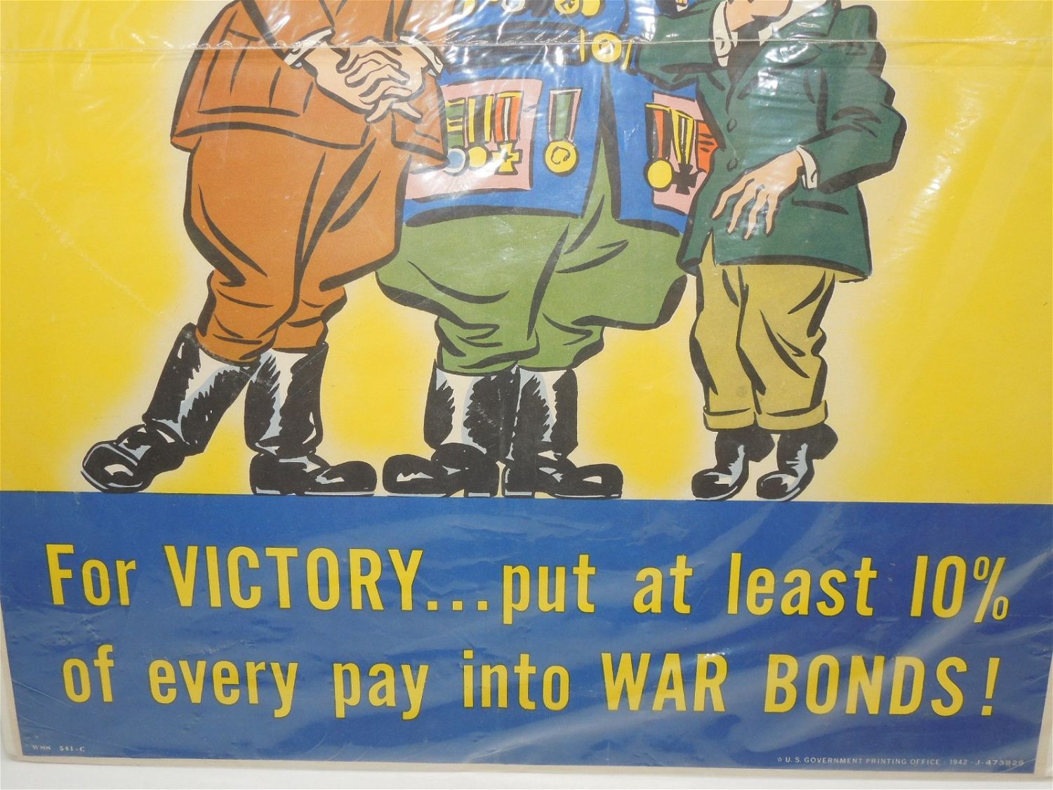 1942 Home Front poster depicting Adolf Hitler, Hermann Goring, and Joseph Goebbels on yellow background. Text on lower poster reads, FOR VICTORY…PUT AT LEAST 10% OF EVERY PAY INTO WAR BONDS!. Produced by U.S. Government Printing Press. Approximate size is 16.75 x 22 inches. Nice condition for its age with fold creases. The reverse can not be photographed because it is wrapped in plastic for protection.