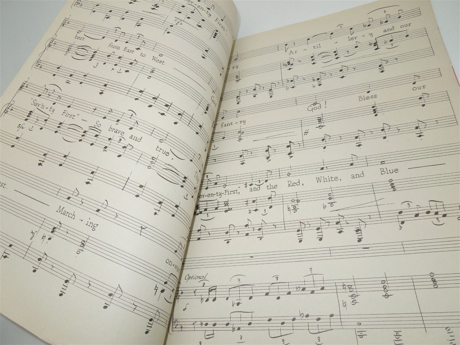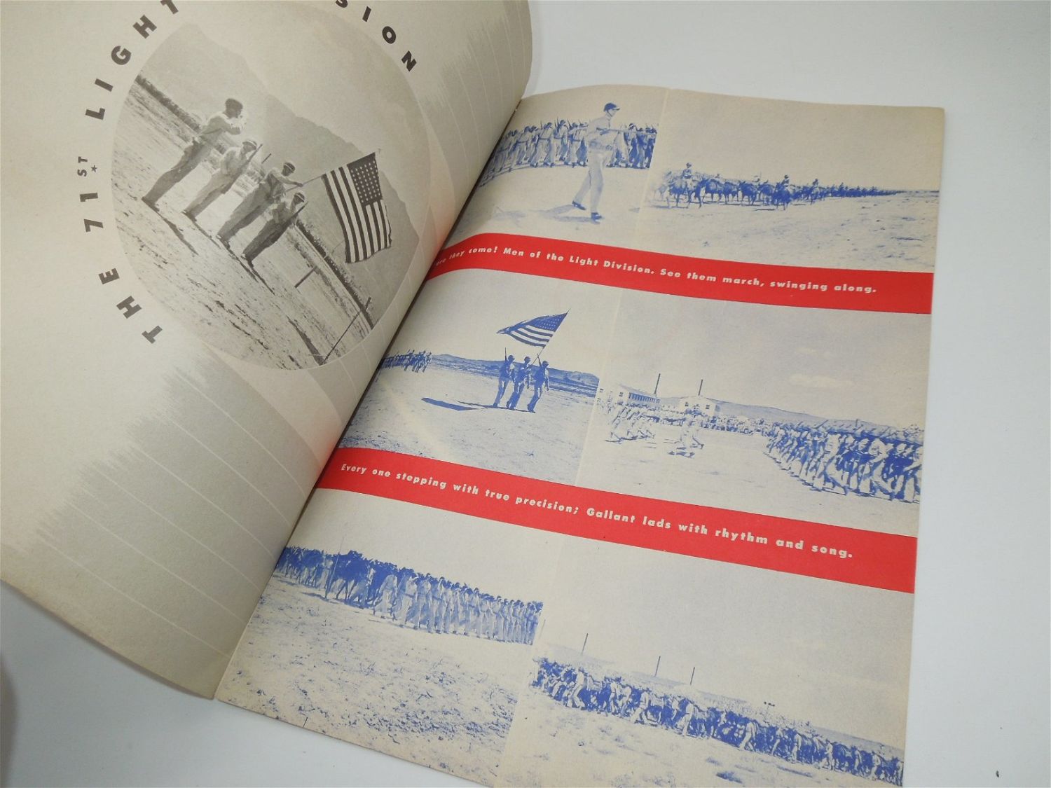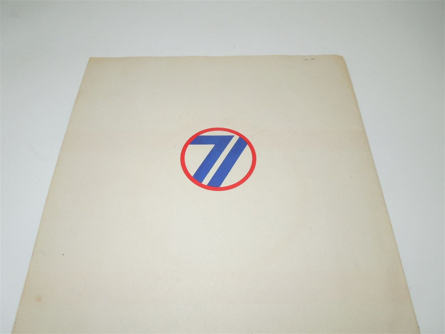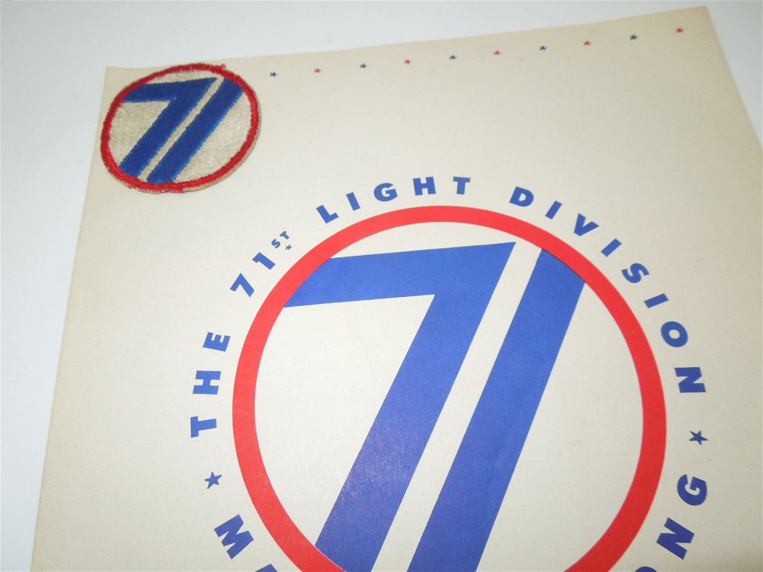 WWII 1943 Army 71st Light Division Marching Song Sheet Music and Patch. The patch is stapled to the front cover. Words and music by Elsie DeVoe. Produced by: Bradford Robinson Printing Company. Good overall condition for its age.