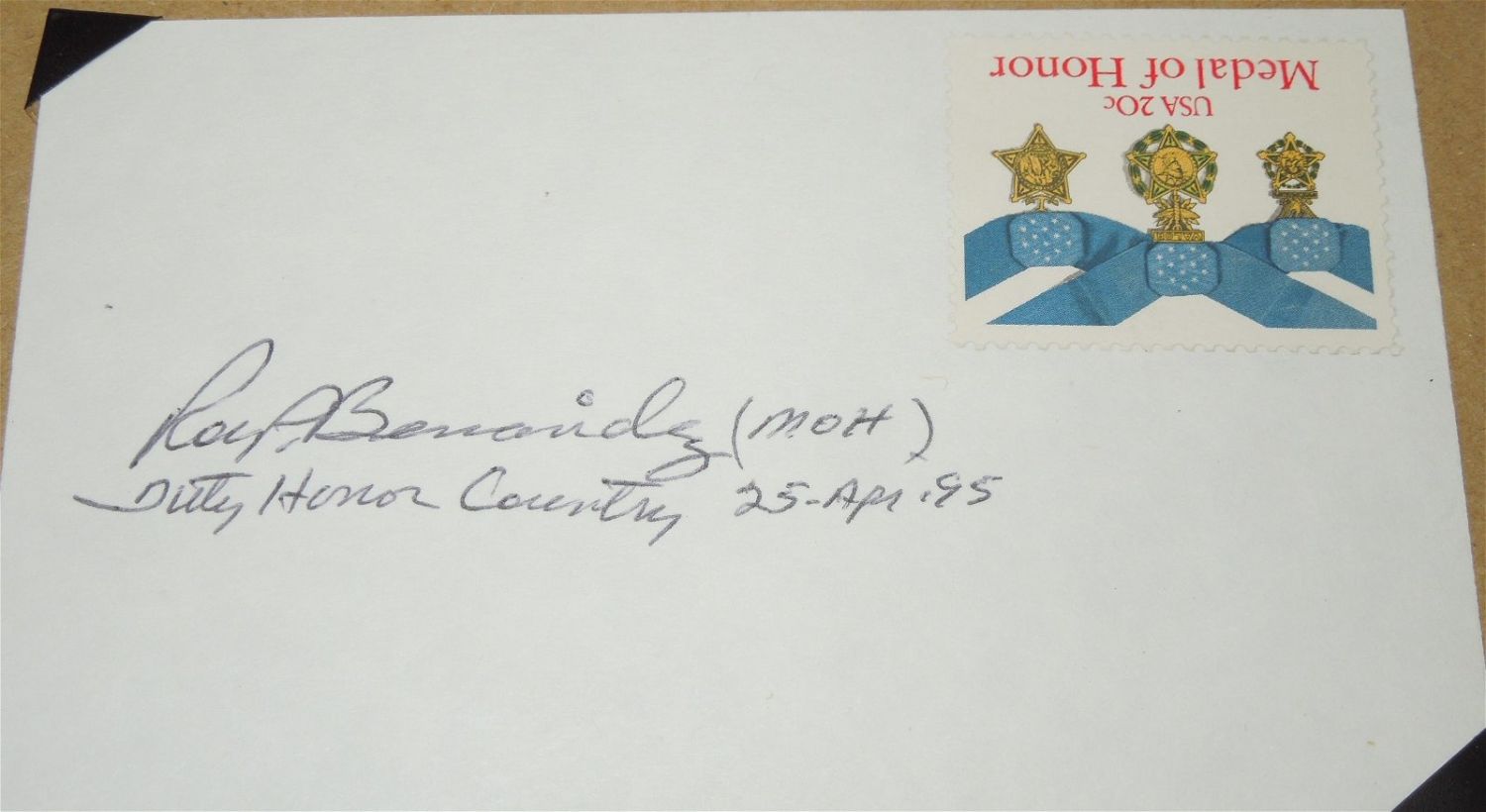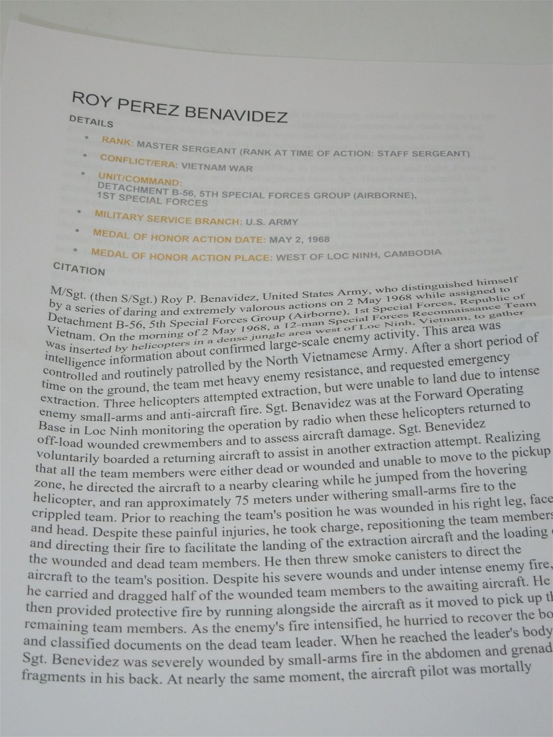 M/Sgt. (then S/Sgt.) Roy P. Benavidez, United States Army, who distinguished himself by a series of daring and extremely valorous actions on 2 May 1968 while assigned to Detachment B-56, 5th Special Forces Group (Airborne), 1st Special Forces, Republic of Vietnam. On the morning of 2 May 1968, a 12-man Special Forces Reconnaissance Team was inserted by helicopters in a dense jungle area west of Loc Ninh, Vietnam, to gather intelligence information about confirmed large-scale enemy activity. This area was controlled and routinely patrolled by the North Vietnamese Army. After a short period of time on the ground, the team met heavy enemy resistance, and requested emergency extraction. Three helicopters attempted extraction, but were unable to land due to intense enemy small-arms and anti-aircraft fire. Sgt. Benavidez was at the Forward Operating Base in Loc Ninh monitoring the operation by radio when these helicopters returned to off-load wounded crewmembers and to assess aircraft damage. Sgt. Benevidez voluntarily boarded a returning aircraft to assist in another extraction attempt. Realizing that all the team members were either dead or wounded and unable to move to the pickup zone, he directed the aircraft to a nearby clearing while he jumped from the hovering helicopter, and ran approximately 75 meters under withering small-arms fire to the crippled team. Prior to reaching the team’s position he was wounded in his right leg, face, and head. Despite these painful injuries, he took charge, repositioning the team members and directing their fire to facilitate the landing of the extraction aircraft and the loading of the wounded and dead team members. He then threw smoke canisters to direct the aircraft to the team’s position. Despite his severe wounds and under intense enemy fire, he carried and dragged half of the wounded team members to the awaiting aircraft. He then provided protective fire by running alongside the aircraft as it moved to pick up the remaining team members. As the enemy’s fire intensified, he hurried to recover the body and classified documents on the dead team leader. When he reached the leader’s body, Sgt. Benevidez was severely wounded by small-arms fire in the abdomen and grenade fragments in his back. At nearly the same moment, the aircraft pilot was mortally wounded, and his helicopter crashed. Although in extremely critical condition due to his multiple wounds, Sgt. Benevidez secured the classified documents and made his way back to the wreckage, where he aided the wounded out of the overturned aircraft, and gathered the stunned survivors into a defensive perimeter. Under increasing enemy automatic-weapons and grenade fire, he moved around the perimeter distributing water and ammunition to his weary men, reinstilling in them a will to live and fight. Facing a buildup of enemy opposition with a beleaguered team, Sgt. Benevidez mustered his strength, began calling in tactical air strikes and directed the fire from supporting gunships to suppress the enemy’s fire and so permitted another extraction attempt. He was wounded again in his thigh by small-arms fire while administering first aid to a wounded team member just before another extraction helicopter was able to land. His indomitable spirit kept him going as he began to ferry his comrades to the craft. On his second trip with the wounded, he was clubbed from additional wounds to his head and arms before killing his adversary. He then continued under devastating fire to carry the wounded to the helicopter. Upon reaching the aircraft, he spotted and killed two enemy soldiers who were rushing the craft from an angle that prevented the aircraft door-gunner from firing upon them. With little strength remaining, he made one last trip to the perimeter to ensure that all classified material had been collected or destroyed and to bring in the remaining wounded. Only then, in extremely serious condition from numerous wounds and loss of blood, did he allow himself to be pulled into the extraction aircraft. Sgt. Benevidez’ gallant choice to join voluntarily his comrades who were in critical straits, to expose himself constantly to withering enemy fire, and his refusal to be stopped despite numerous severe wounds, saved the lives of at least eight men. His fearless personal leadership, tenacious devotion to duty, and extremely valorous actions in the face of overwhelming odds were in keeping with the highest traditions of the military service and reflect the utmost credit on him and the United States Army. Excellent mounted display condition.