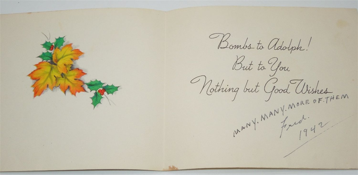 WWII Era Season’s Greeting Card to Adolph Hitler. Produced by WM. E. Coutts CO. Limited. Approximate size is 4.5 x 5.25 inches. Good used condition.