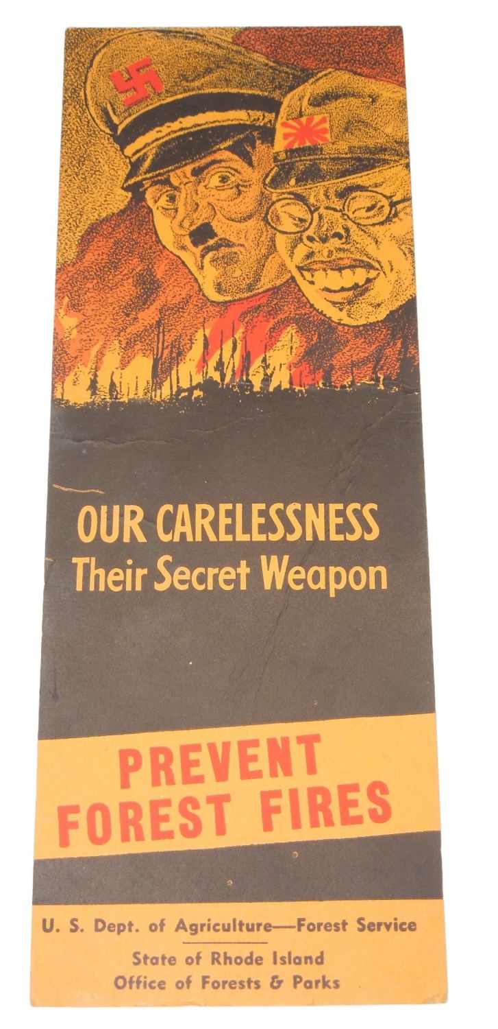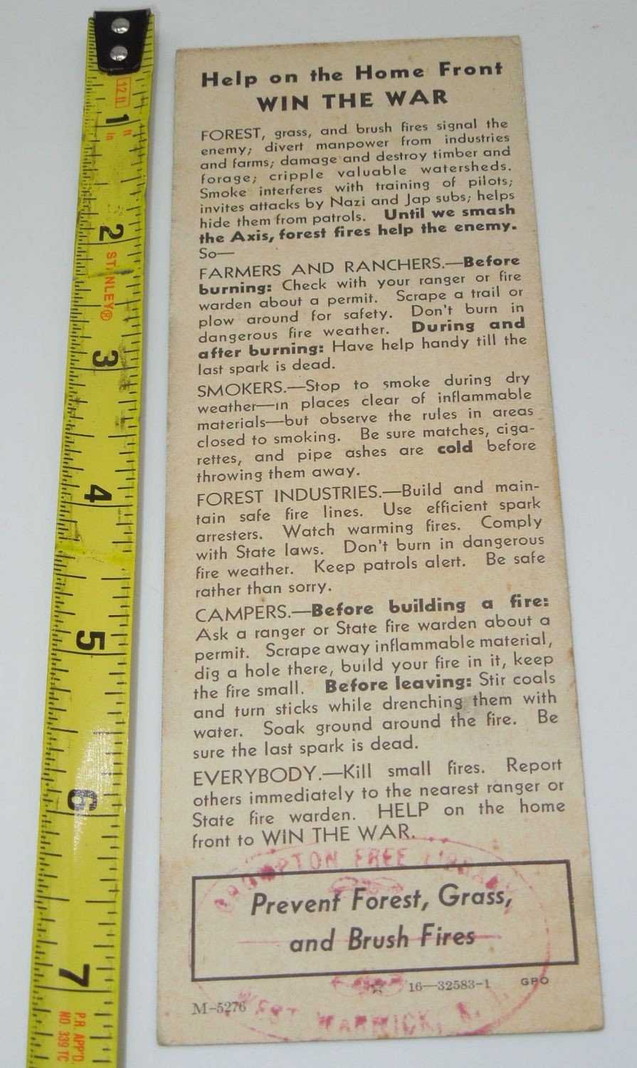 Original card issued during WWII by the Department of Agriculture urging people to prevent forest fires as the Axis leaders would exploit such disasters. Good condition.