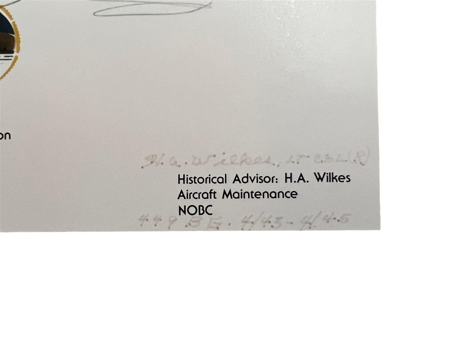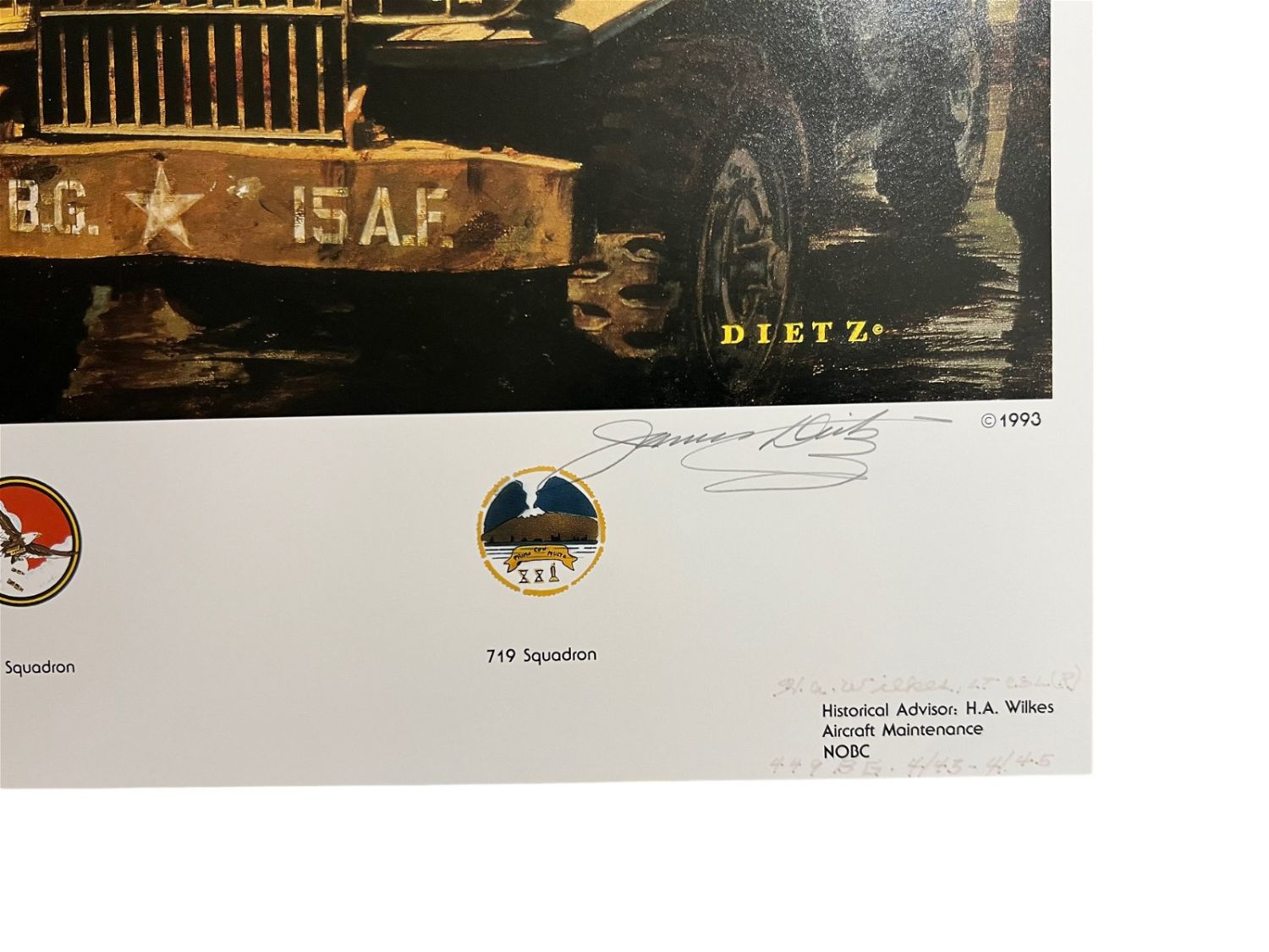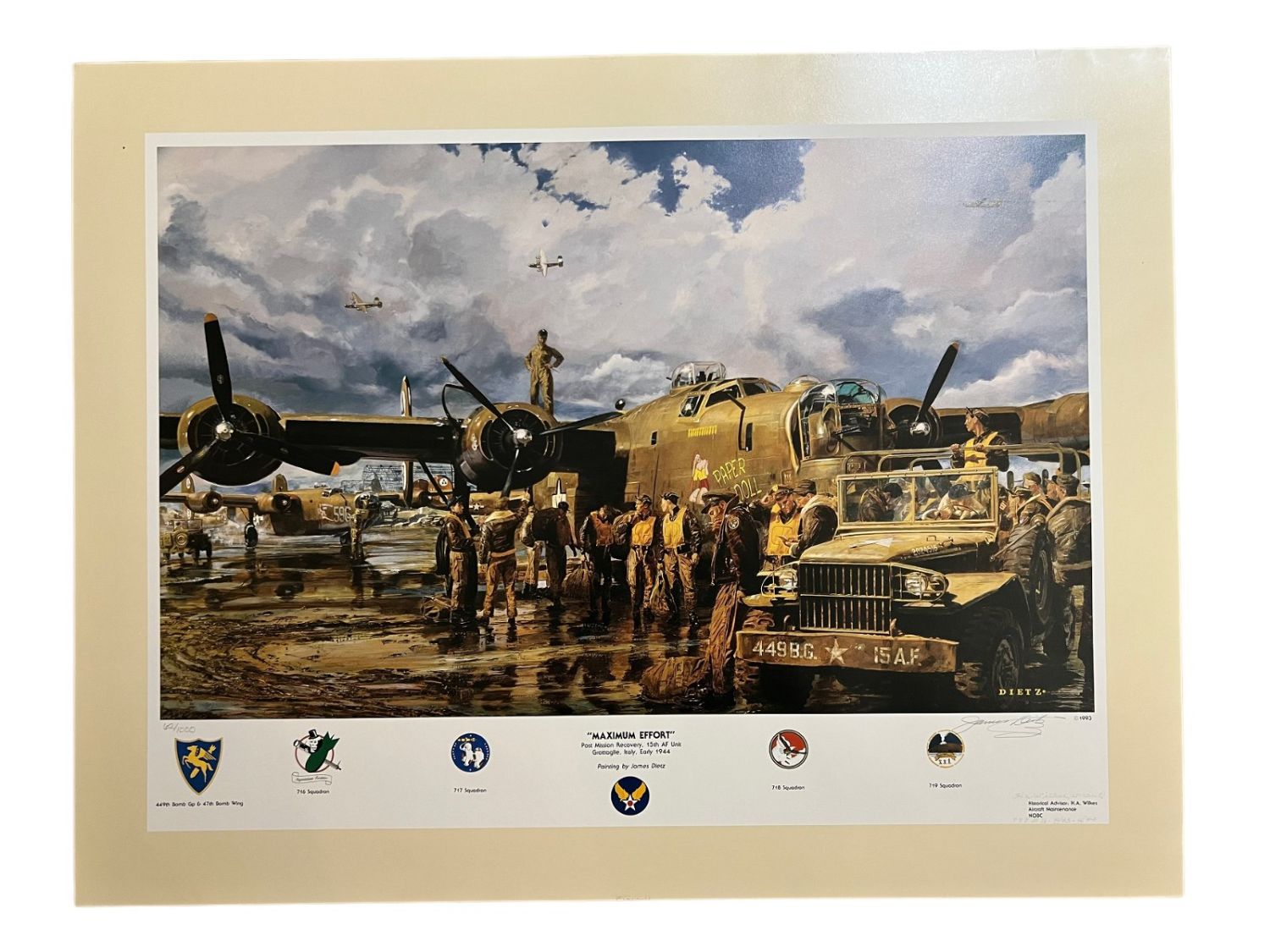 Maximum Effort is a signed print by artist James Dietz and a limited edition numbered 62/1000. Not only is the print signed by the artist, but also by Lt. Col HA Wilkes who was the historical advisor and attached to the 449th Bomb Group during WWII. This work illustrates what it was like to be on a bomber field in 1944, depicting the 15th Air Force in Italy after a tough mission. Weary flight crews drag their flight bags; officers are quickly debriefed while the flight engineer discusses damage to the number three engine with the ground crew. The aircraft pictured, Paper Doll and Reluctant Liz, were both later lost in raids over Romania. Approximate size is 21.75 x x 28.25 inches. Nice overall condition with a couple minor creases most likely from being rolled during storage.
