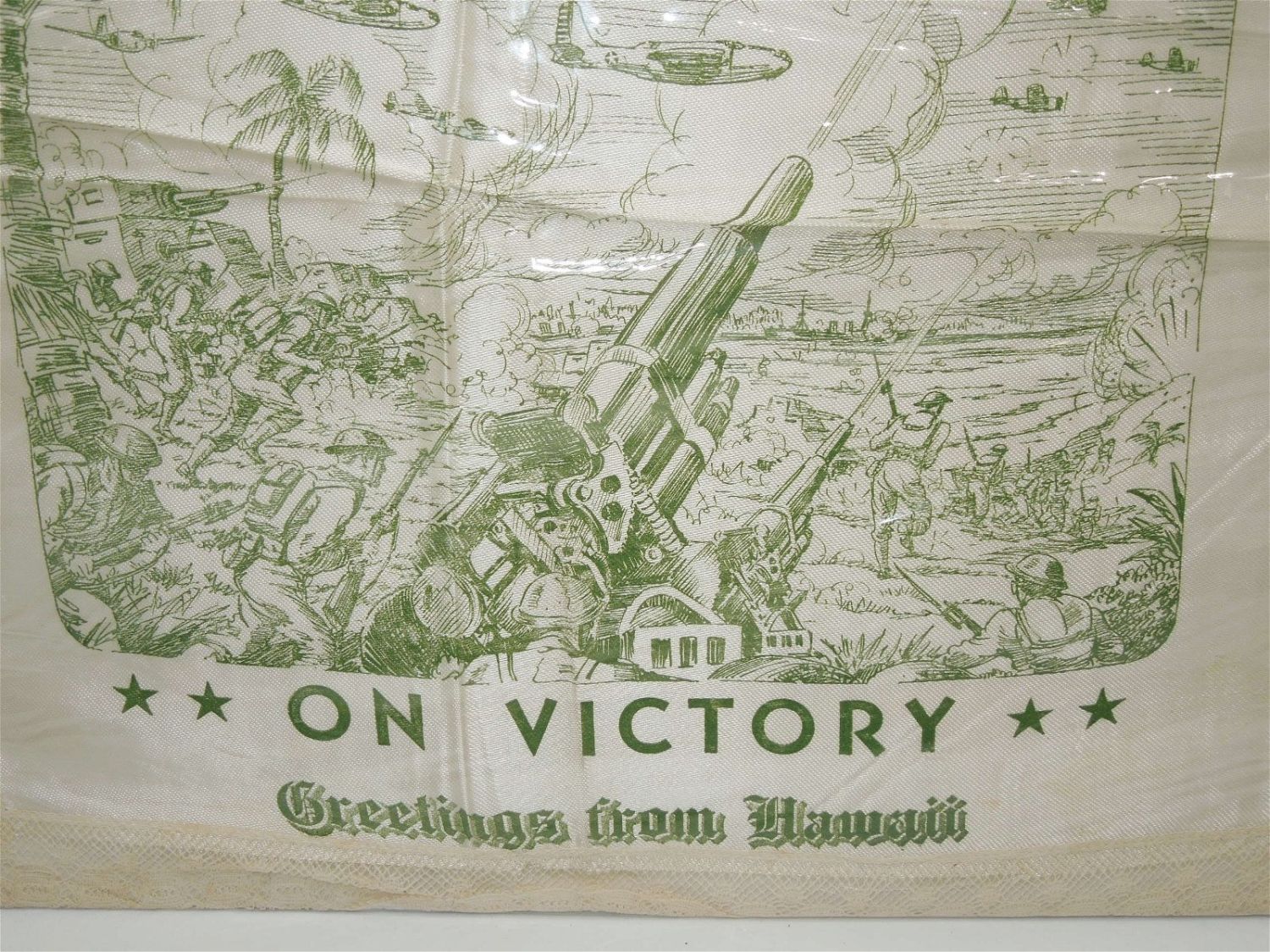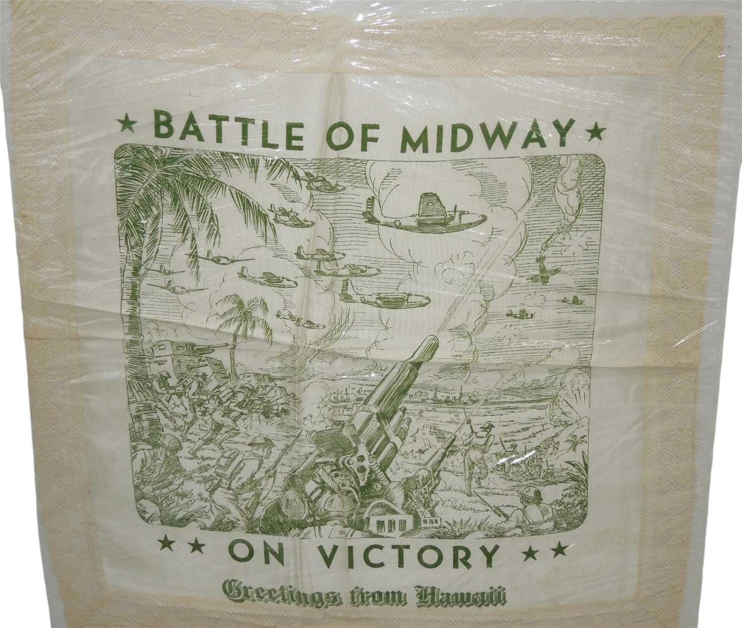 WWII Era Battle Of Midway Hawaii Silk Pillow Sham. Approximate size is 14 x 14 inches. The piece is encased in plastic for protection so the reverse can not be photographed. Very good condition for its age.