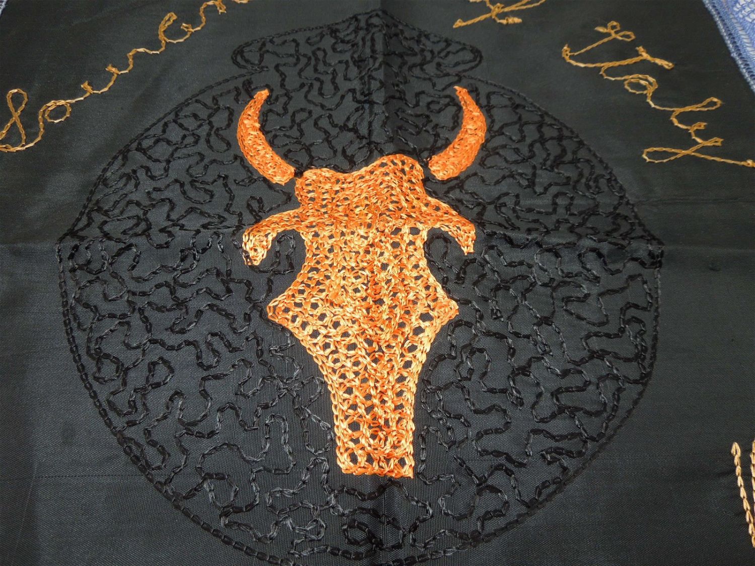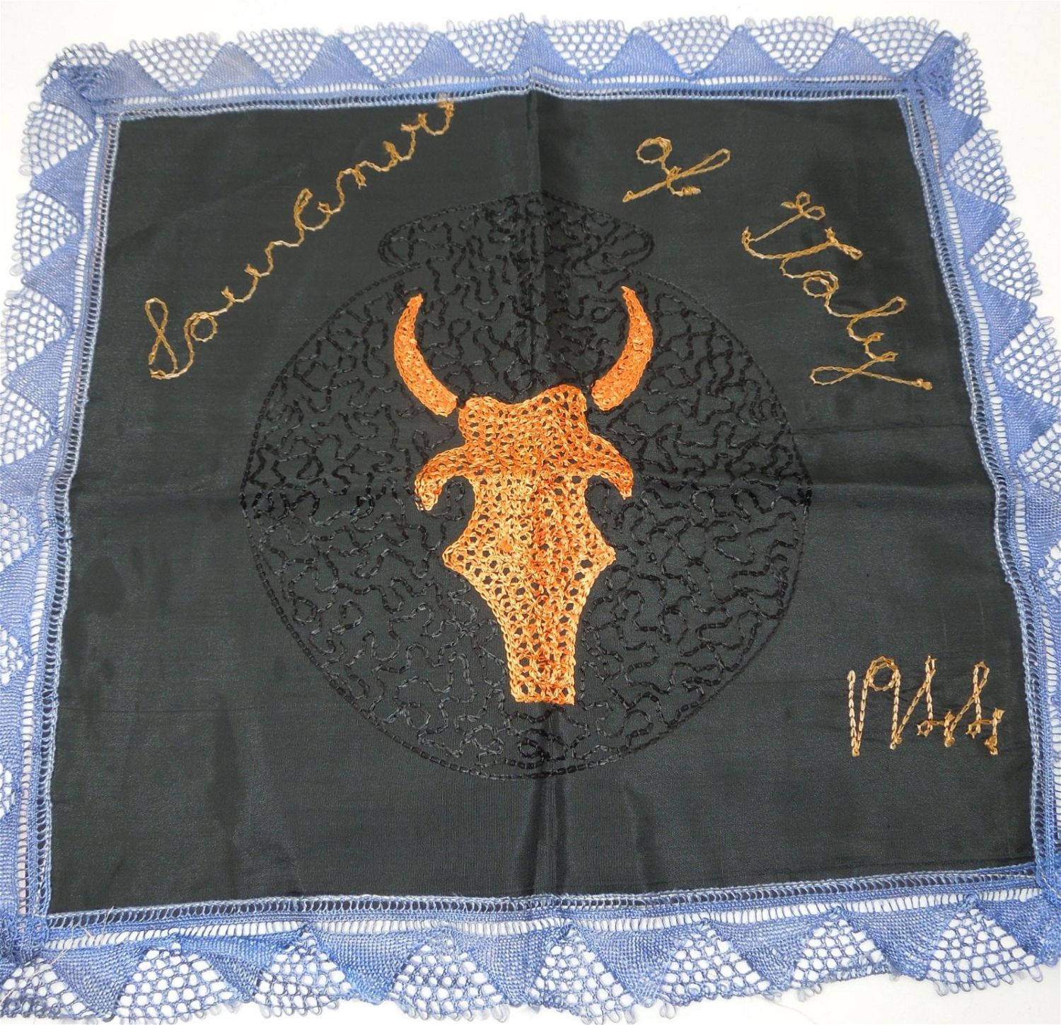 Approximately 15.5 inch long Italian WWII embroidered pillow cover for the 34th Infantry Red Bull Division. Good condition.