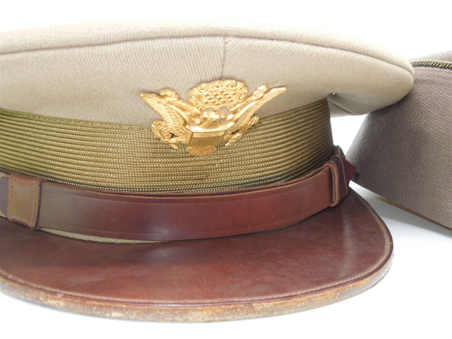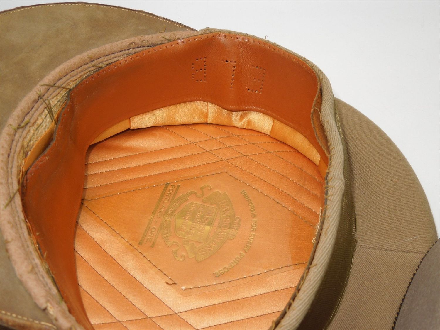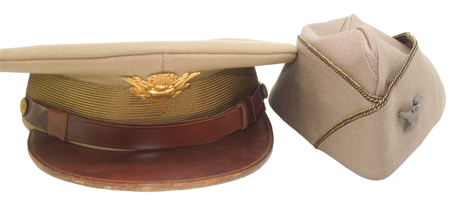 WWII Era Colonel Pinks Officers Hat & Overseas Cap lot. The Overseas hat is not named and the size is 7 1/4. The reverse of the colonel Insignia shows the snowflake pattern. The officers visor hat leather band is being held on by a thread. This hat has the initials ELB. The size is 6 7/8. The inside of the hat reads Dan Bowmans Moyer Clothing Company. Both pieces are in nice condition.