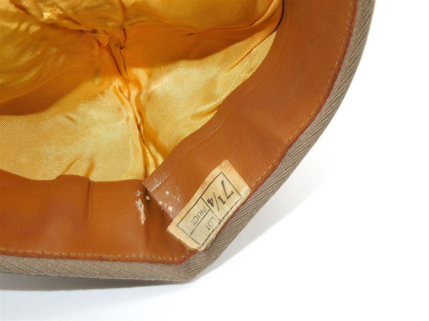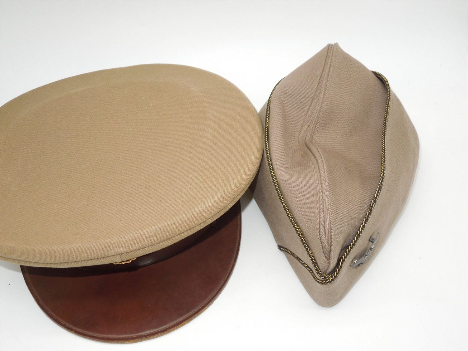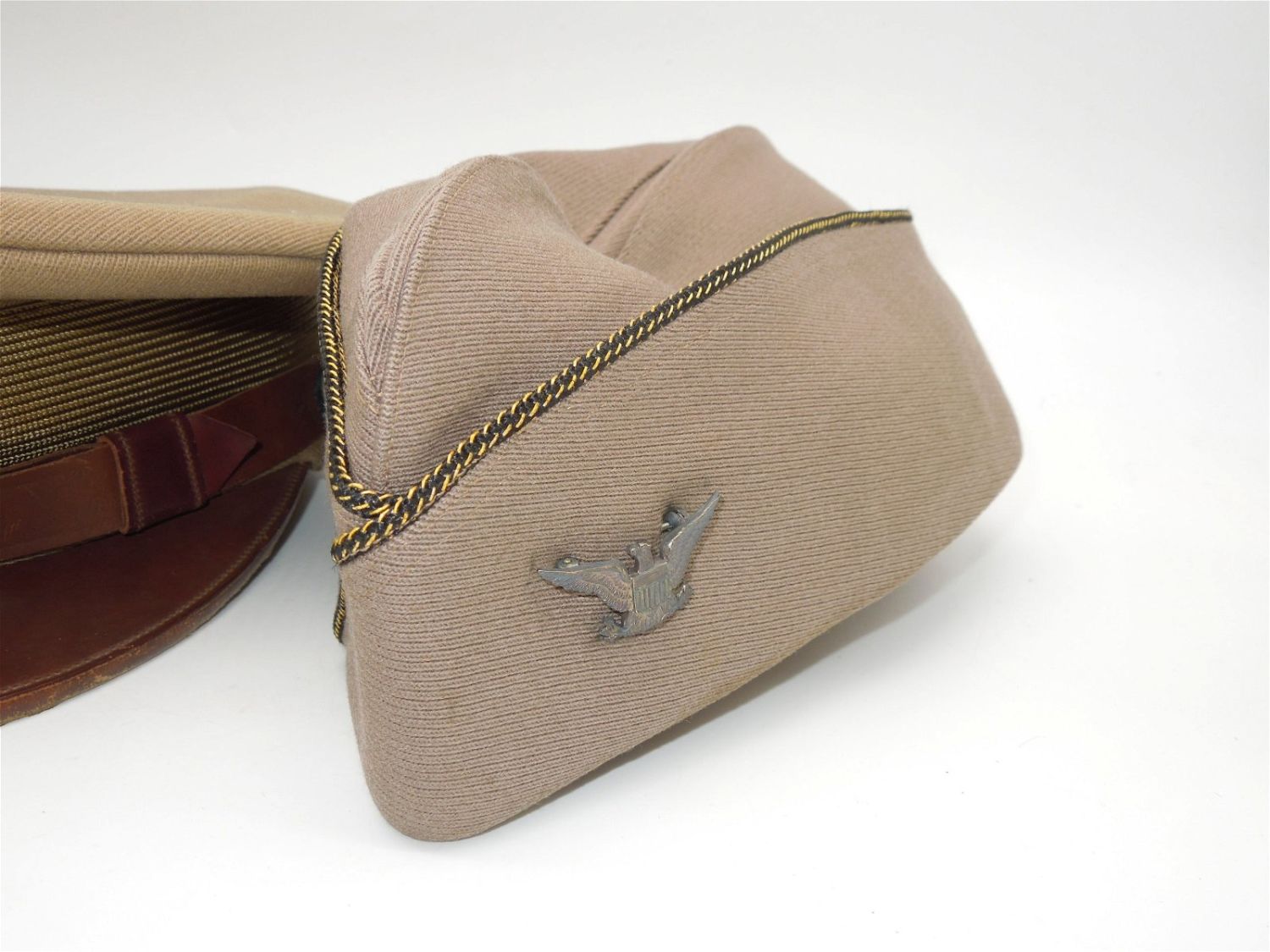 WWII Era Colonel Pinks Officers Hat & Overseas Cap lot. The Overseas hat is not named and the size is 7 1/4. The reverse of the colonel Insignia shows the snowflake pattern. The officers visor hat leather band is being held on by a thread. This hat has the initials ELB. The size is 6 7/8. The inside of the hat reads Dan Bowmans Moyer Clothing Company. Both pieces are in nice condition.