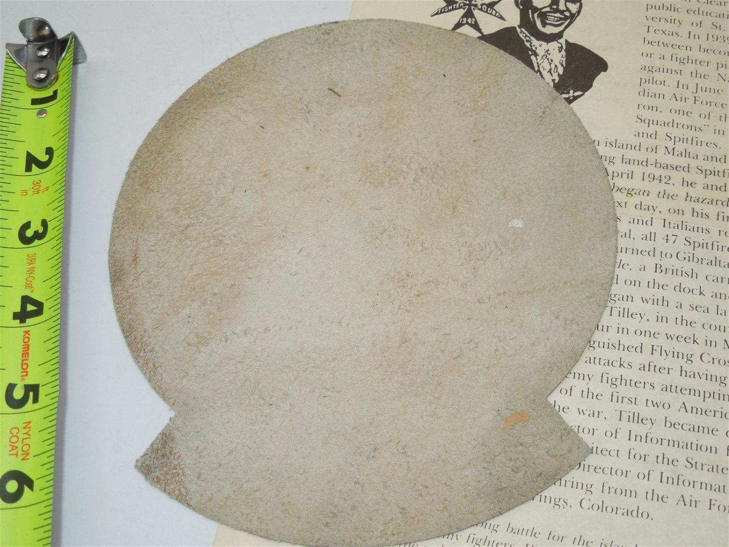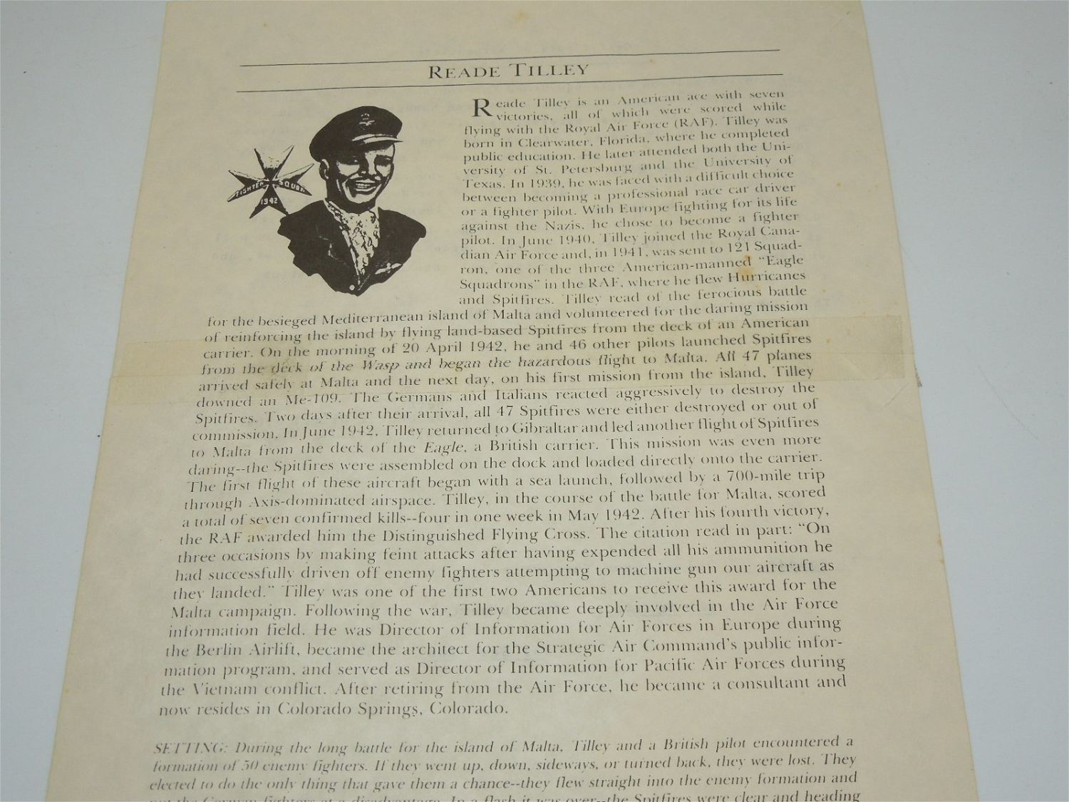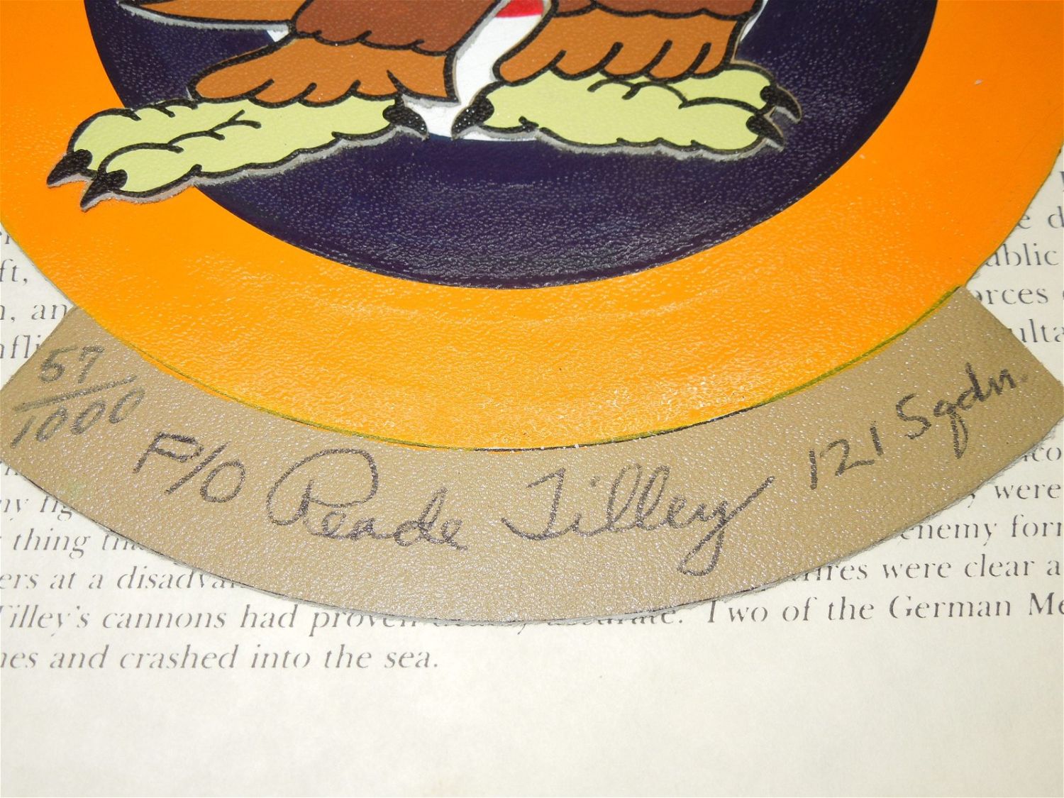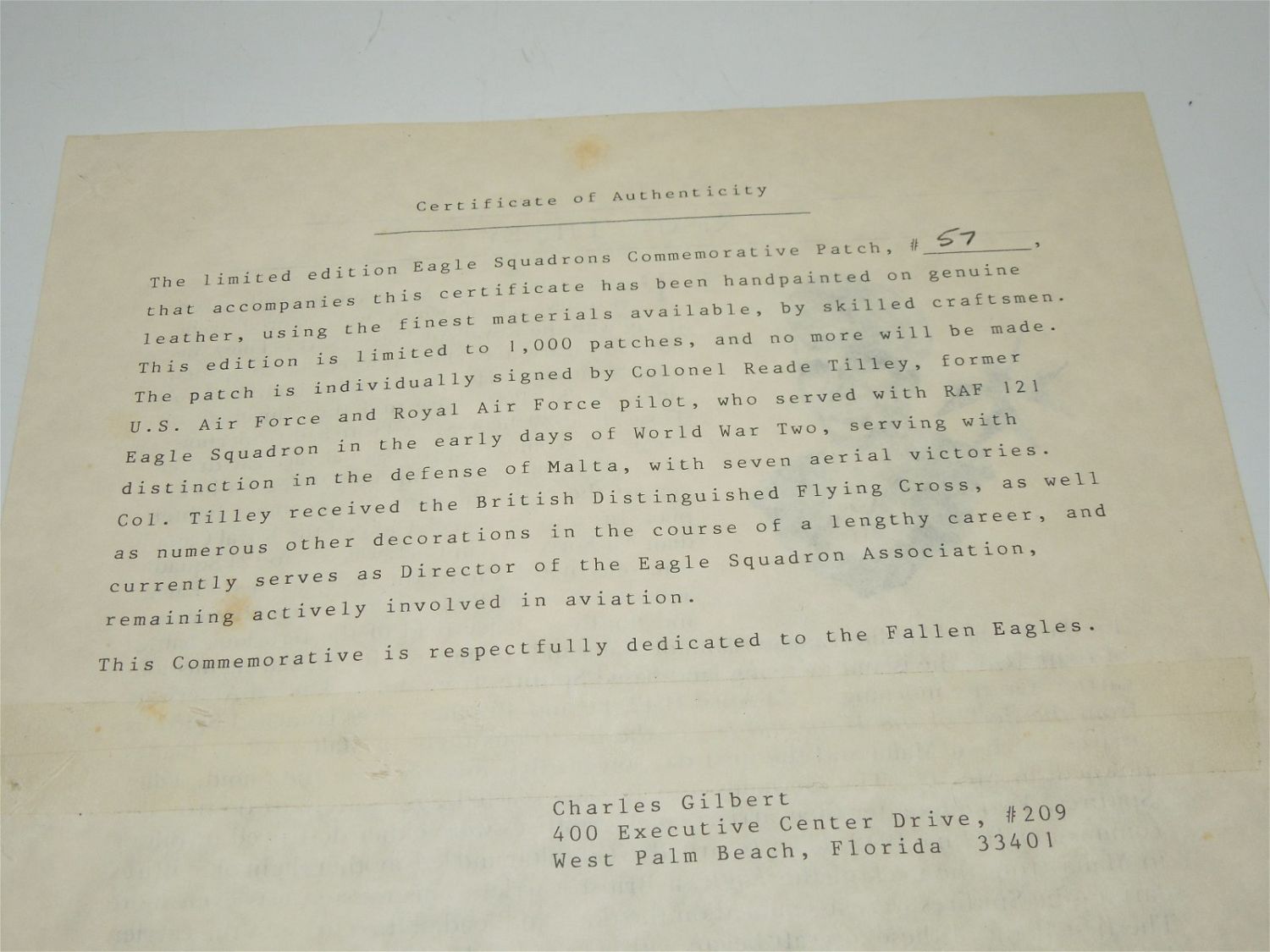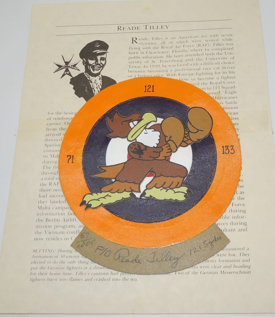 RAF Royal Air Force Ace Pilot Reade Tilley Signed 121st Eagle Squadron Leather Patch. This item comes with a Certificate of Authenticity and a Reade Tilley Biography. The Eagle Squadron Commemorative Patch is numbered 57/1000. Reade Tilley was a World War II American Ace who fought with the RAF. He is credited with seven victories, all of which were scored while flying with Eagle Squadrons of the RAF. Following the war, he became deeply involved in the Air Force information field. During the Cold War he helped General Curtis LeMay set up SAC. Reade served as director of information for U.S. Air Forces in Europe during the Berlin Airlift, became the architect for the Strategic Air Command’s public information program, and served as director of information for Pacific Air Forces during the Vietnam conflict. After retiring from the Air Force, he became an independent public relations consultant. Approximate diameter size is 6 inches. Excellent overall condition.