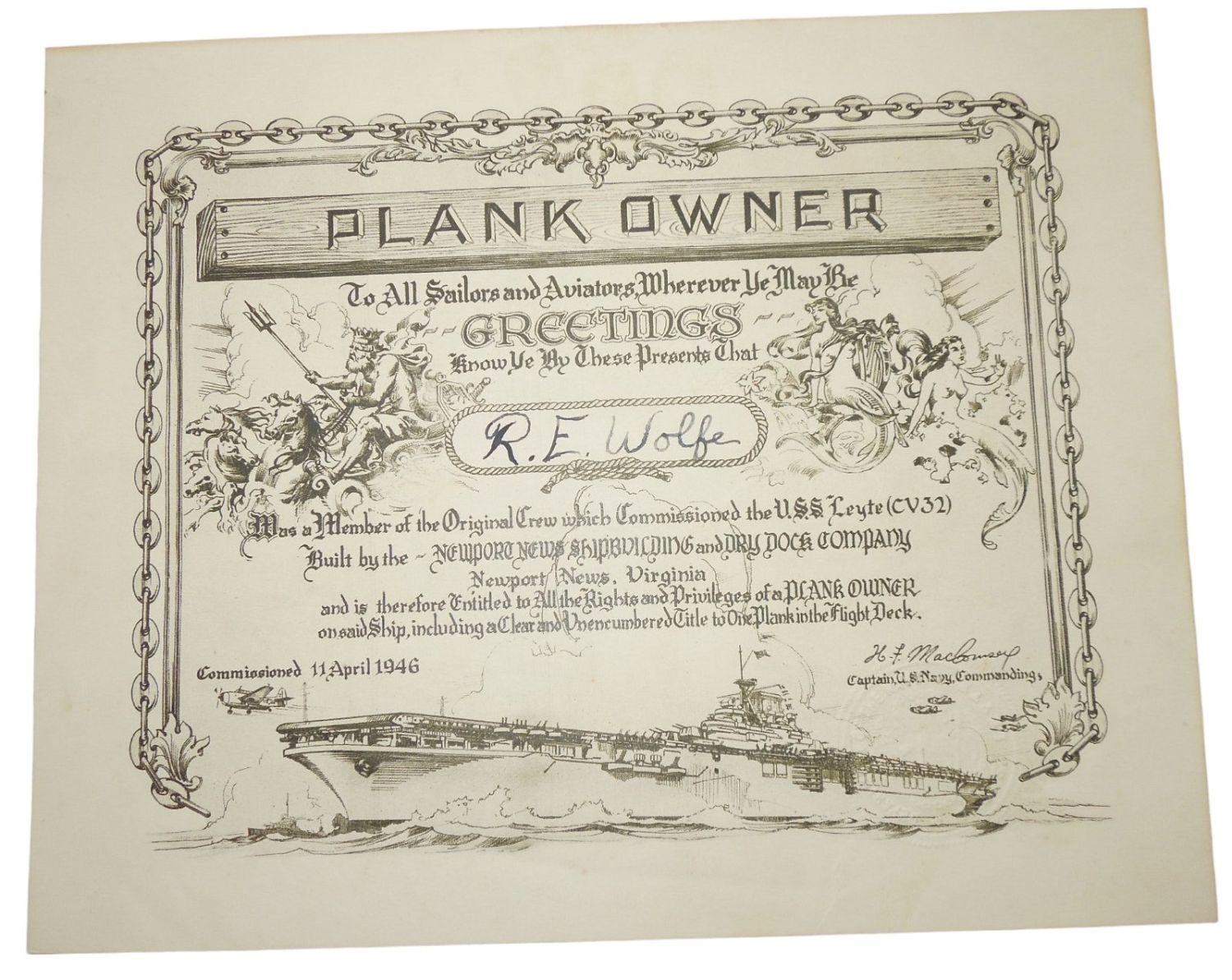 USN Navy USS Leyte Aircraft Carrier Named Plank Owners Certificate. Named to R.E. Wolfe. This piece has an embossed stamp. Approximate size is 8 x 10 inches. Condition: good condition for its age.