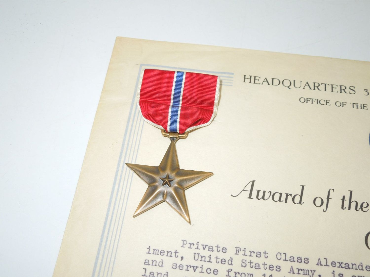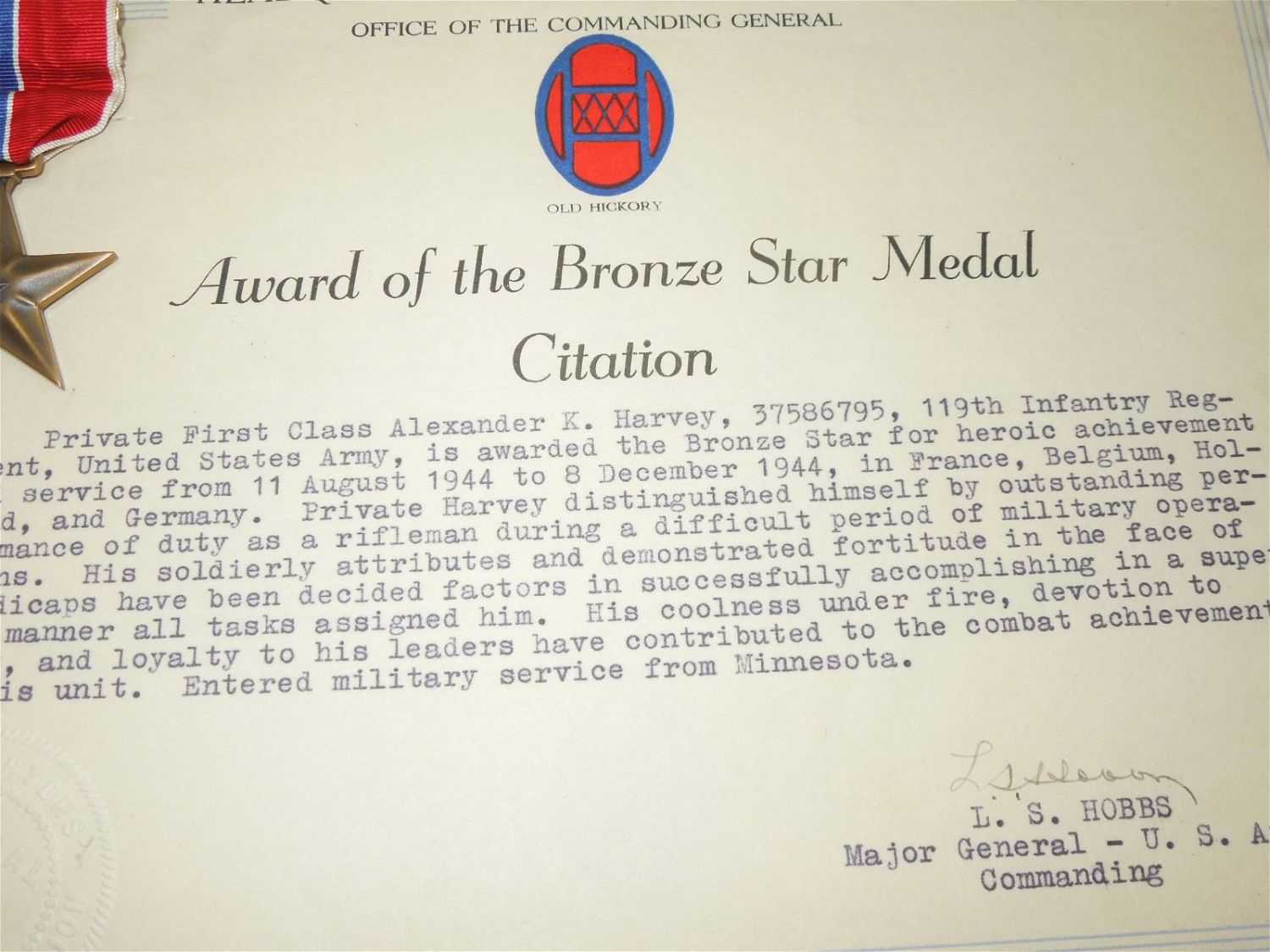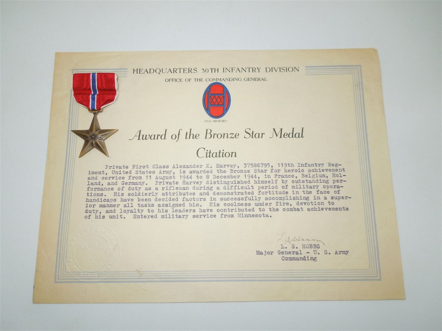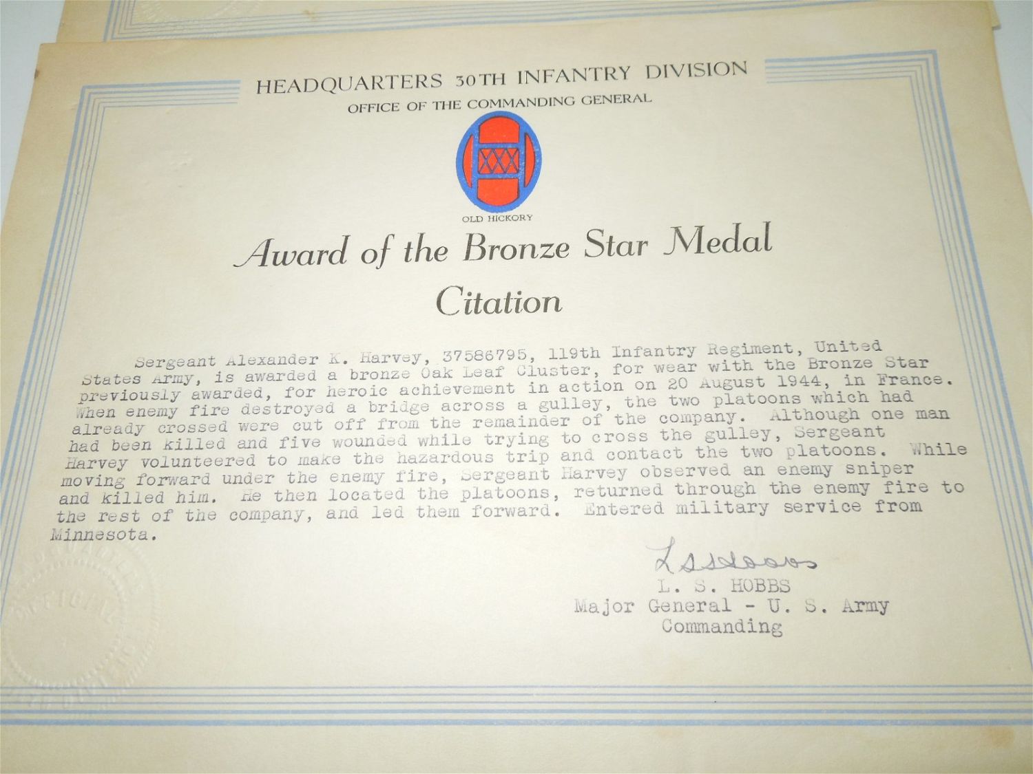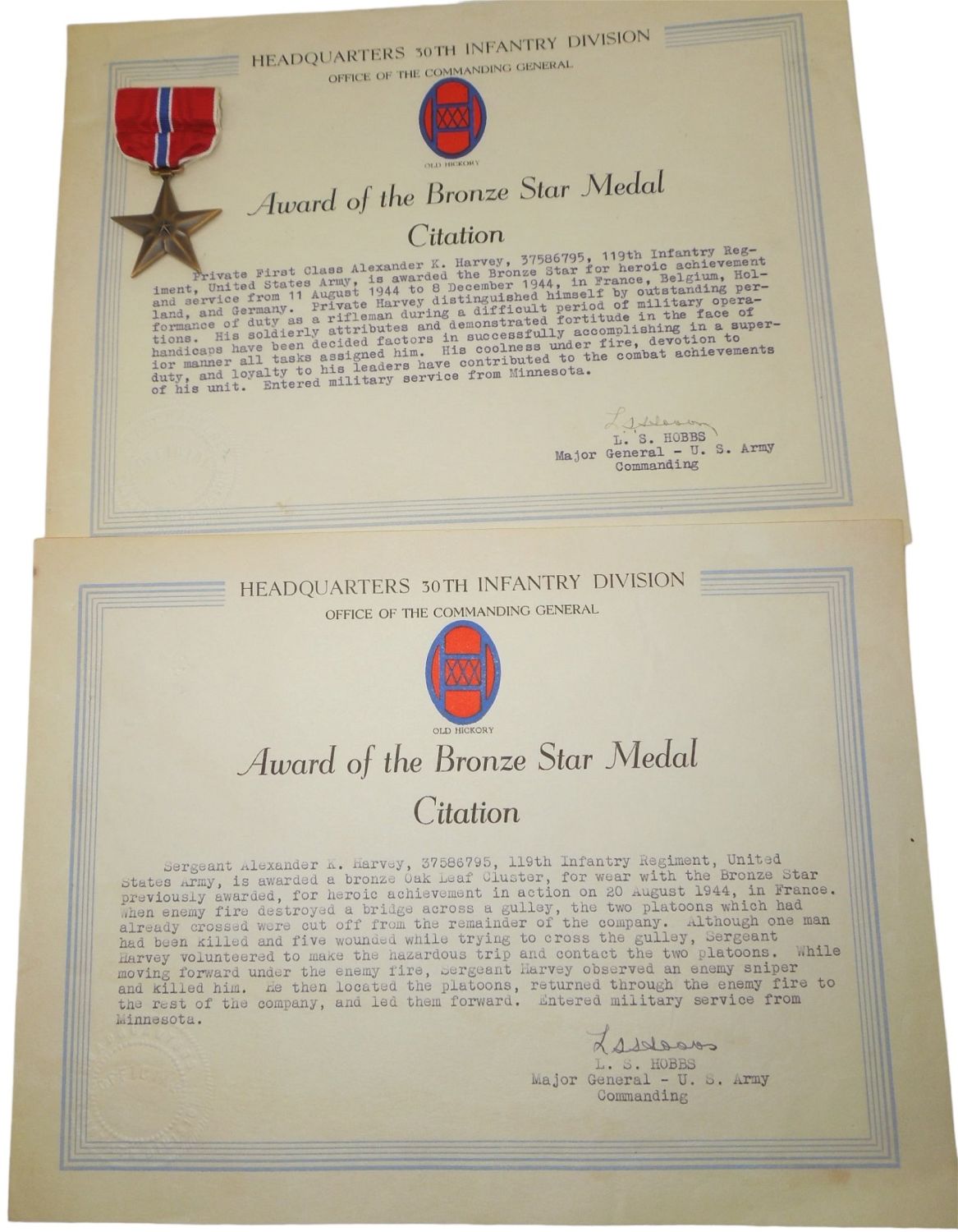 WWII Era Army 30th Infantry Division, 119th Infantry Regiment Bronze Star Medal and (2) Citations. Named to Alexander K. Harvey. Harvey was awarded the Bronze Star Medal & BSM with Oak Leaf Cluster. Both citations explain the awards. Both embossed stamped awards are signed by L.S. Hobbs, Major General. Excellent condition.