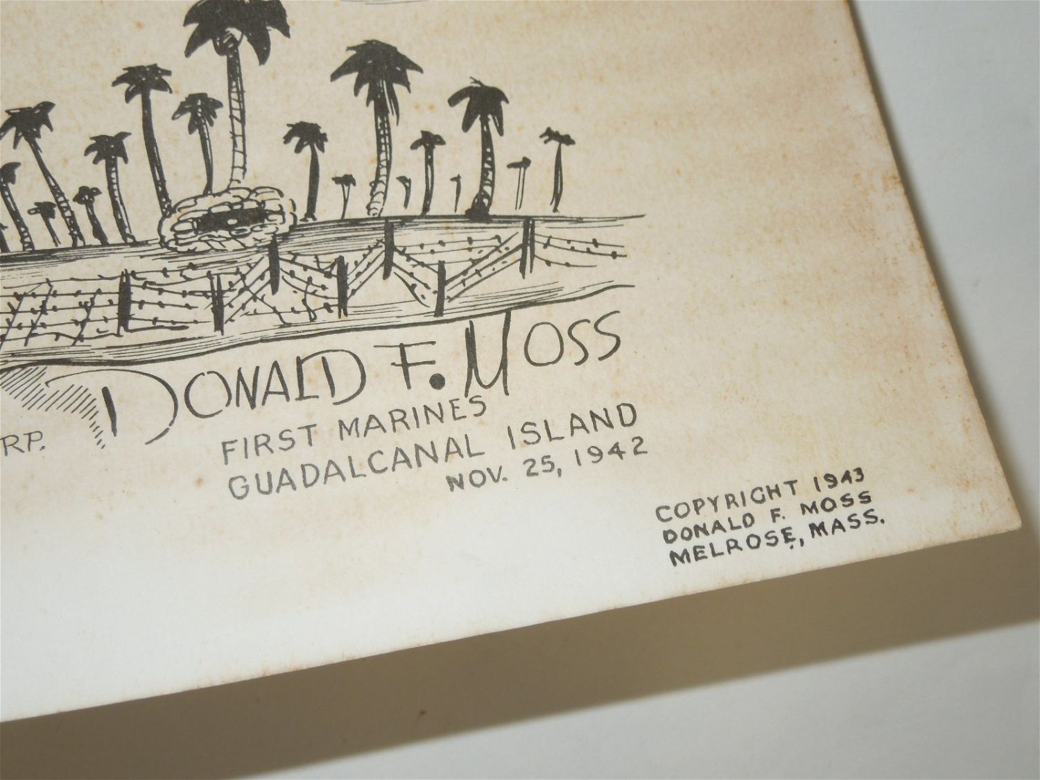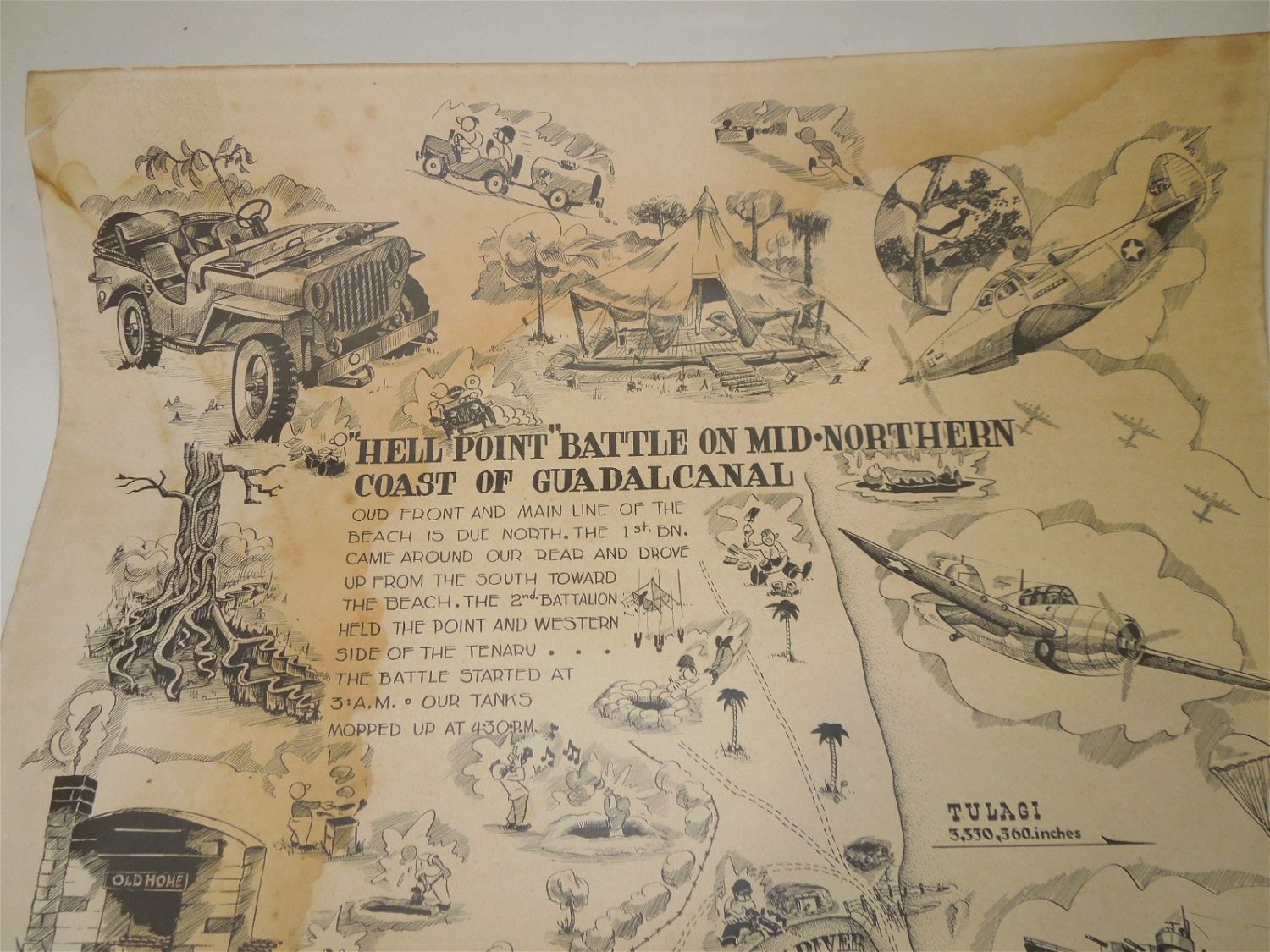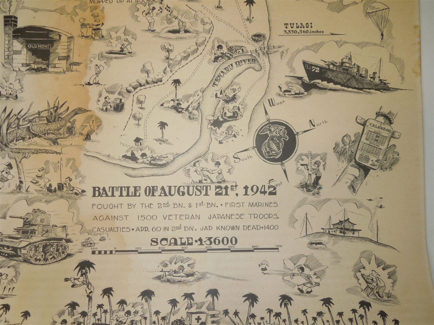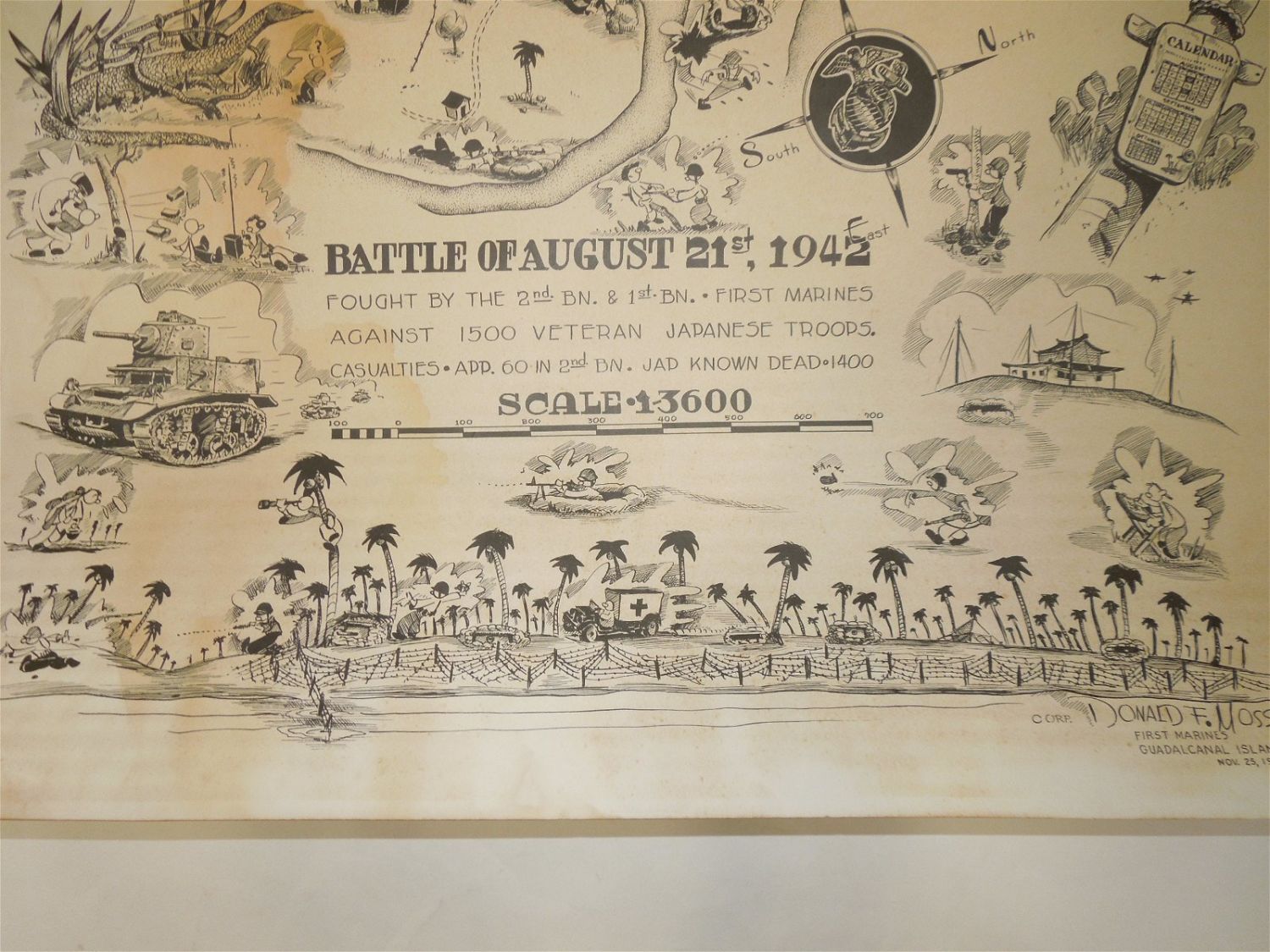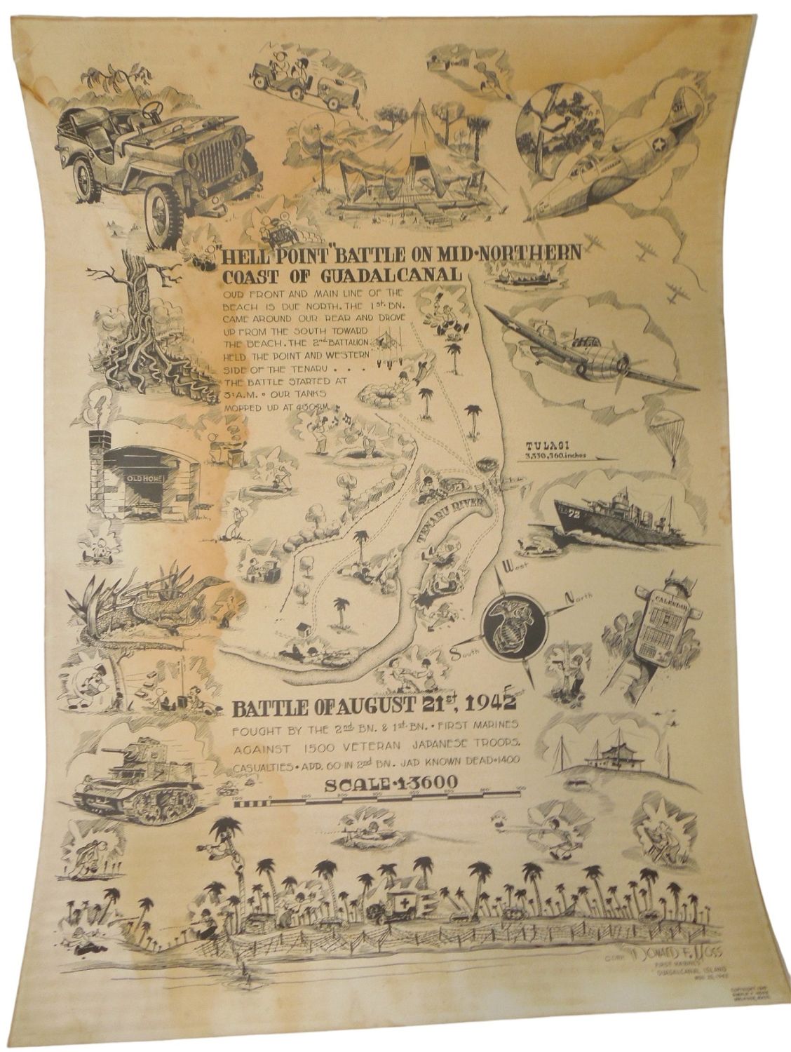 RARE Poster. Guadalcanal Campaign, Battle of Tenaru, Hell Point, August 21, 1942. Artwork by Donald F. Moss. Guadalcanal Island. Nov. 25, 1942. During the Battle of Tenaru on August 21-22, 1942 this area was at the western edge of the battlefield and many Japanese Army soldiers were killed on the beach nearby. Afterwards, the area was nicknamed "Hell’s Point". On 7 August 1942, Donald Moss, a Corporal with E. Co. 2nd Battalion, 1st Marines, landed on the island of Guadalcanal where he fought in “The Battle of Tenaru, ” the first major ground battle during the Pacific Campaign in World War II. After winning commendations both on Guadalcanal and The New Britain Campaigns, Moss finished up his career in the USMC on the Island of Guam. On 15 August 1945, Marine Corporal Donald Moss received first prize in Guam’s Art Exhibition for his work, “Marine Still Life.” Moss was given the blue ribbon by his friend, 1st Lt. USMC Tyrone Power, signaling the beginning of many awards and recognition for his art yet to come. Copyright: 1943 Donald F. Moss Melrose, Mass. Approximate size is 19.5 x 27 inches. Unfortunately, there are stains and foxing on this poster. Also, one corner is barely attached to the piece.