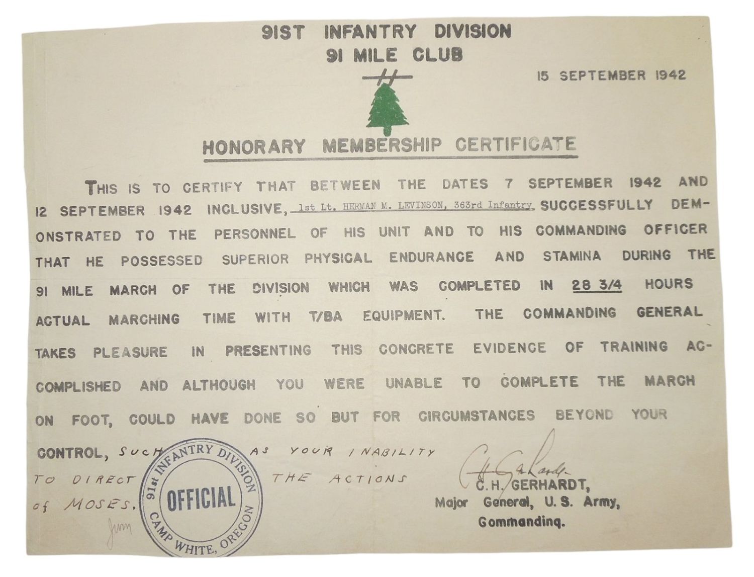 WWII 1942 Army 91st Infantry Division 91 Mile Club Certificate. Named to Herman M. Levinson. Levinson was attached to the 363rd Infantry Regiment, 91st Infantry Division at Camp White, Oregon. The certificate mentions that Levinson did not complete the march due to circumstances beyond his control. Levinson added more information to the circumstance. Signed by Major General C.H. Gerhardt. This certificate has been folded and has creases throughout.