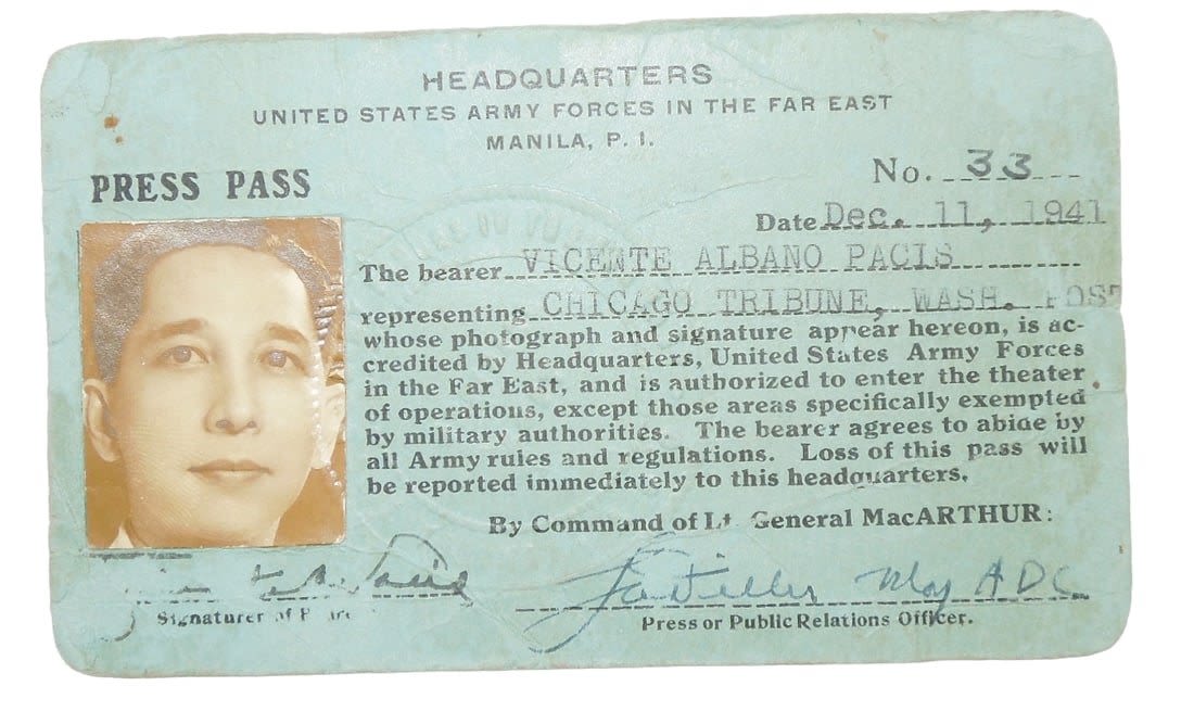 WWII 1941 Named Press Pass Army Forces Far East Manila P.I. Chicago Tribune. Named to Vicente Albano Pacis who worked for the Chicago Tribune in the 1940s. This pass is By Command of Lt. General Douglas MacArthur. Stamped and embossed. Good used condition.