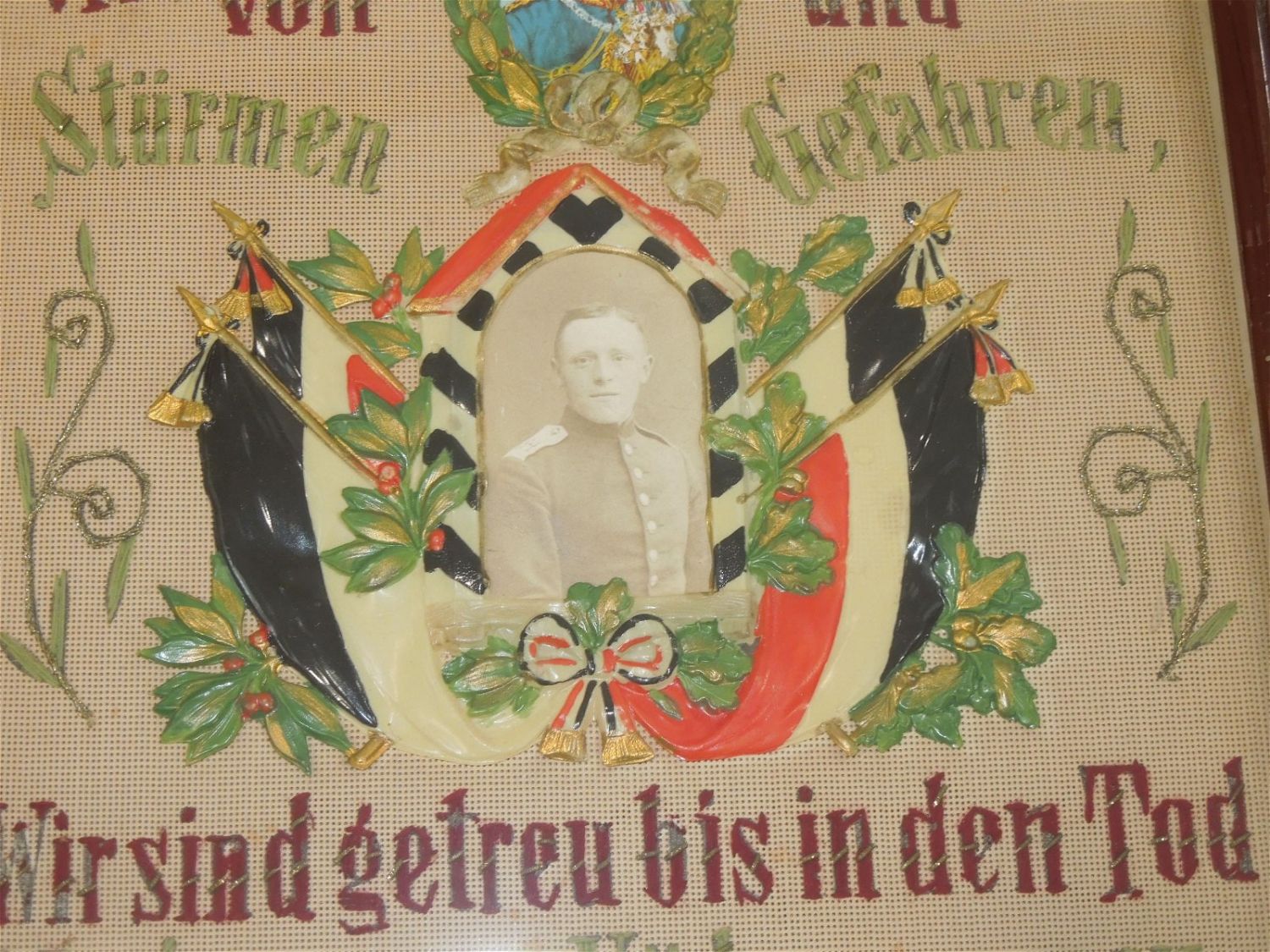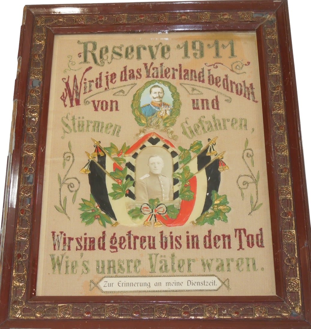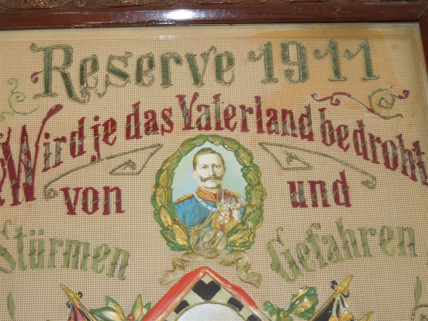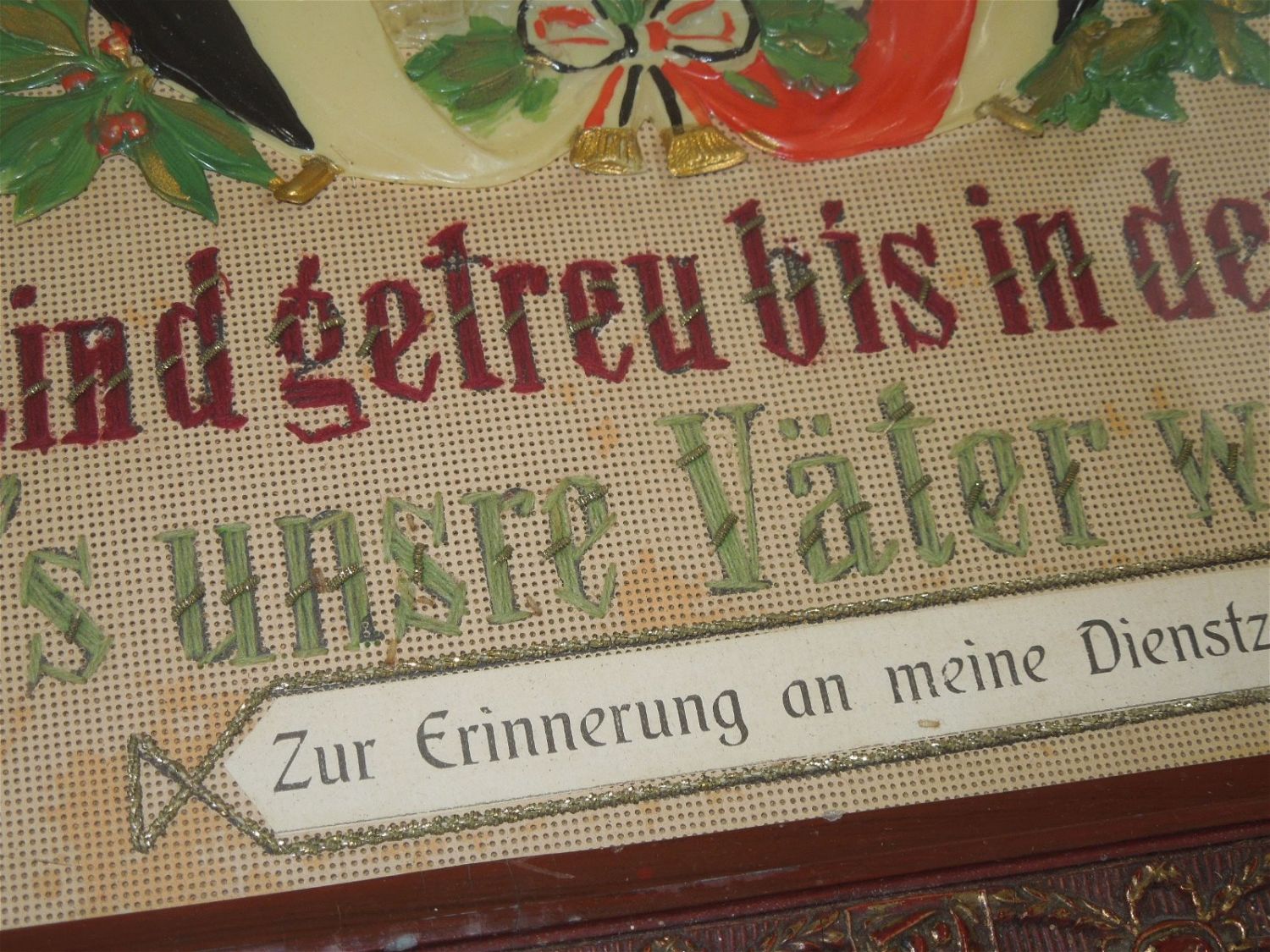 Great pre-WWI framed piece with ornate designed bullion inlay. The frame is detaching from the backing and needs a minor rerpair.