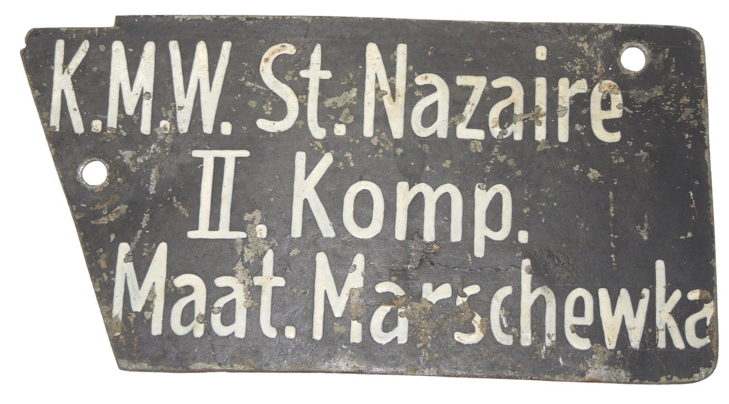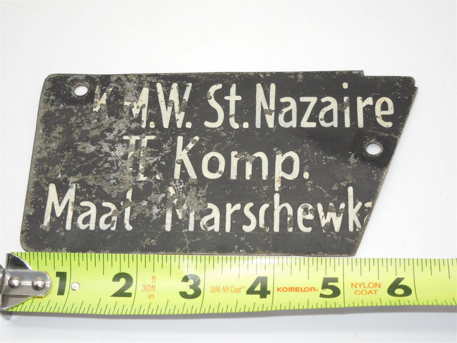 WWII German K.M.W. Kriegsmarinewerftpolizei Naval Shipyard Police at St. Nazairre France Sign. Unfortunately, we are unable to add more information regarding the positive identification of this item. This will make a nice research project for those who know German signs during WWII. Paint missing throughout and a piece of the metal is missing. See pictures for the exact condition.