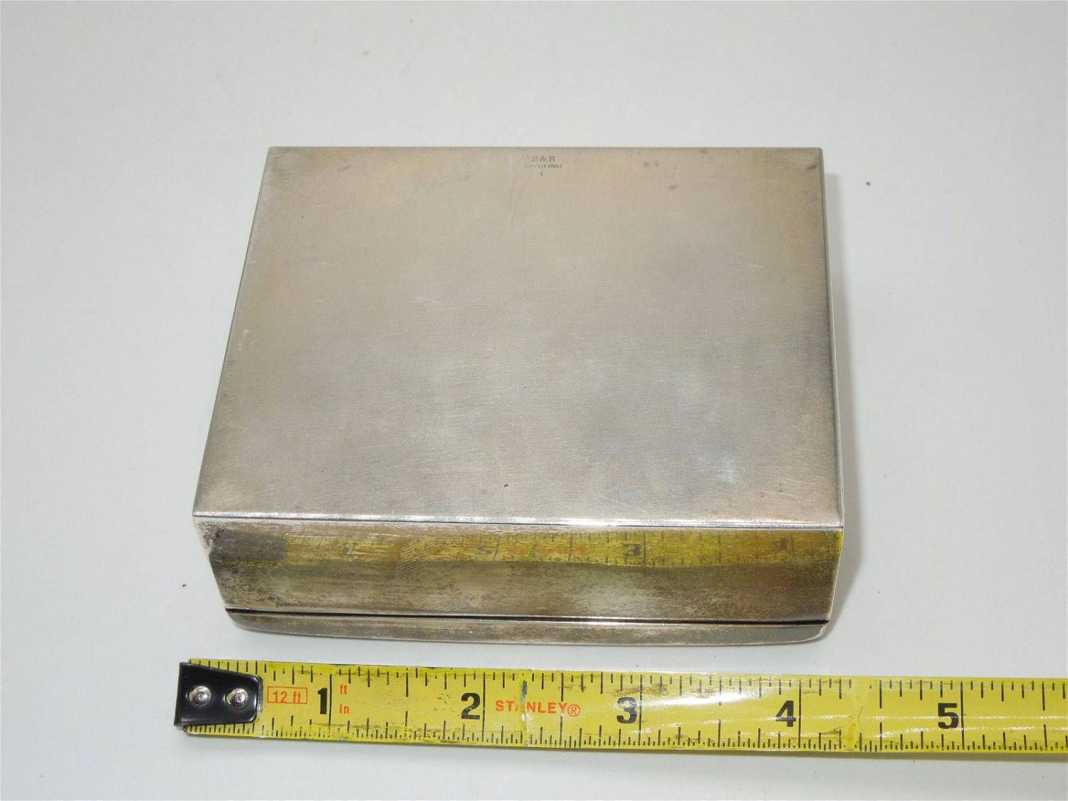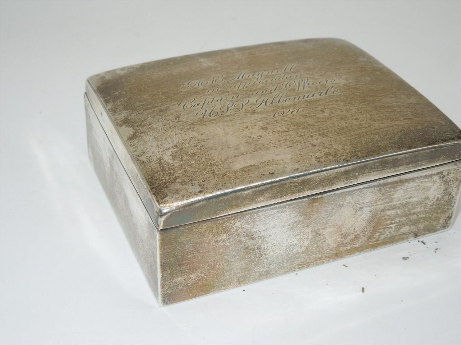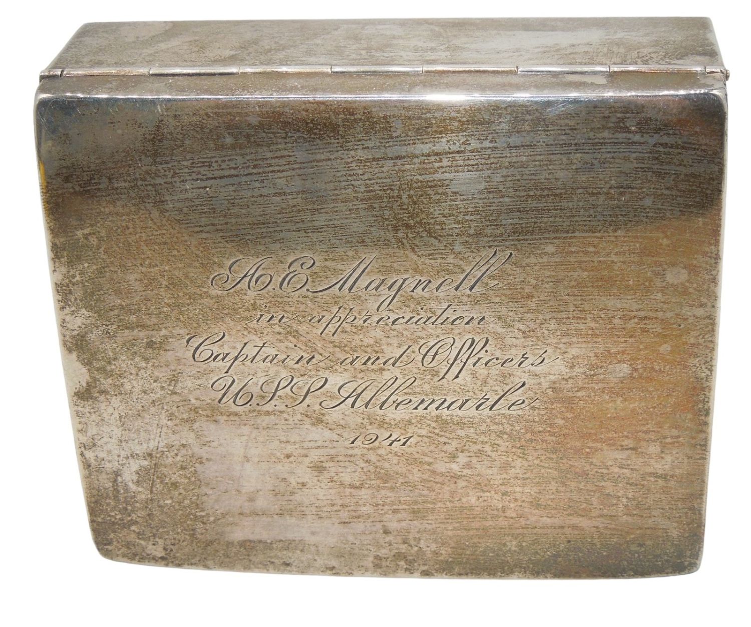 Engraved on the top is A.E. Magnell in appreciation Captain and Officers USS Albemarle 1941. The USS Albemarle (AV-5) was one of only two Curtis-class seaplane tenders. Marked S&S Sterling 1 on the bottom. Approximate size is 4 x 3.25 x 1.5 inches. Good used condition for its age.
